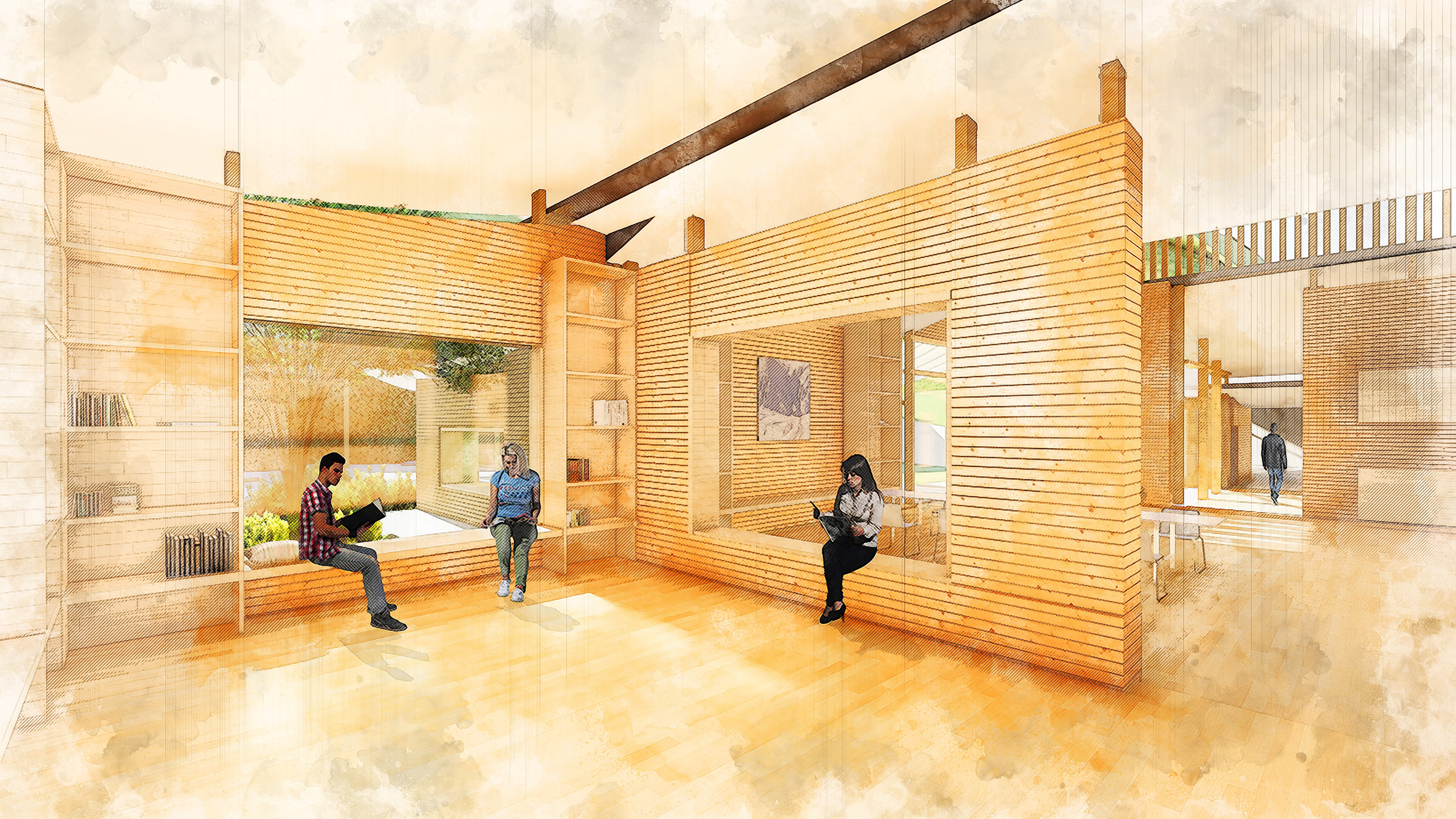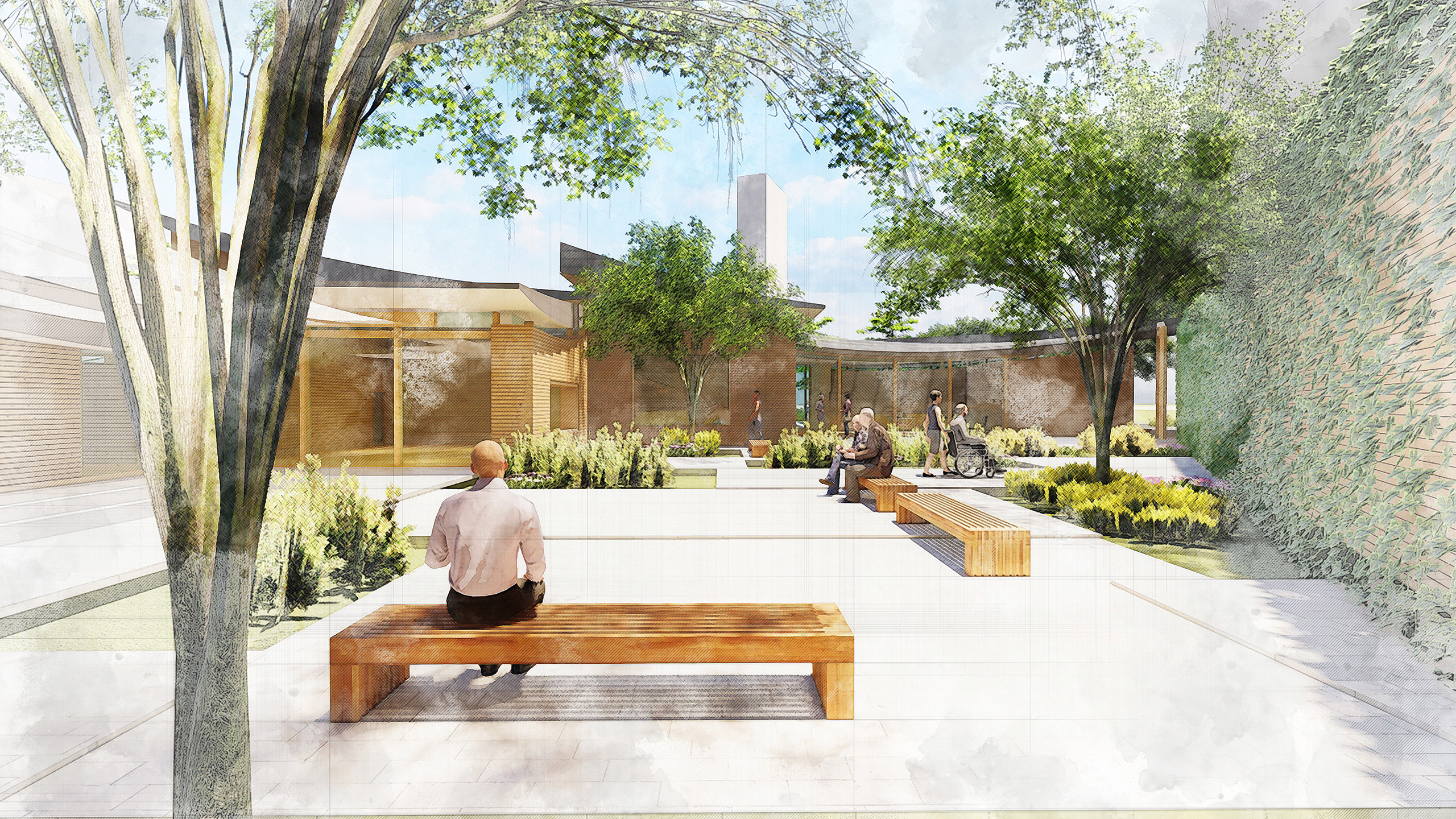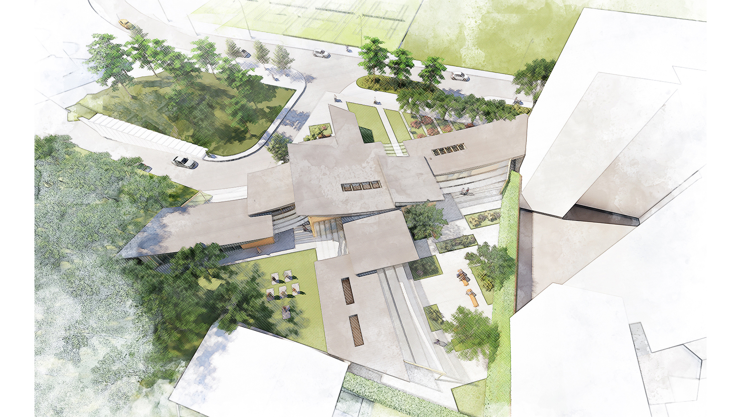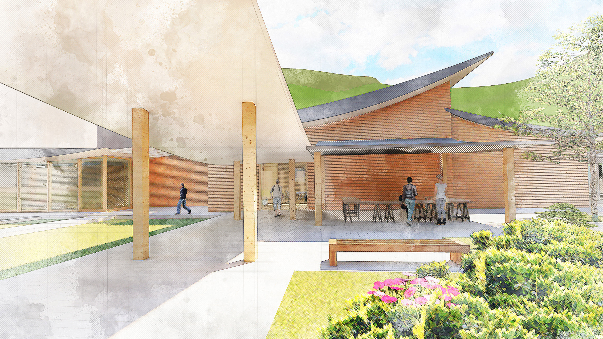 "Shelter of Crossing breeze" is designed for cancer patients and their families. Dancing cross-shaped roofs bring in the fresh air, which embraces the patient's emotional experience. This project also focuses on gathering people while complementing the surrounding nature, creating a warm and cozy space for patients dealing with long-term treatment.