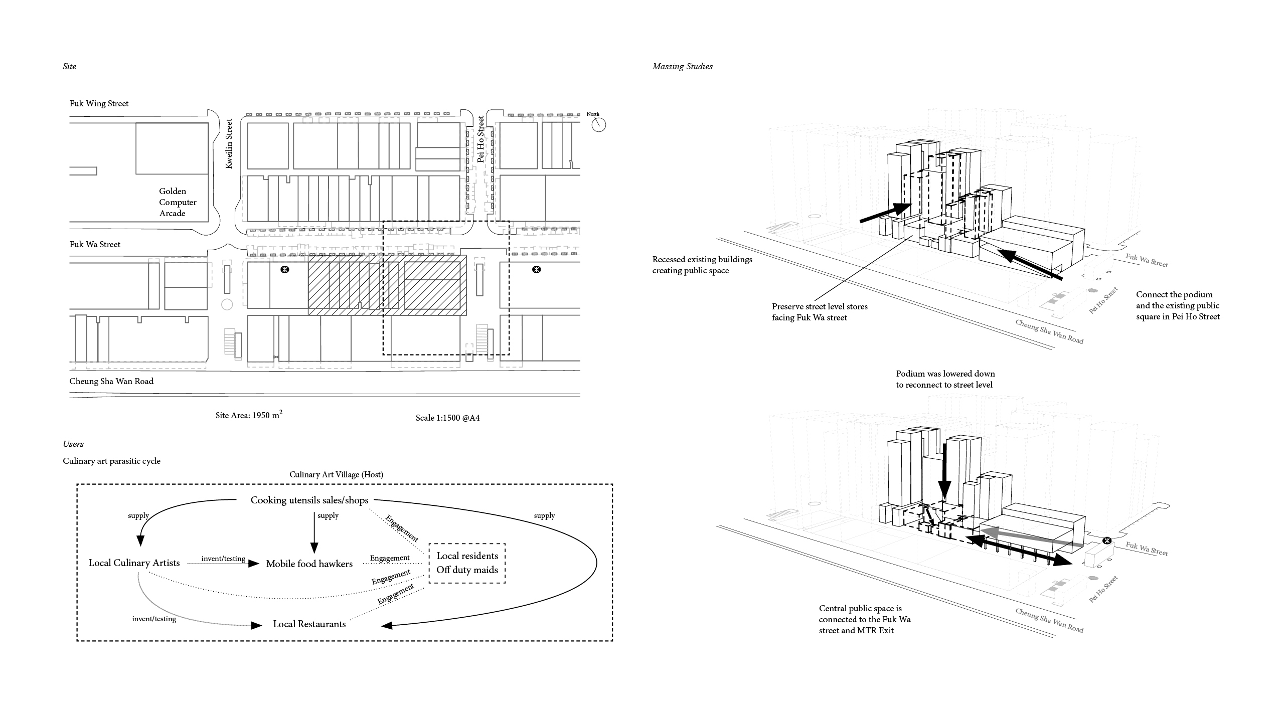 This project investigates the parasitic mechanism being applied to the relationship between local culinary artists and local communities in Sham Shui Po and how they can mutually benefit each other. The purpose of the design is for setting up a new self-sustained community typology in Sham Shui Po.
