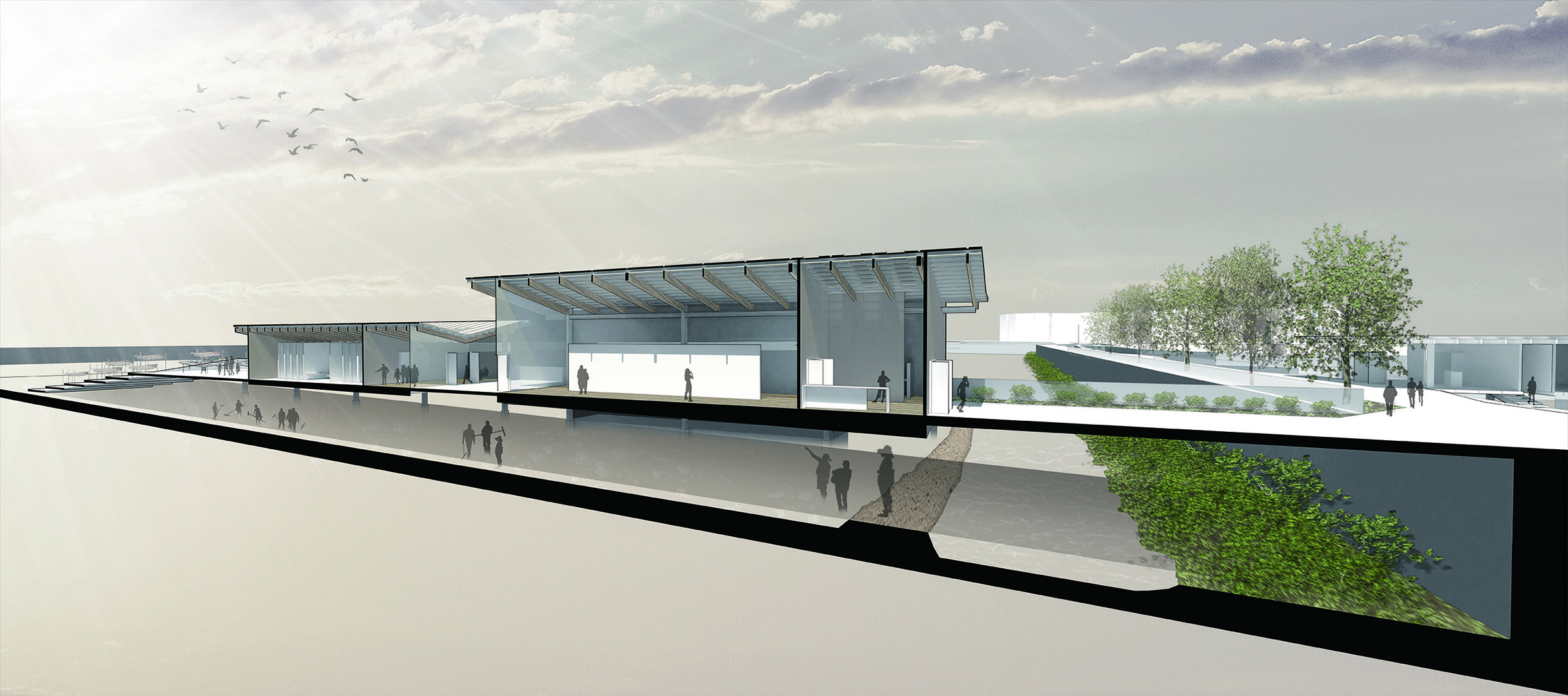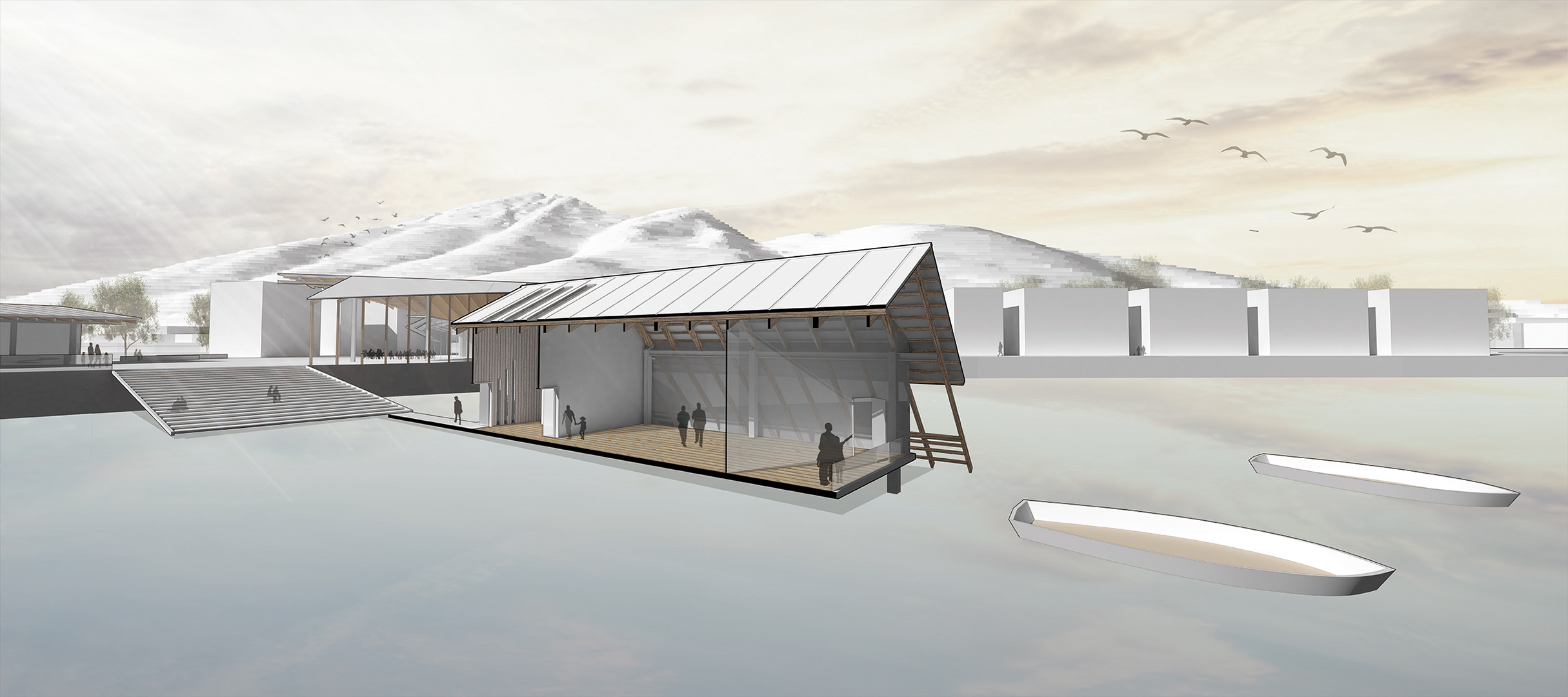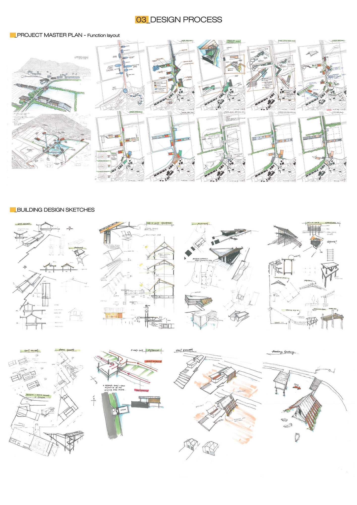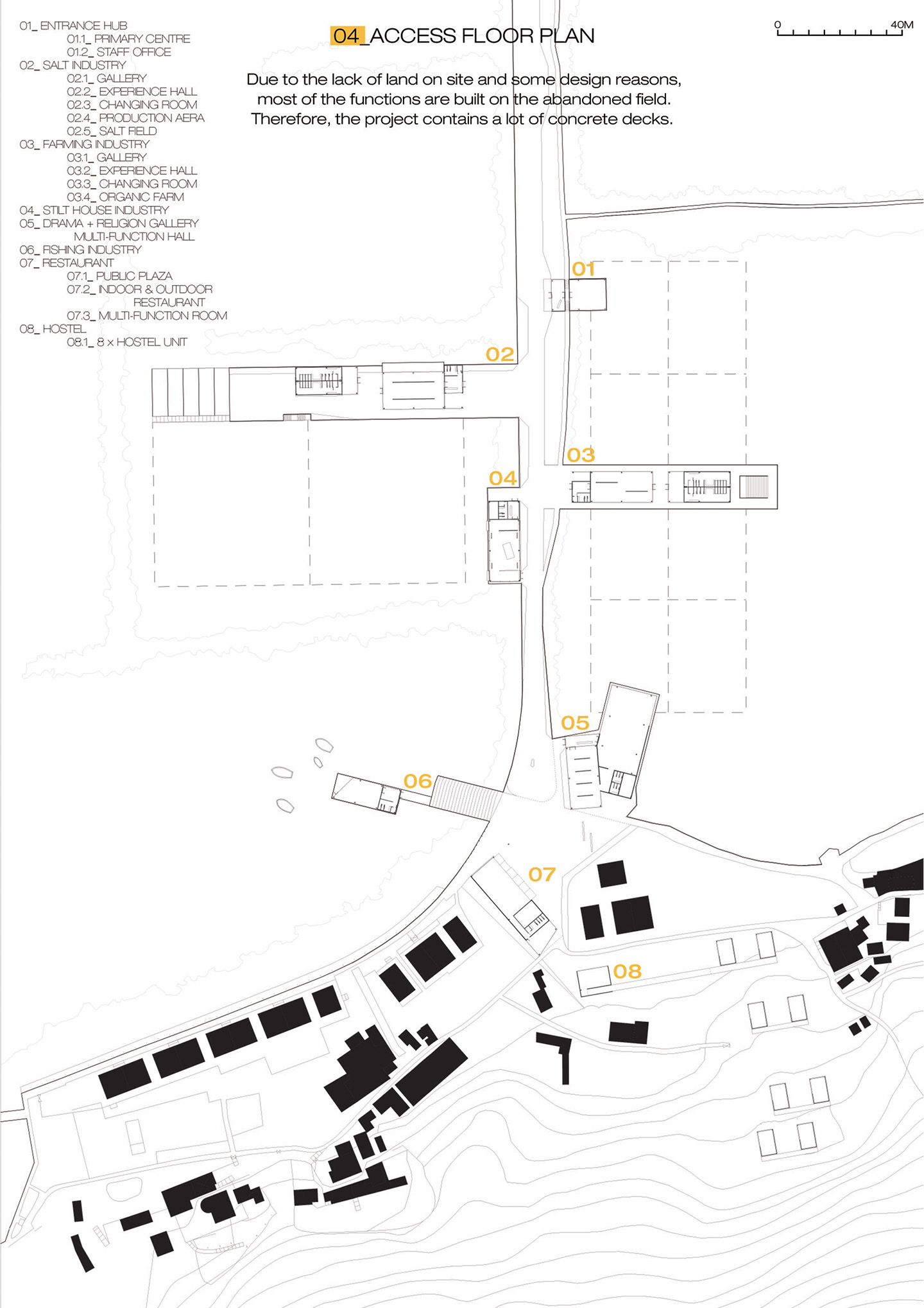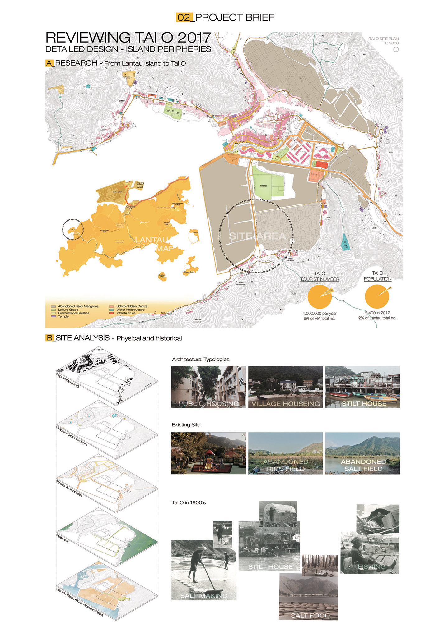 After the research and site analysis, it was found out that most visitors gather at the north side of Tai O where there is provision of commercial facilities. This project aims to explore the alternative identity of Tai O which is regarded to be the true spirit of a self-supporting lifestyle: “Who build, farm and fishing for their own needs”. Also, the second aim is to change the route of the visitors by building a journey to review Tai O from different perspective, including provision of galleries to understand the history of it and passing through the field to experience the old life of local people.