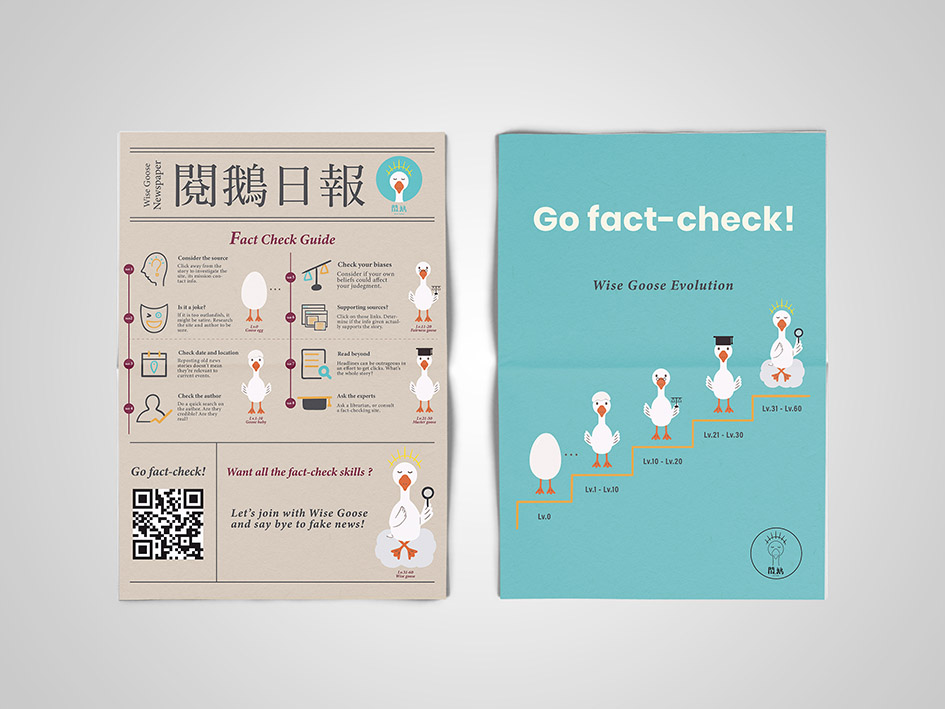 Nowadays, many netizens are misled by fake news and do not know how to combat it. A fact-checked news campaign is therefore organised to let users work together via the Wise Goose app to fact-check news reports. The characters of Wise Goose can draw users‘ attention and to arouse their interest to use the app and enhance their fact-checking knowledge.