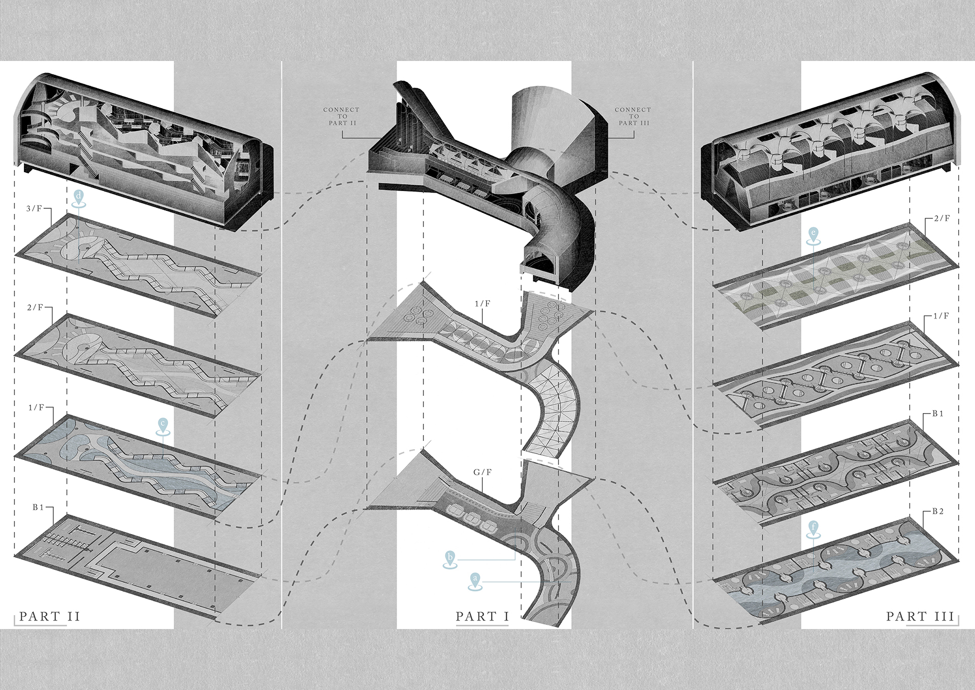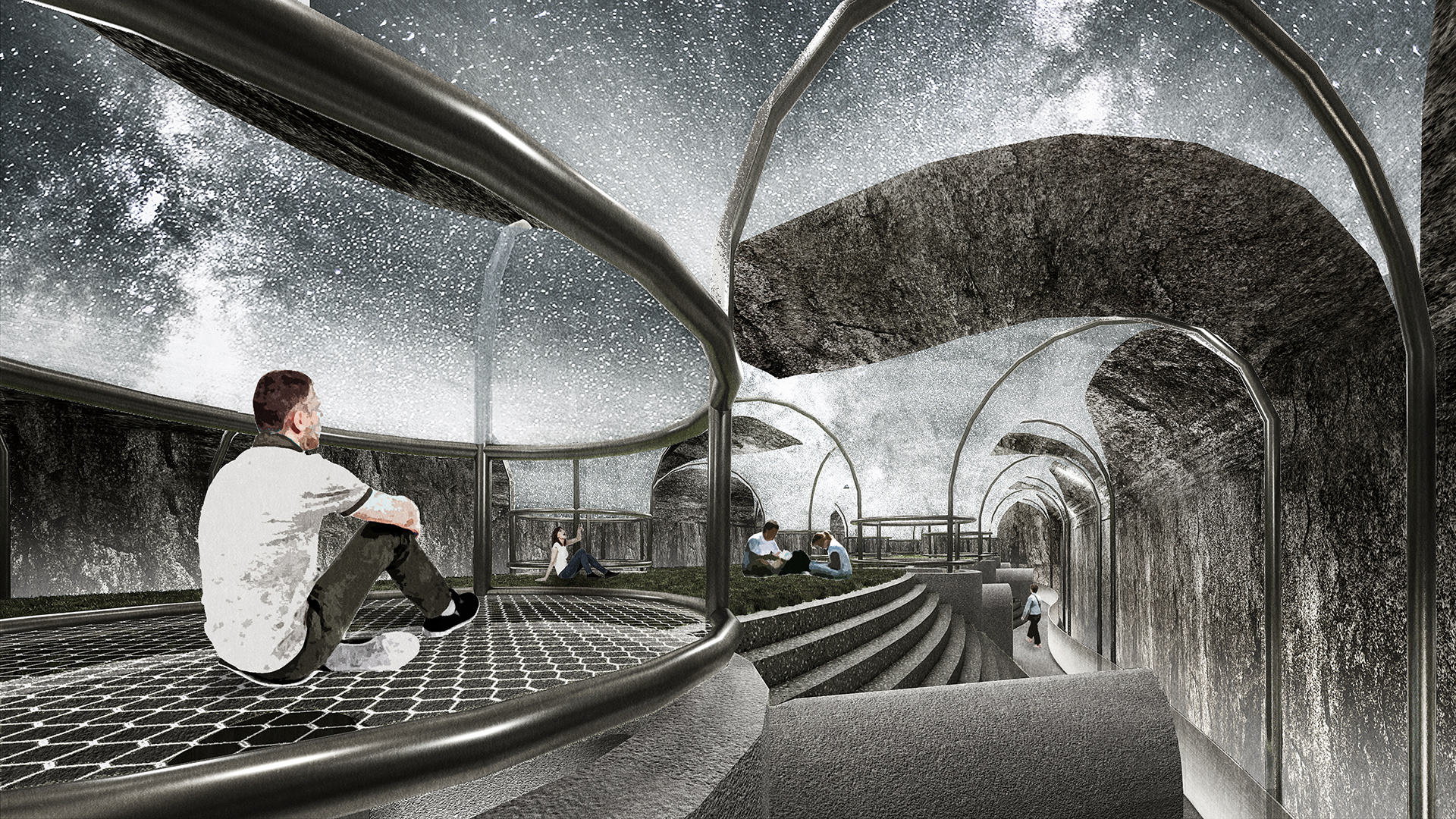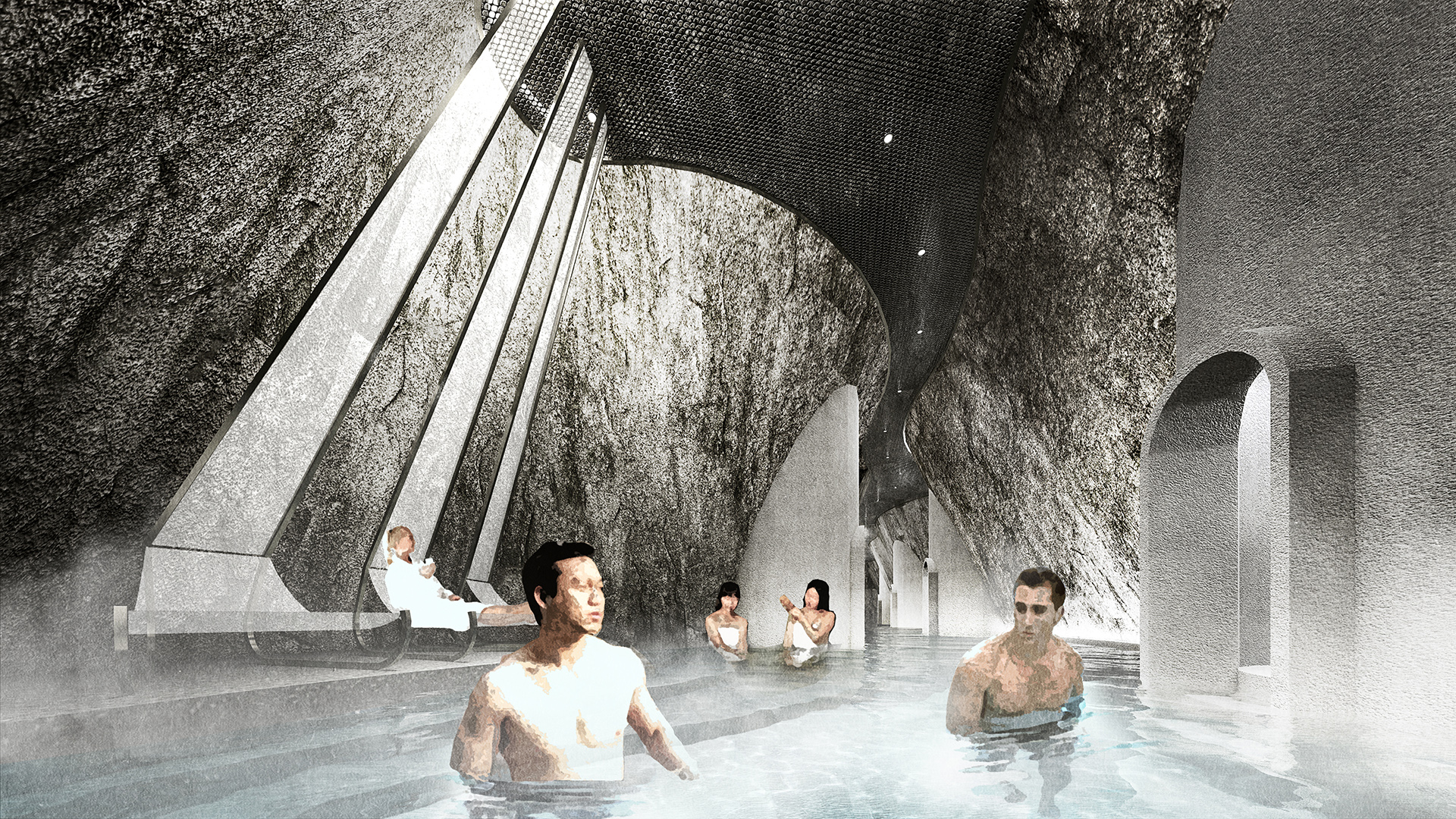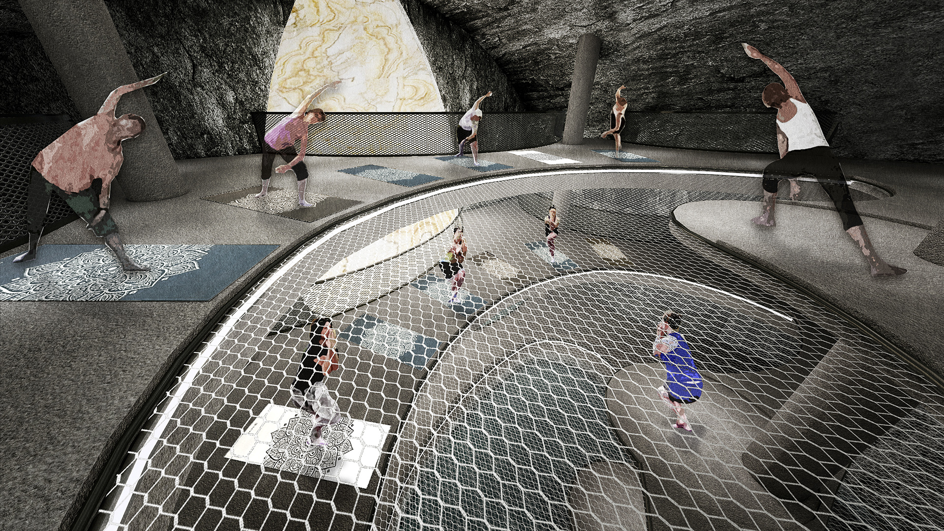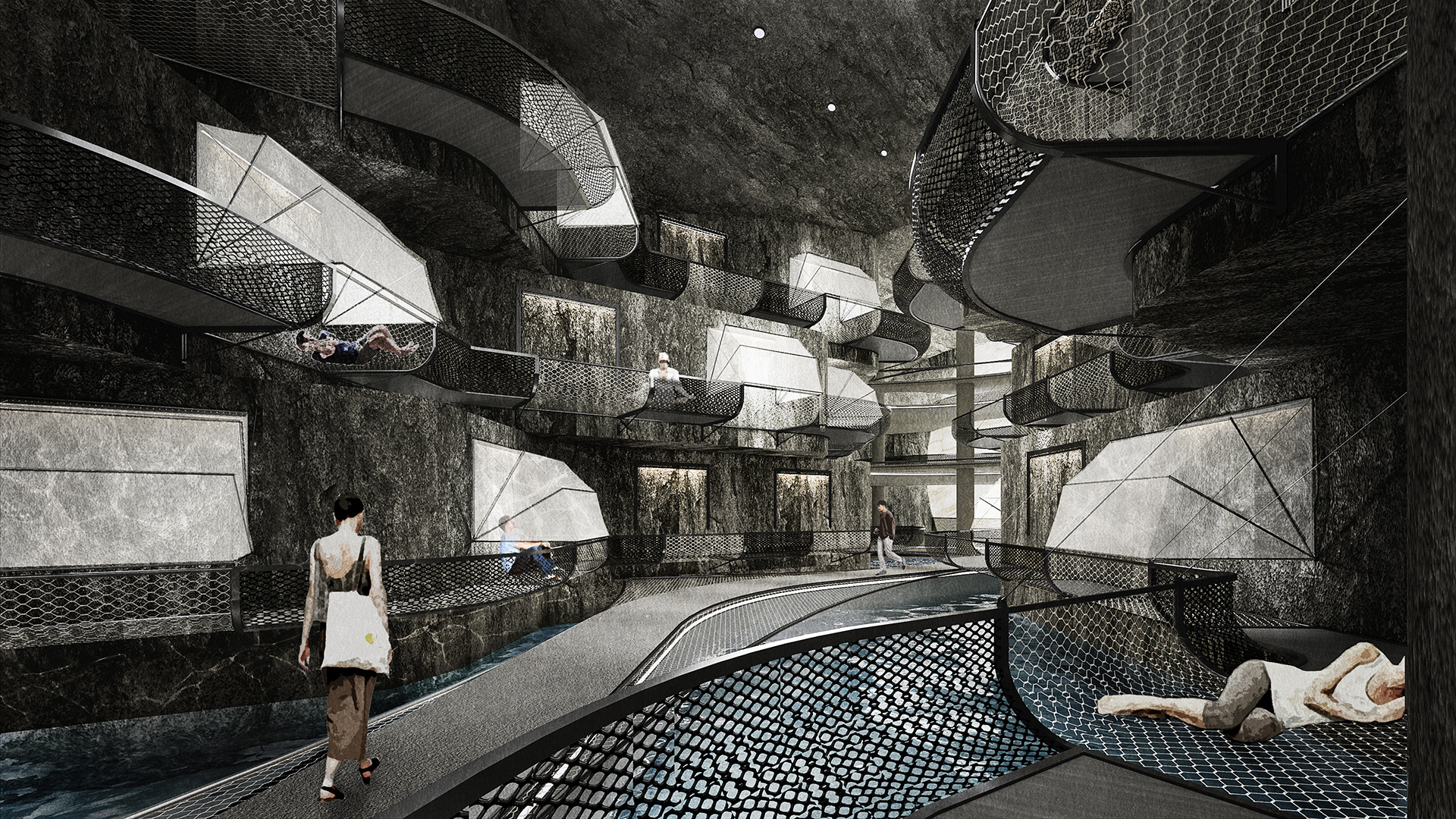 Located in and taking inspiration from the site of the Western Saltwater Service Reservoir, this project focuses on maximum relaxation in a hotel setting. Coordinated within a small picturesque grotto-like environment, customers inhabit the cavernous space through sparsely placed lightweight structures. The spacious feelings of lightness sit in contrast with the natural rocky elements of the cavern.