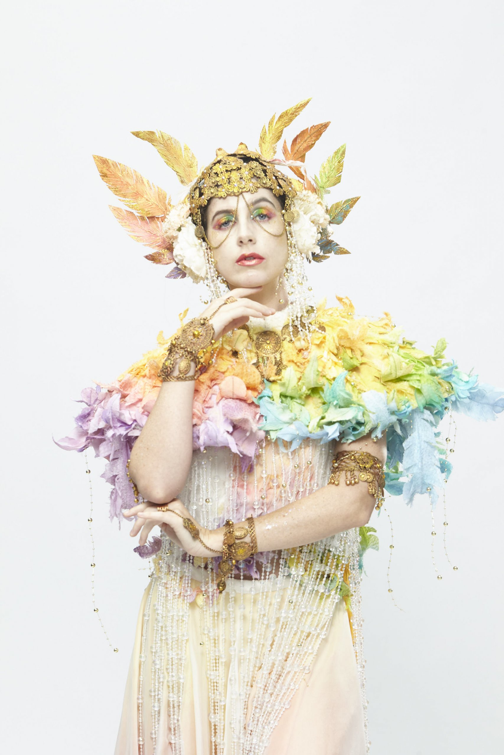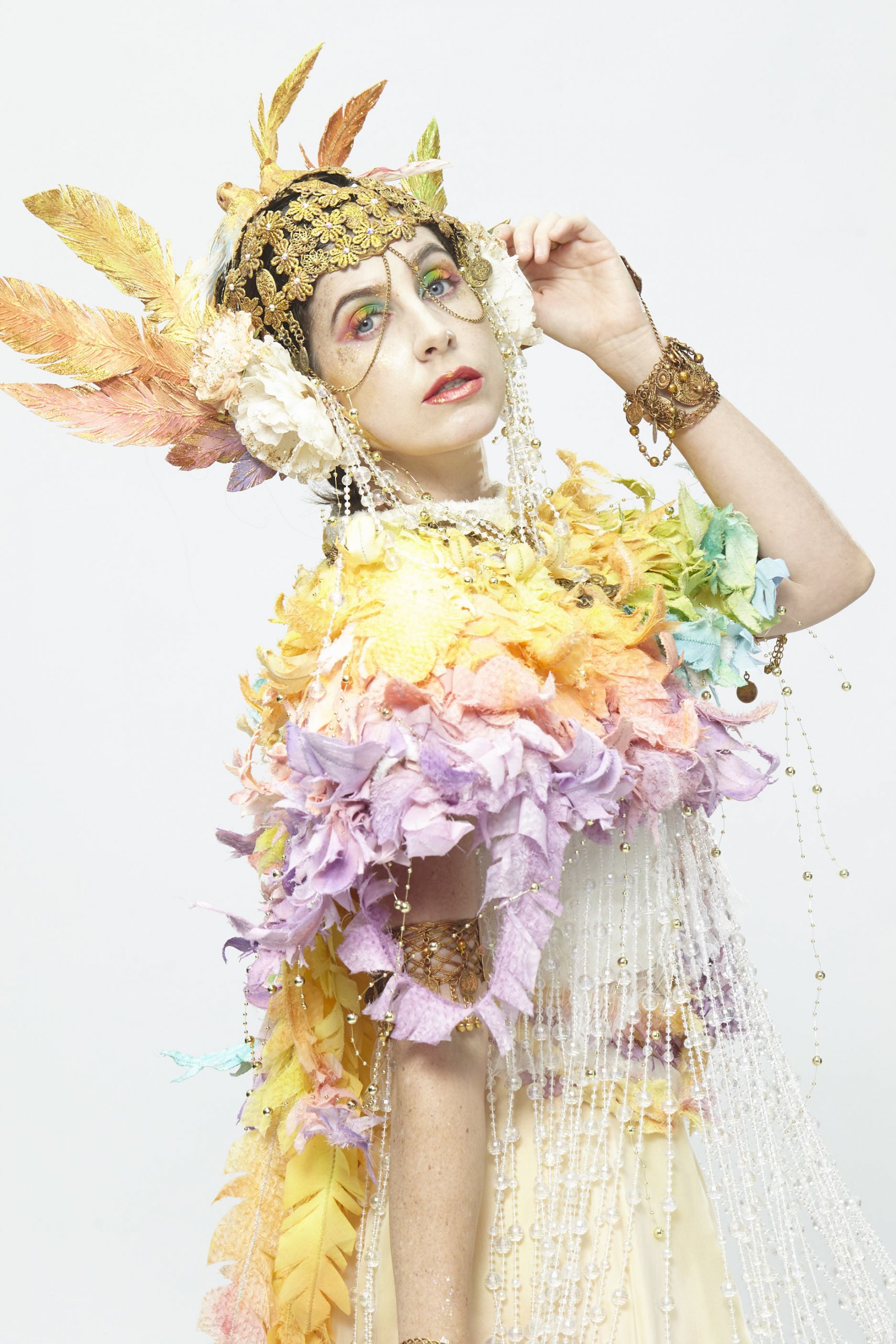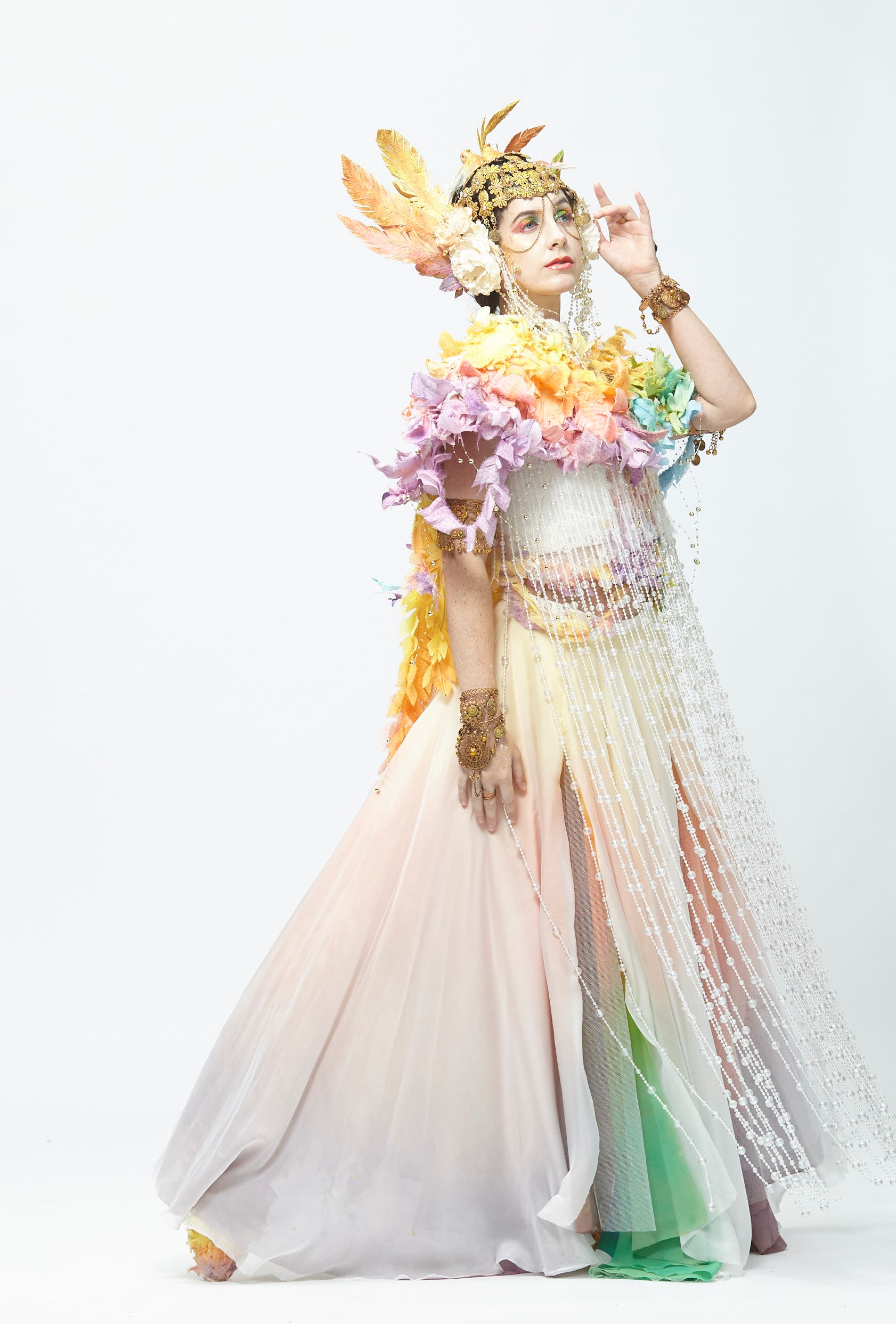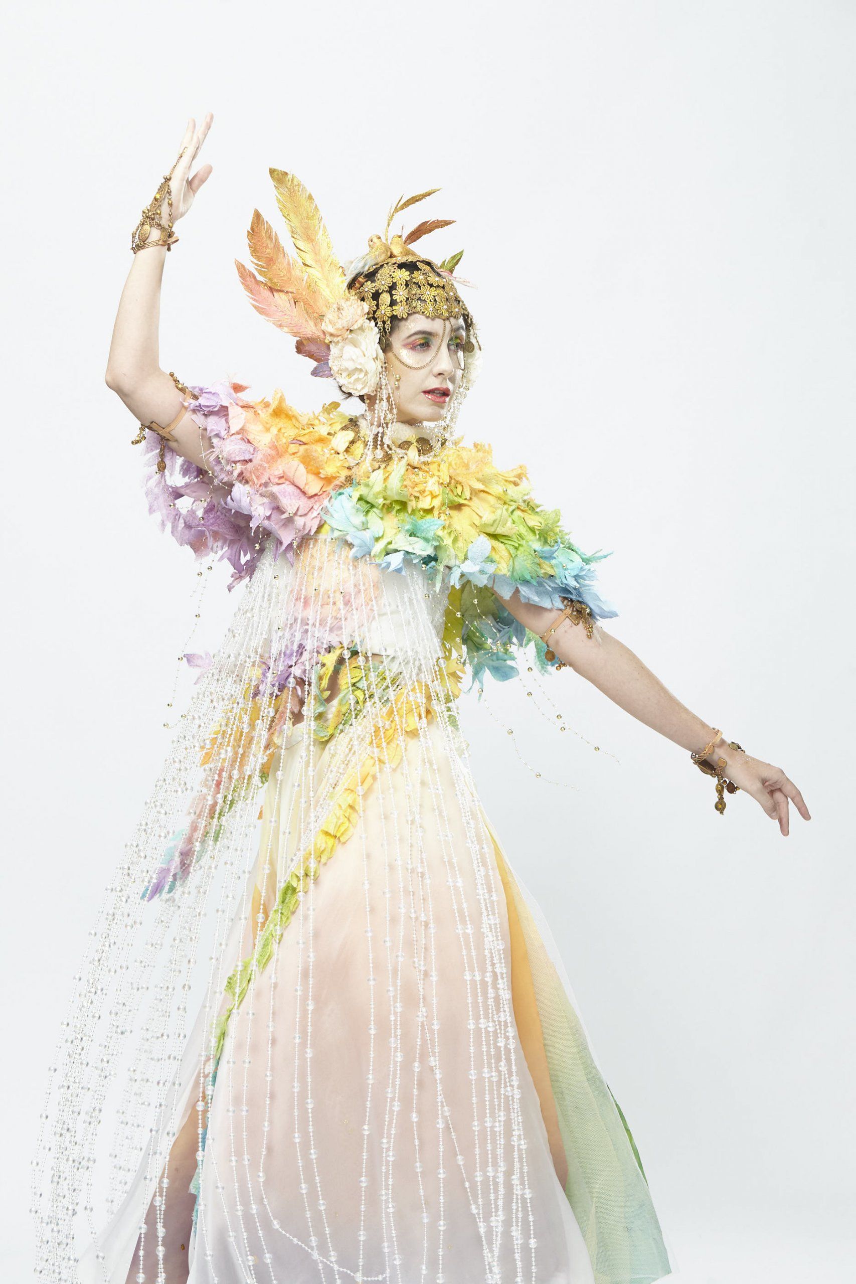 This costume is inspired by “One Thousand and One Nights”. The story is about the Arabian Princess dreams of the male bird caught into a trap that was set-up by the bird hunter. The female bird destroyed the trap and saved him. On another day, the female bird was also caught into a trap, but the male bird didn't save her. But the truth is, the male bird was shot by the hunter when he went to save the female bird. For the female bird costume, I applied bird elements and different texture fabrics and colours to represent the character of the female bird. The Sumerian and Neo-Babylonians accessories also inspired me to create a crown and bead chain to show the noble image of a princess and dynamic through the dance.
