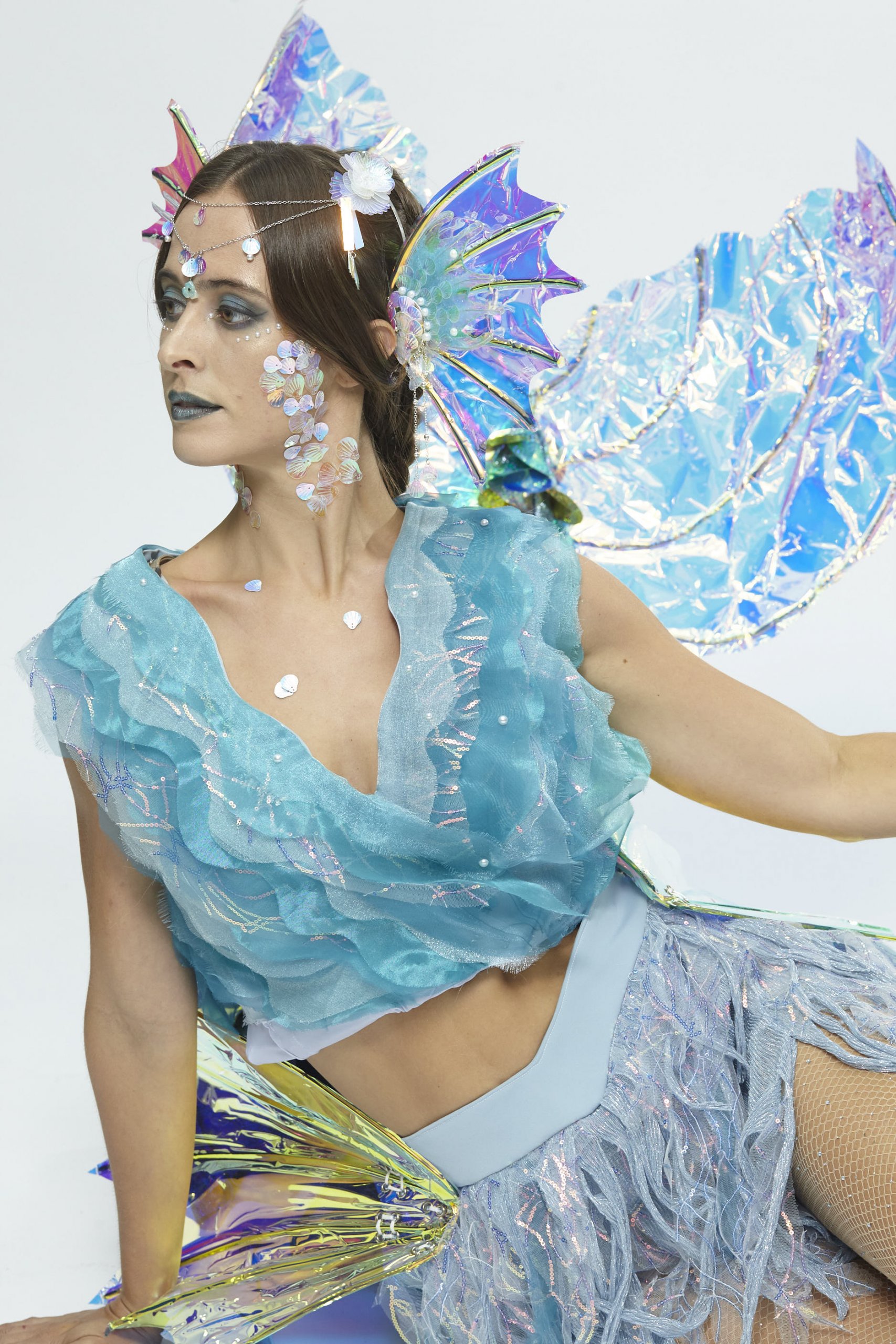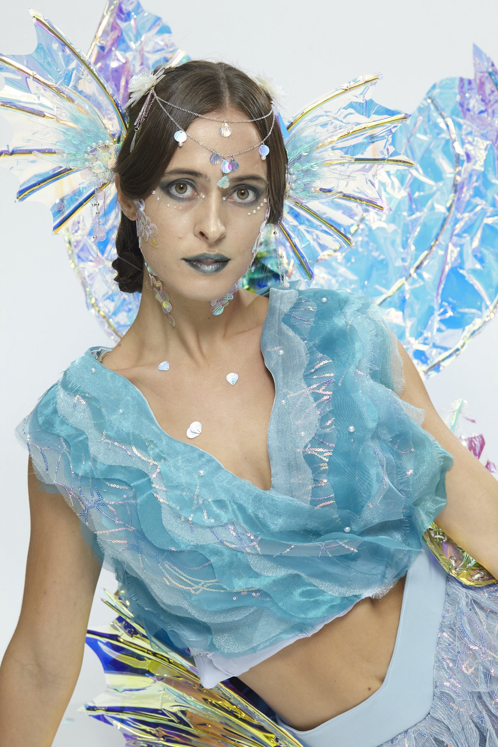 “Kun Peng” is a divine beast in ancient Chinese mythology. It is the incarnation of “Poseidon and Aeolus”. Its shape is very peculiar, like a combination of fish and birds. The body is huge, with a feather as long as a human arm.The design is inspired by nature, referring to the wind, rain, and waves in nature that incorporate these elements into the design. Based on the tails of fishes and claws of birds to demonstrate the shape of Kun Peng, and it was anthropomorphically transformed into a goddess that can control the weather and the ocean.