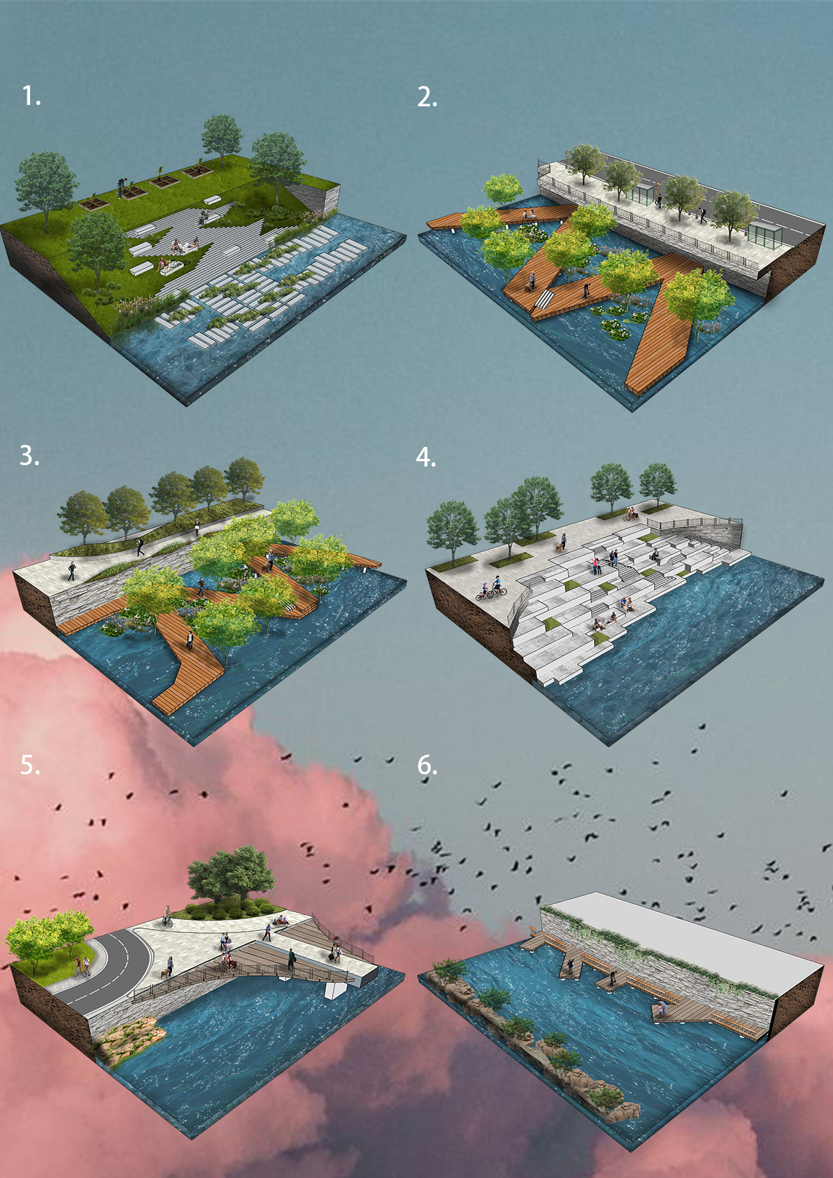 Kai Tak Nullah breaks the district into two communities. I want to increase the connection between the two communities through design. Since the problem of river water pollution has solved. The river has the opportunity to be more playful and exciting to promote a much healthier living style to the communities. Many residents like to fish from the river. Children would run and play freely on both sides of the river. It can also connect the land culture on both sides to extend to the water to form a unique landscape. This project can make all this possible.