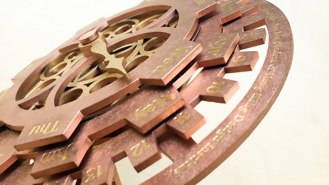 In terms of design, it adopts the steampunk style of London, which was originally a round clock face and then changed to the classic steampunk gears. In terms of structure, every gear and pointer can be rotated except the base, and can be recycled and reused continuously because the year is not in it, which is indeed in line with the design concept of environmental protection.