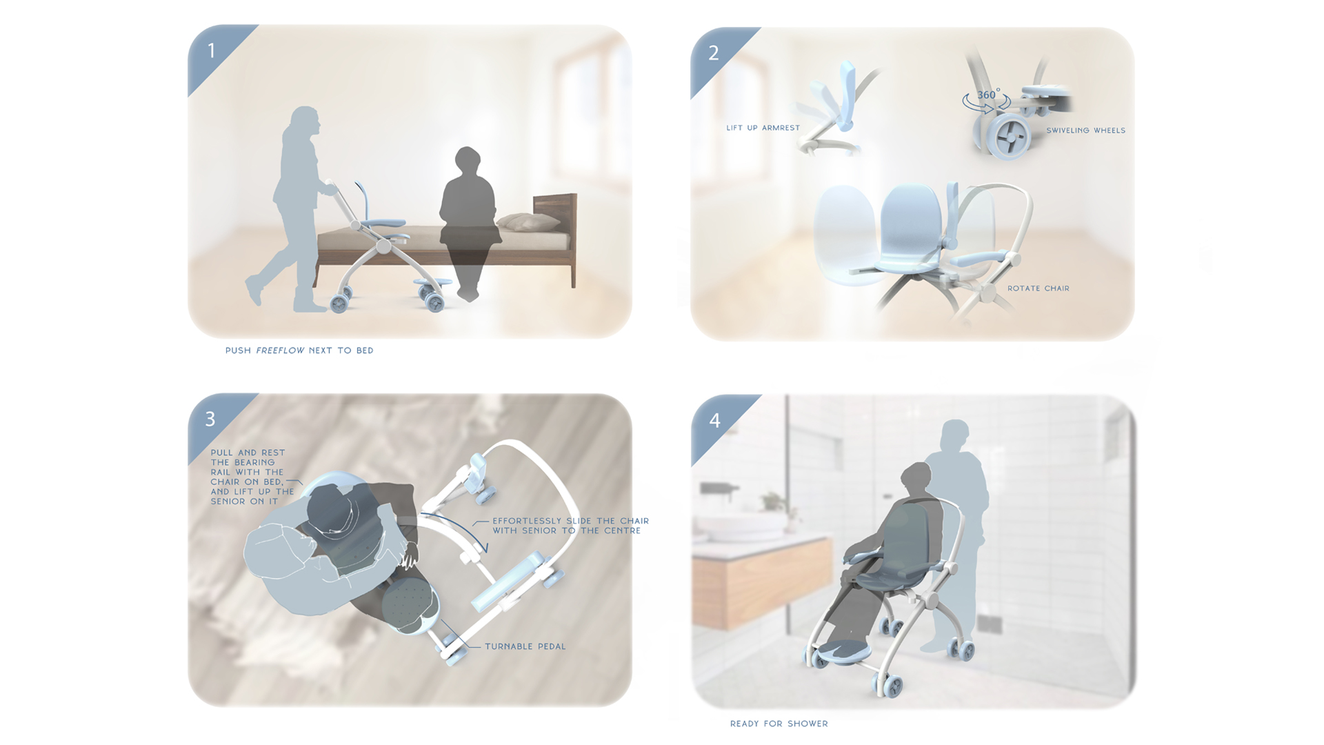 The aging population is a challenging issue of our time, and it is demanding to provide daily care to an aging loved one. FREEFLOW is a bathing chair that helps to transfer a physically weak individual from their bed to the shower smoothly and easily.