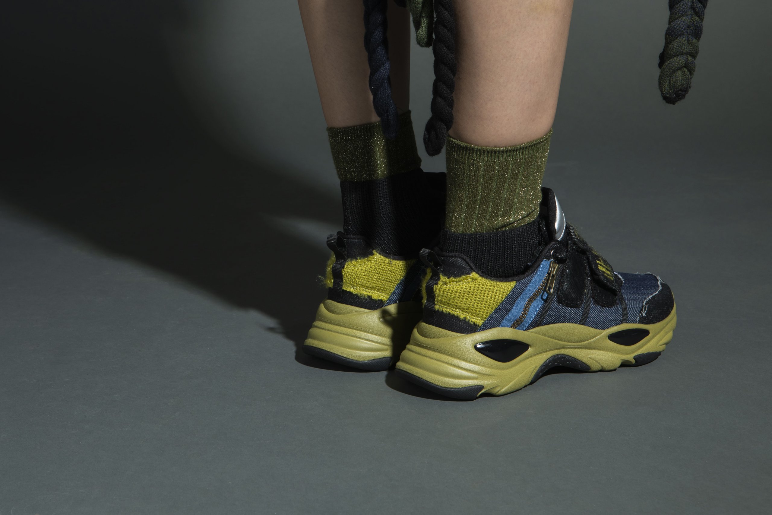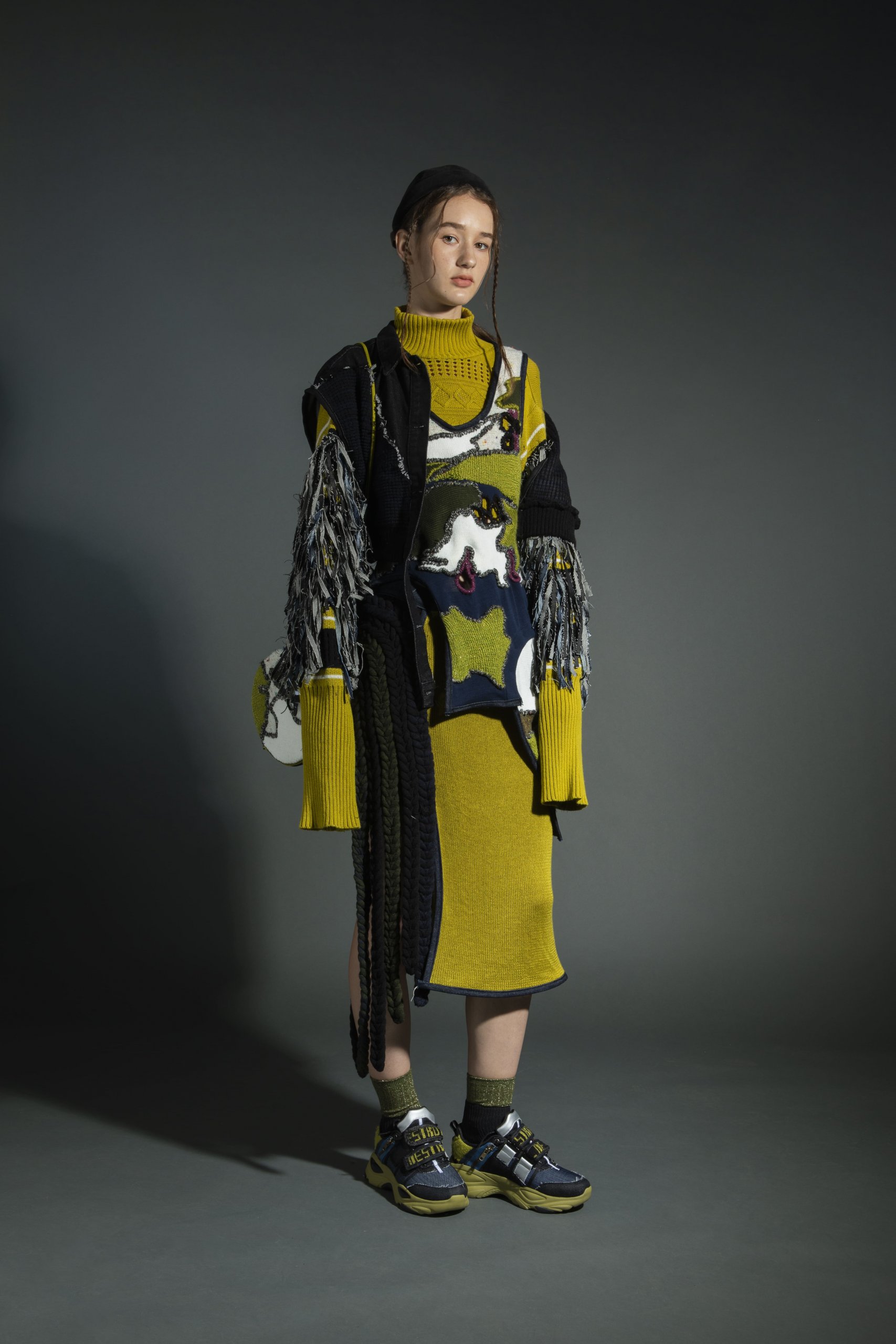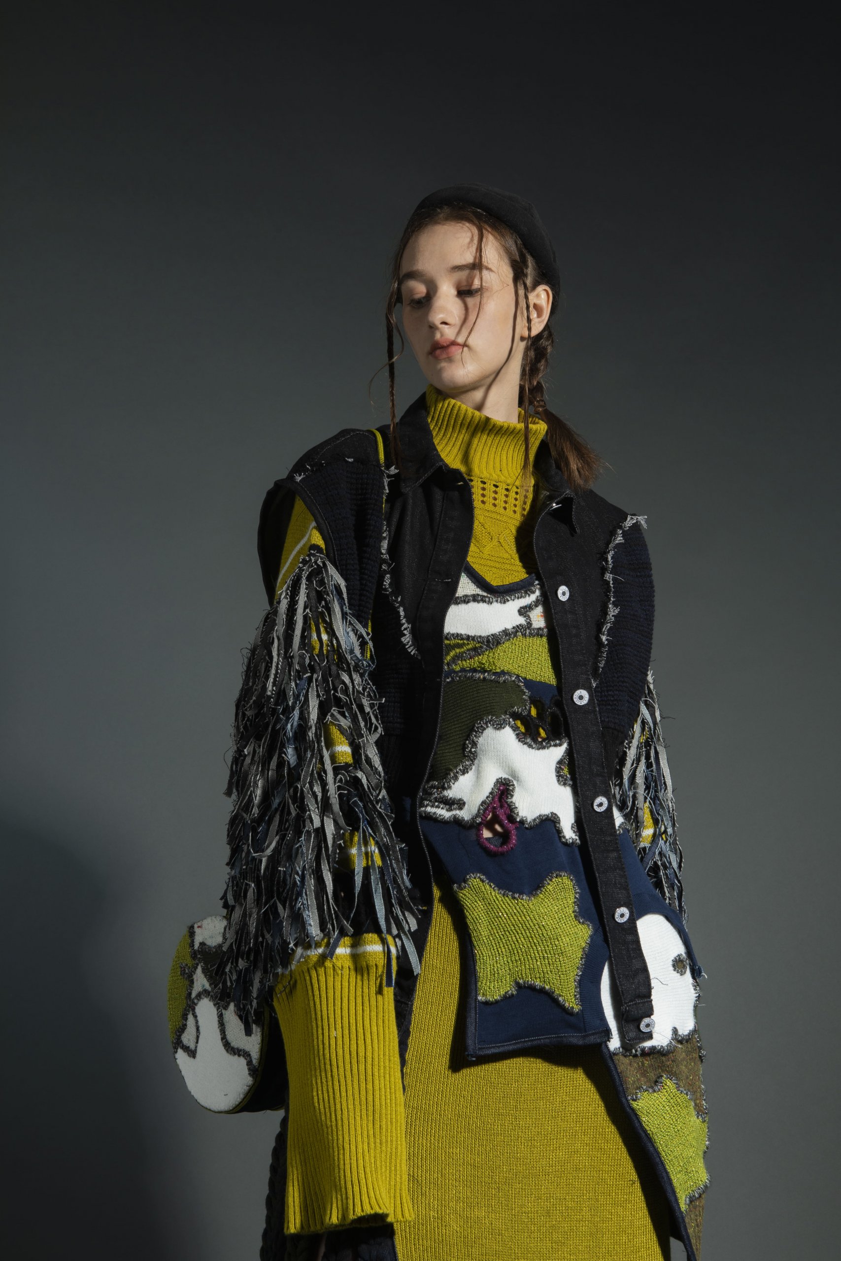 The current pollution problems that have resulted from fast fashion are becoming more and more serious. They continue to destroy the global ecological environment. Through the theme of ‘Behind The Color’, I hope to arouse people’s attention to the pollution problem of the fashion industry through recycling and reconstruction of old clothes. Dirty olive green and dark blue were chosen as the main colors to create a “dirty & used” feeling. Through the collecting and reusing of abandon swatches from the school workshops and then embroidering them into my design, I hope to highlight and depict the dark and harmful elements behind the perceived glamorous fashion industry.