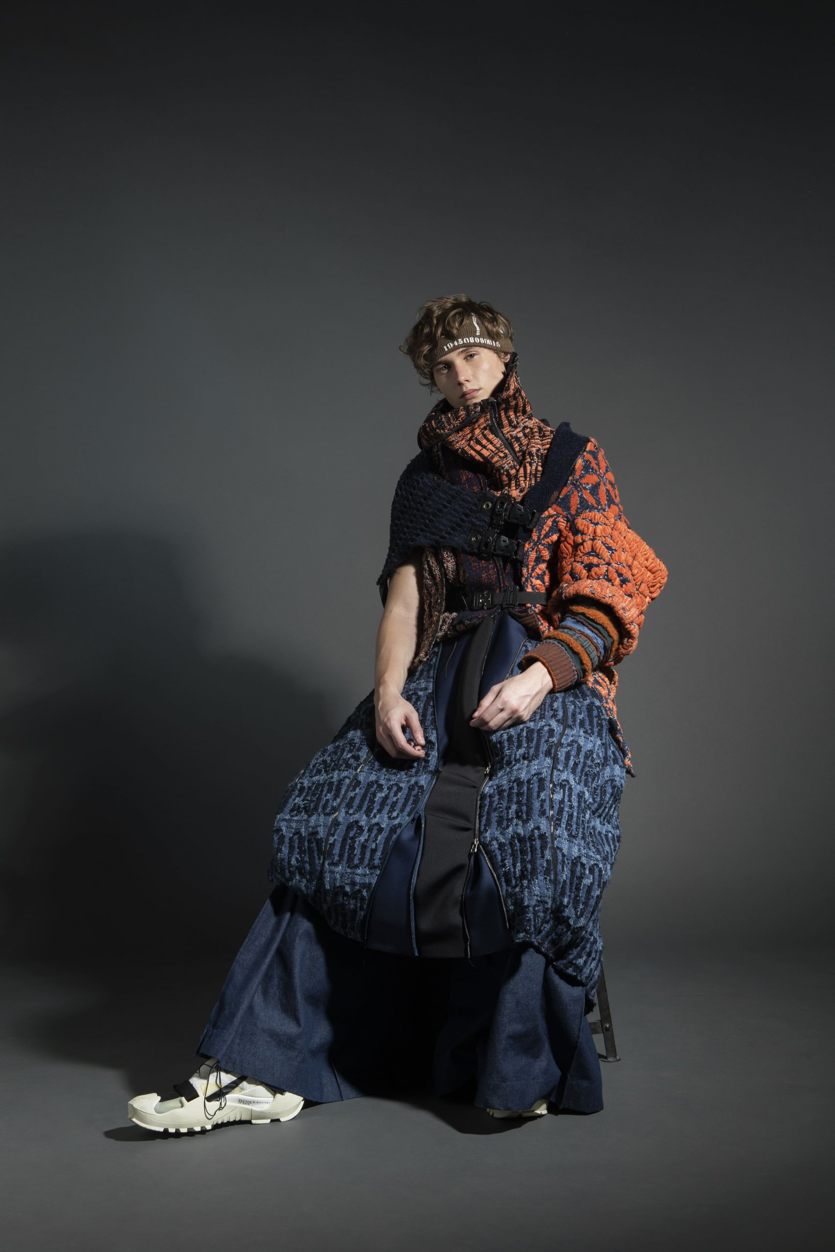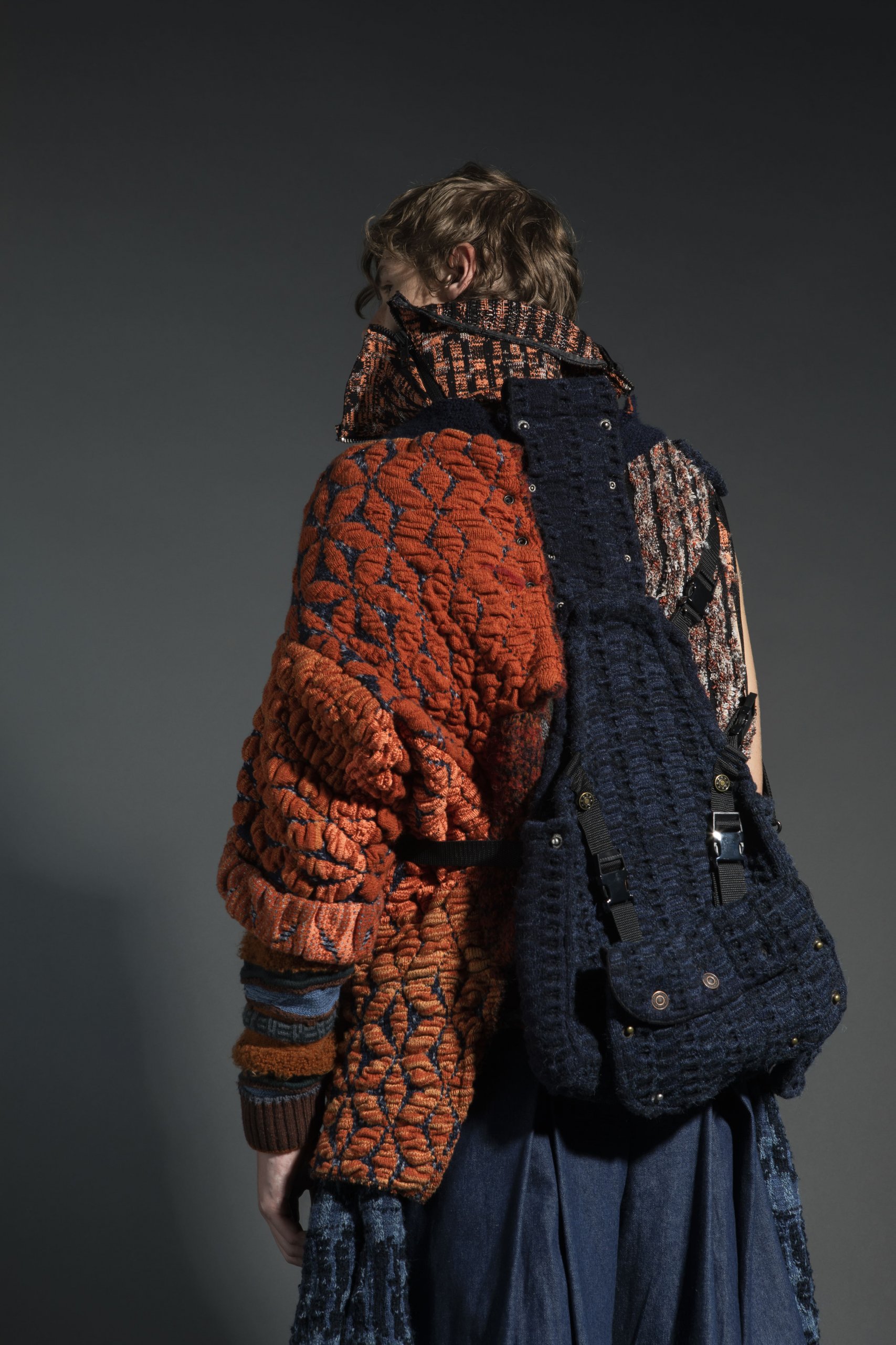Knitwear usually projects a feeling of softness. Through the theme ‘CYBERPUNK’, this collection hopes to combine the characteristic of knit with enhanced functionality in the form of detachable parts that could be used separately. The 3-dimensional knit structure and pattern in contrasting orange and blue colours, reflect the use of advanced technology and the demolished society in the CYBERPUNK world.