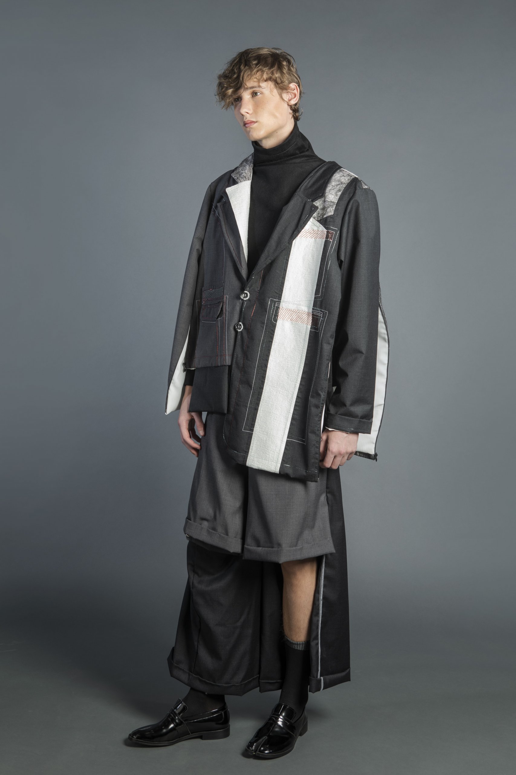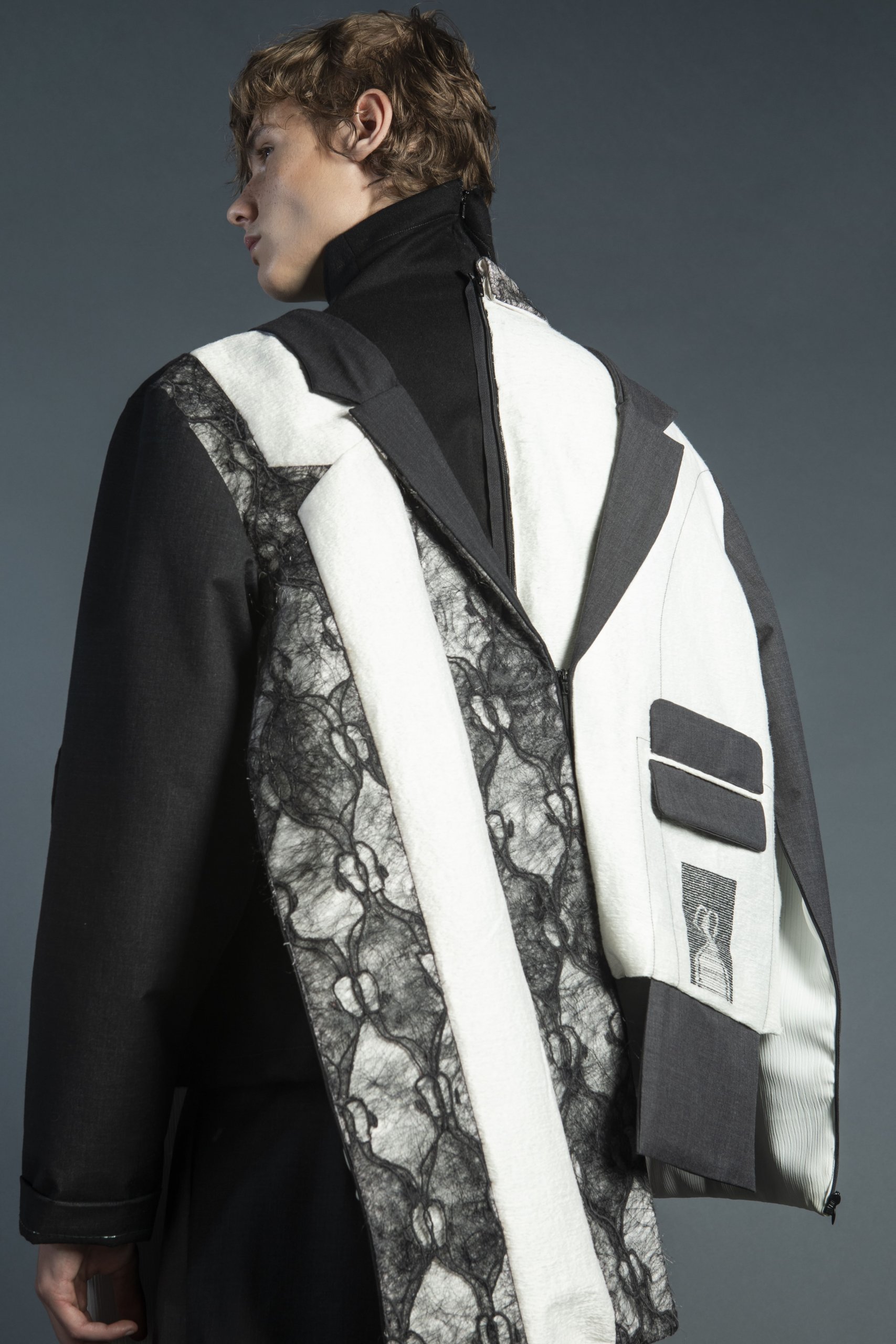 The collection is inspired by the mystery story of ‘The Silent Twins—June and Jennifer Gibbons’ and several pairs of twins friends existing in my life. By embroidering lines with rubber threads in red and blue and overlapping mesh, the design shows the struggles of twins in different characters and how they accept each other by merging or devouring process which executed through embroidery and interesting cutting on my outfit.
