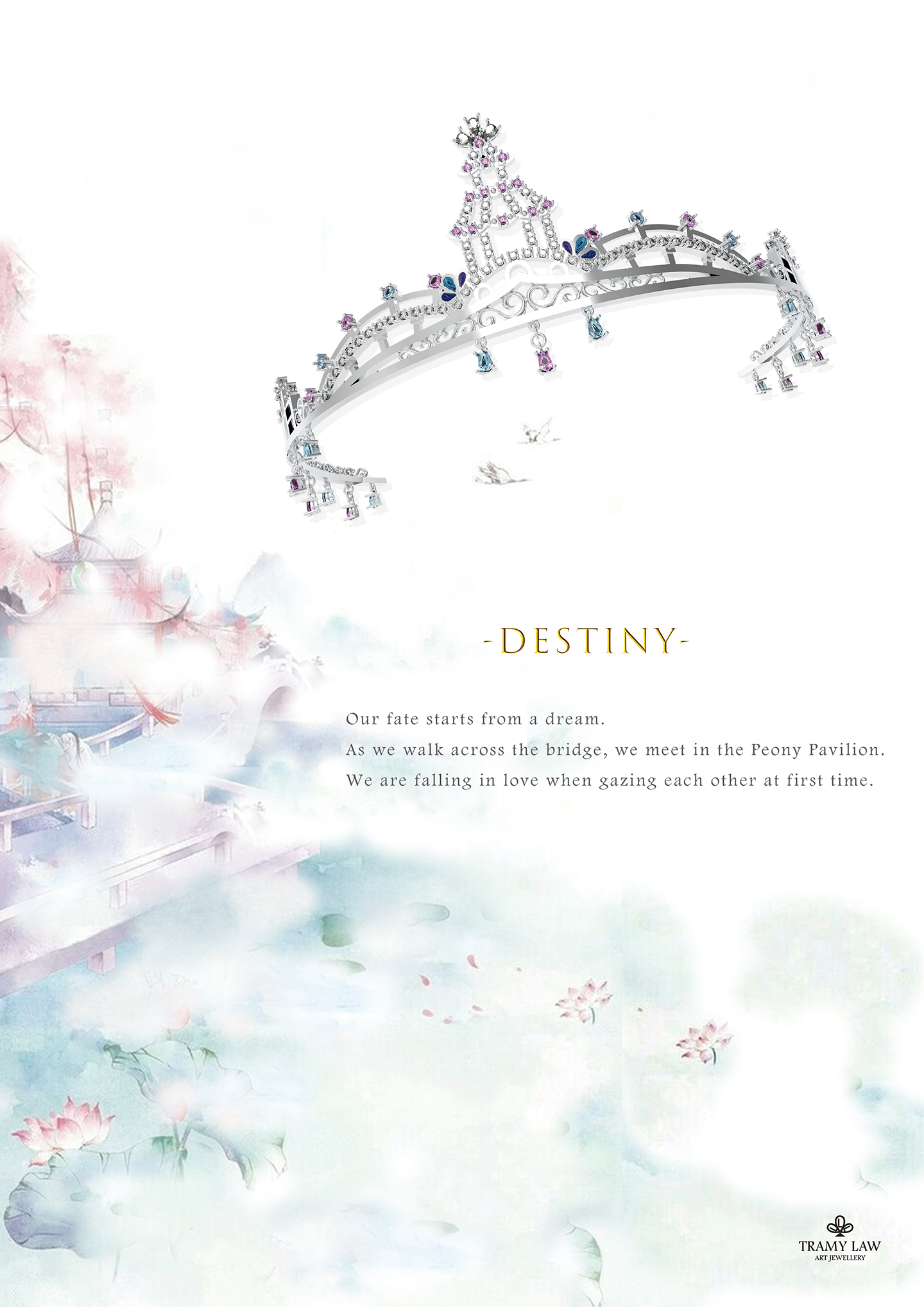 Inspired by Cantonese Opera "Peony Pavilion". It presents the scene of a Chinese classical woman falling in love with a man. I wish for the greater public to understand intangible cultural heritage-Cantonese opera. The focus is on the crown and hand fan. “Tuanfan” is an affectionate thing. They usually write their romantic story on it.