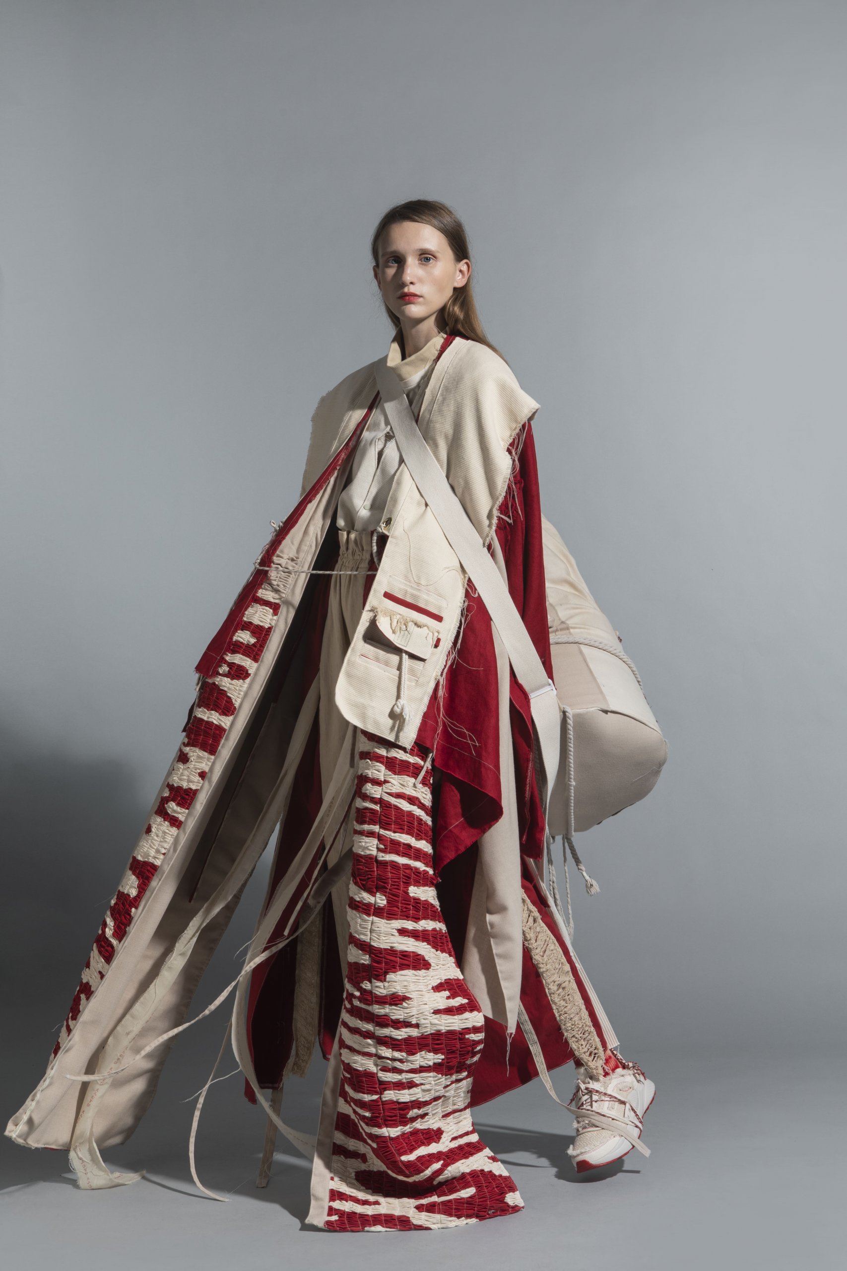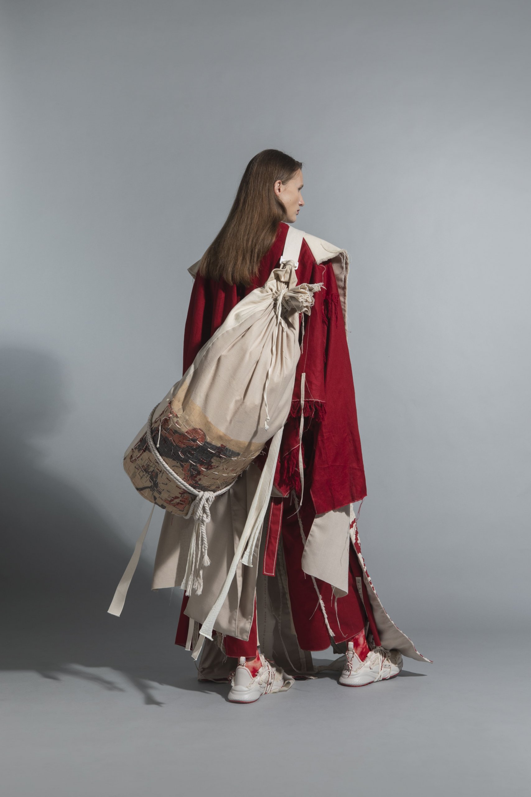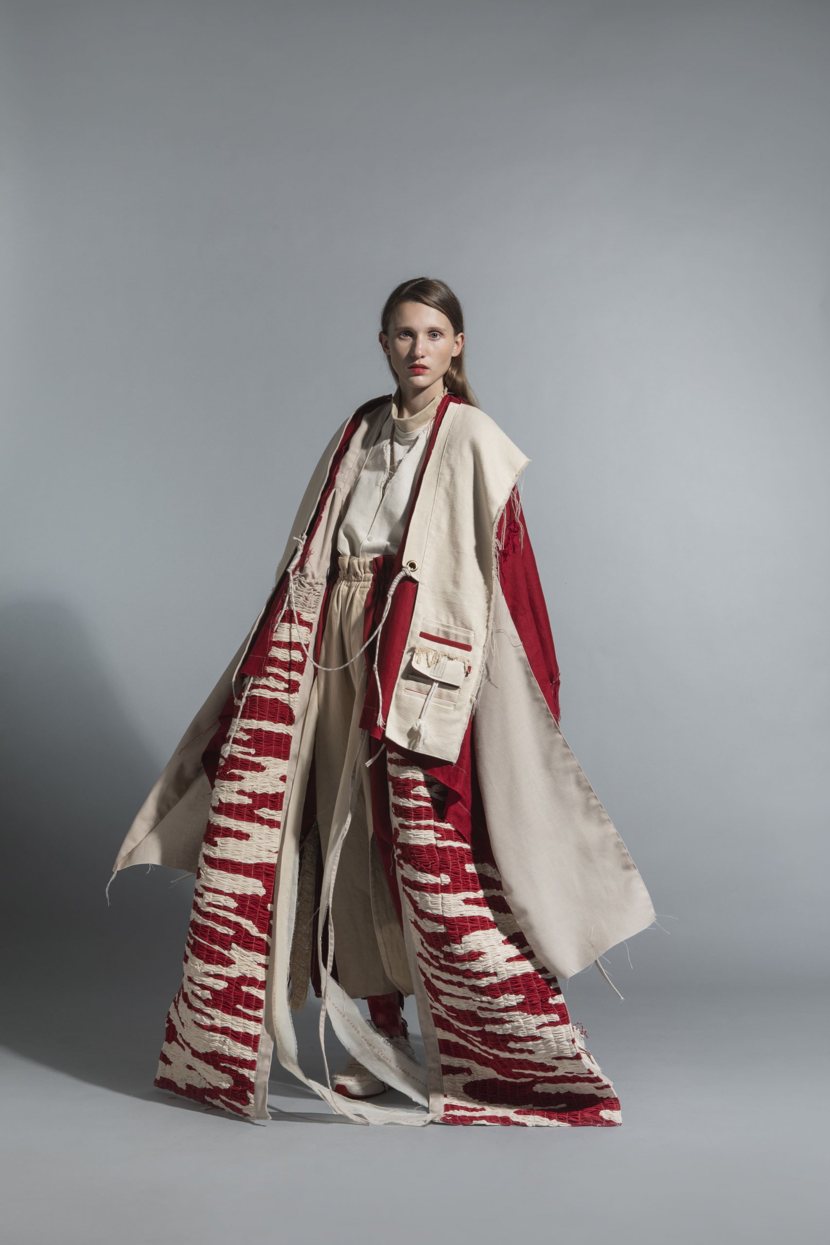 Musubi, the Japanese word for a knot has the meaning of connection. My design collection is about the integration of culture into fashion, with emphasis on traditional handicraft details that connect people and society. Traditional handicrafts and tying techniques such as bundling, weaving and tangling are materialized in my collection as I hope to convey a message of bonding between people of different cultures and to promote the preservation of traditional handicraft culture. The silhouette combines ancient and modern styles. Ropes are used to connect different garment parts that change the form of the clothing, drawing focus to the details.