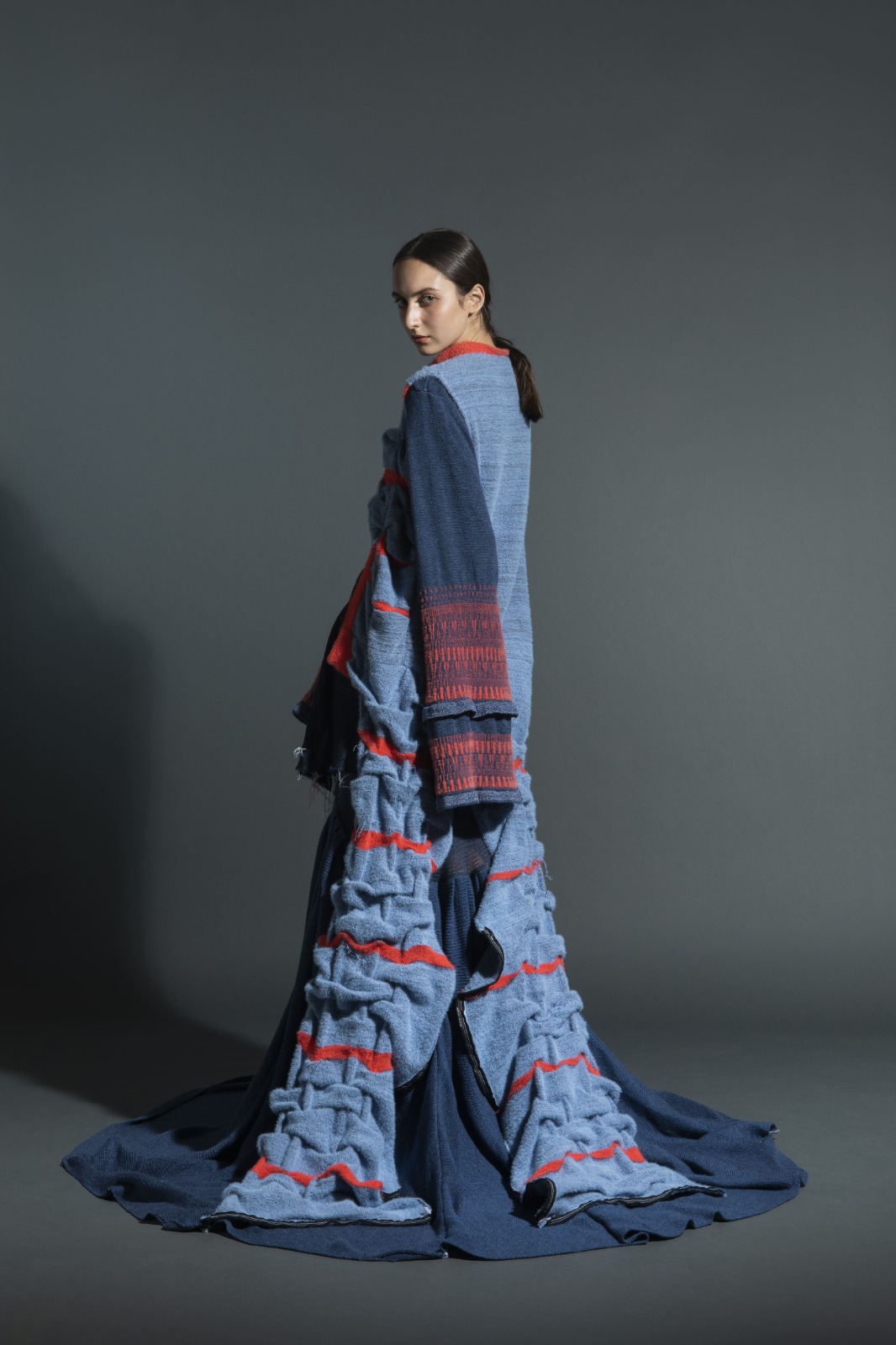 For me, the signature of knitting design is to use the interweaving of threads flexibly to give each fabric piece a unique design. Through the theme of NIBIRU, I have designed a series of garments whose inspiration comes from The Big Bang. The stereo pattern emulates the expansion and stretching of the universe and it incorporates gray blue with fluorescent color to represent "explosive power ". At the same time, this collection allows knitted textiles to coexist with functionality. The coat could be worn in multiple ways, either with a hoodie or creatively extend the long pendulum after disassembly which would, not only, enhance its functionality with the flexibility of knitwear design but also creating a modem aesthetic look.