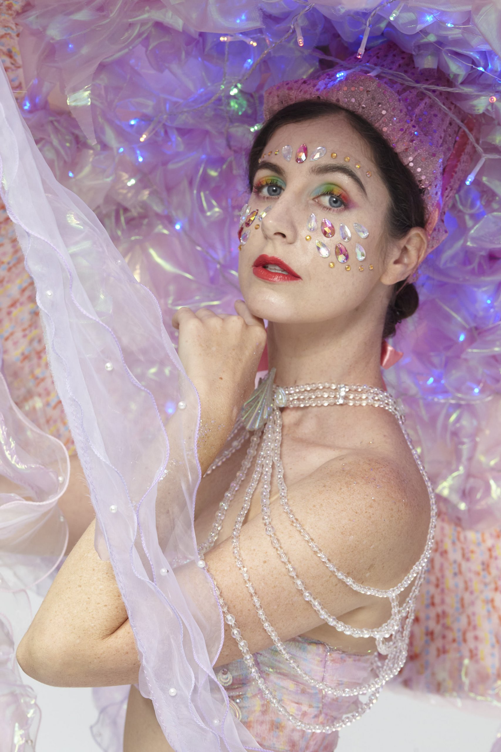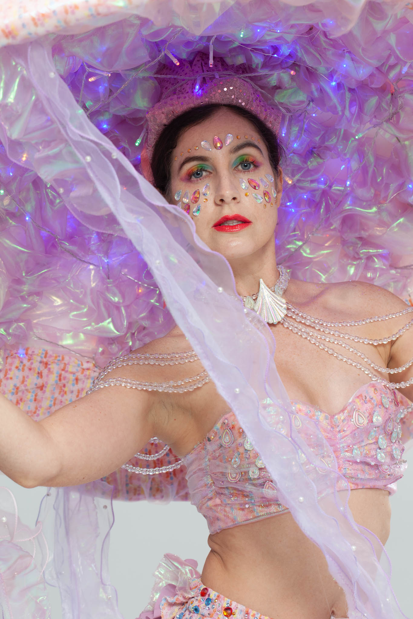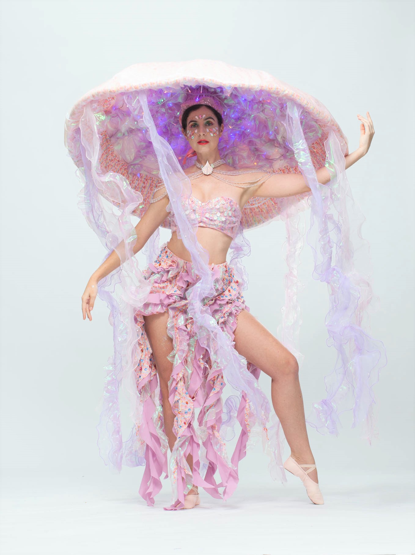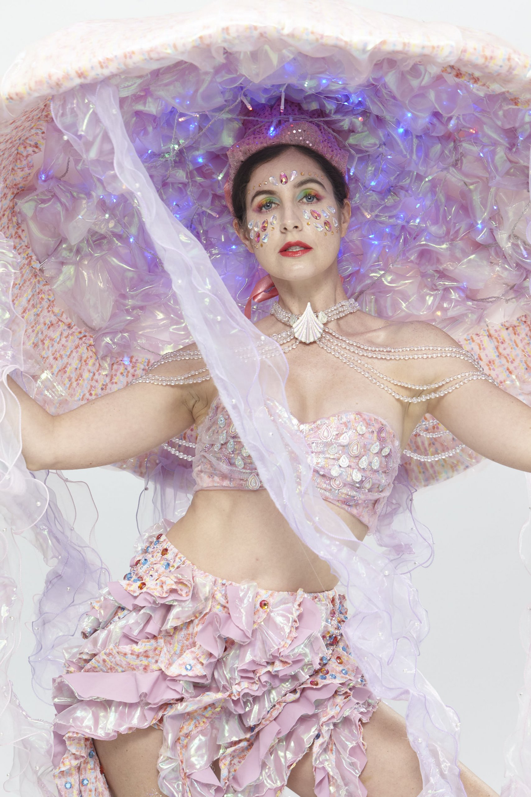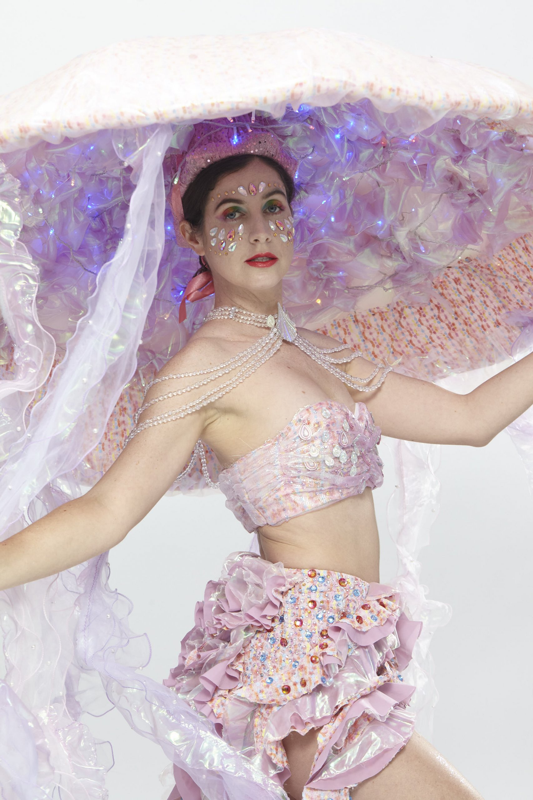The story of “Sea Girl” is about a love story between the King and a Sea Girl. Its comes from the classic folk tales “One thousand and One Nights”. Sea Girl lives under the deep ocean and is awaiting for her love. I chose a Jellyfish image to represent the character for its graceful figure could enhance feminine charm. In the end of the story, the King sacrifices his power as a king of a country to stay with Sea Girl and to live in the Sea Kingdom forever with his love. The costume with wired LEDs will give the jellyfish costume an iridescent look for seeking attention in deep under the sea.