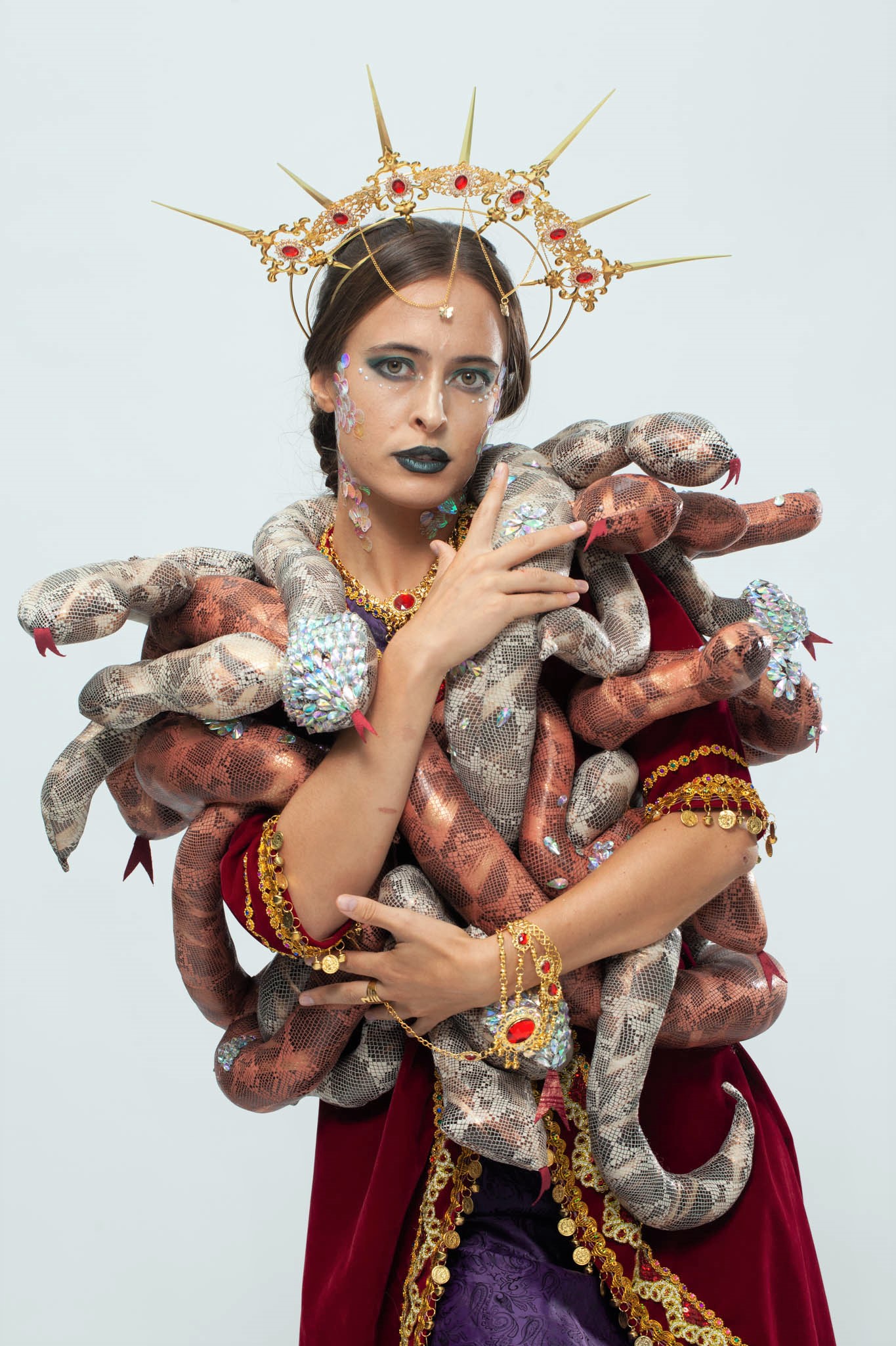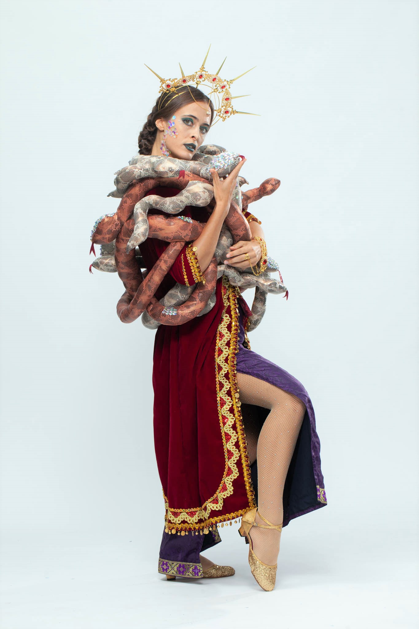 "Sinbad the sailor" is a story about the reign of Harun al- Rashid, the fifth caliph of the Abbasid dynasty. Sinbad is a famous navigator during the Abbasid reign, who travelled across the seven oceans from the West Bank of Shatt al-Arab, Basra located at the intersection of the Tigris and Euphrates rivers. He sailed from East Africa to South Asia and encountered various monsters and special natural phenomena. My design is inspired by snakes in reality, using the gold ornaments to express the noble and fierce feeling of snakes. Also, the snakes are continuously winding the outfit to feature the characteristics of snakes.