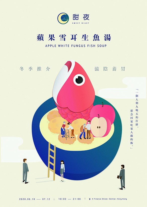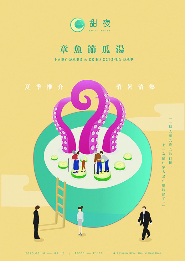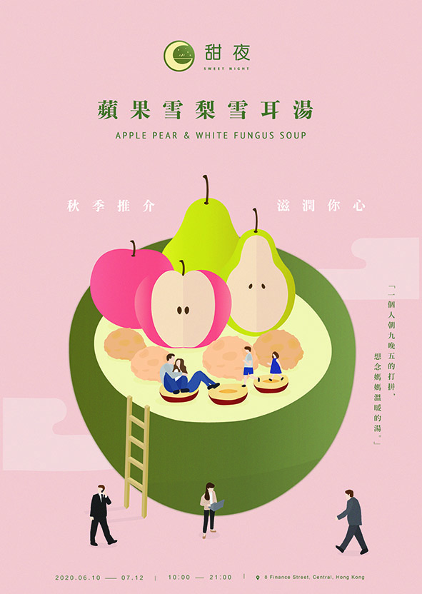 Sweet Night is a brand of healthy Chinese pre-packed soup. Different kinds of pre-packed soups for different seasons are available. The products’ home-made taste would remind customers of their mother’s cooking, encouraging them to think about their families and reflect on the need to spend more time with them. Through these products, customers are encouraged to go home to have dinner with their family more often instead of eating unhealthy take-away food in the office, achieving work–life balance as well.
