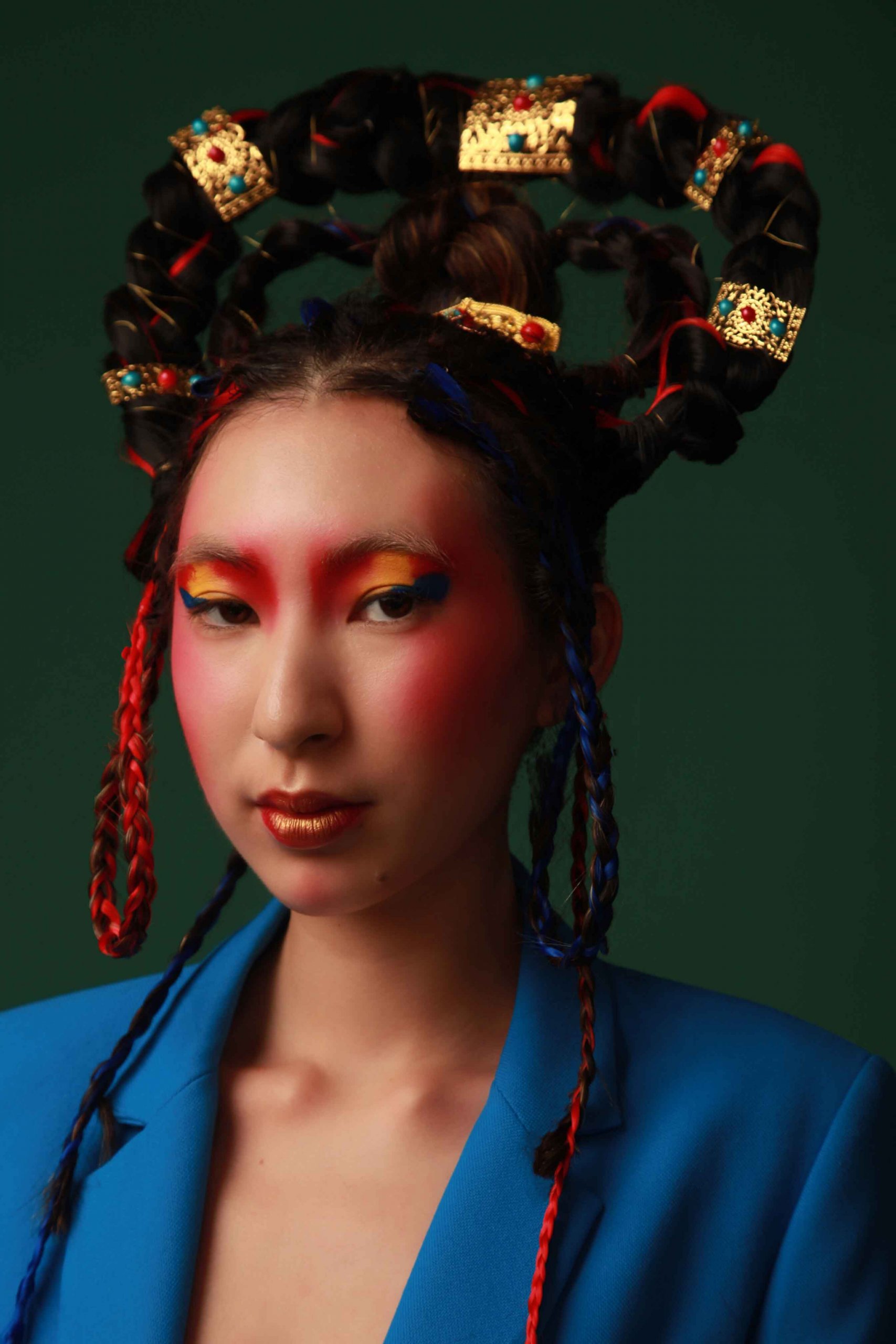 My inspiration is from the Tibetan people in the national style. Tibet gives us a very mysterious and unique feeling. I used their culture, clothing and auspicious objects in Tibet as my inspiration. One of the representative group of Tibetans is Khata. This is the highest courtesy of Tibetan hospitality and brings auspicious meaning. It comes in five colors, white, red, yellow, green, and blue. Therefore, I used these five colors to create the hair and makeup.