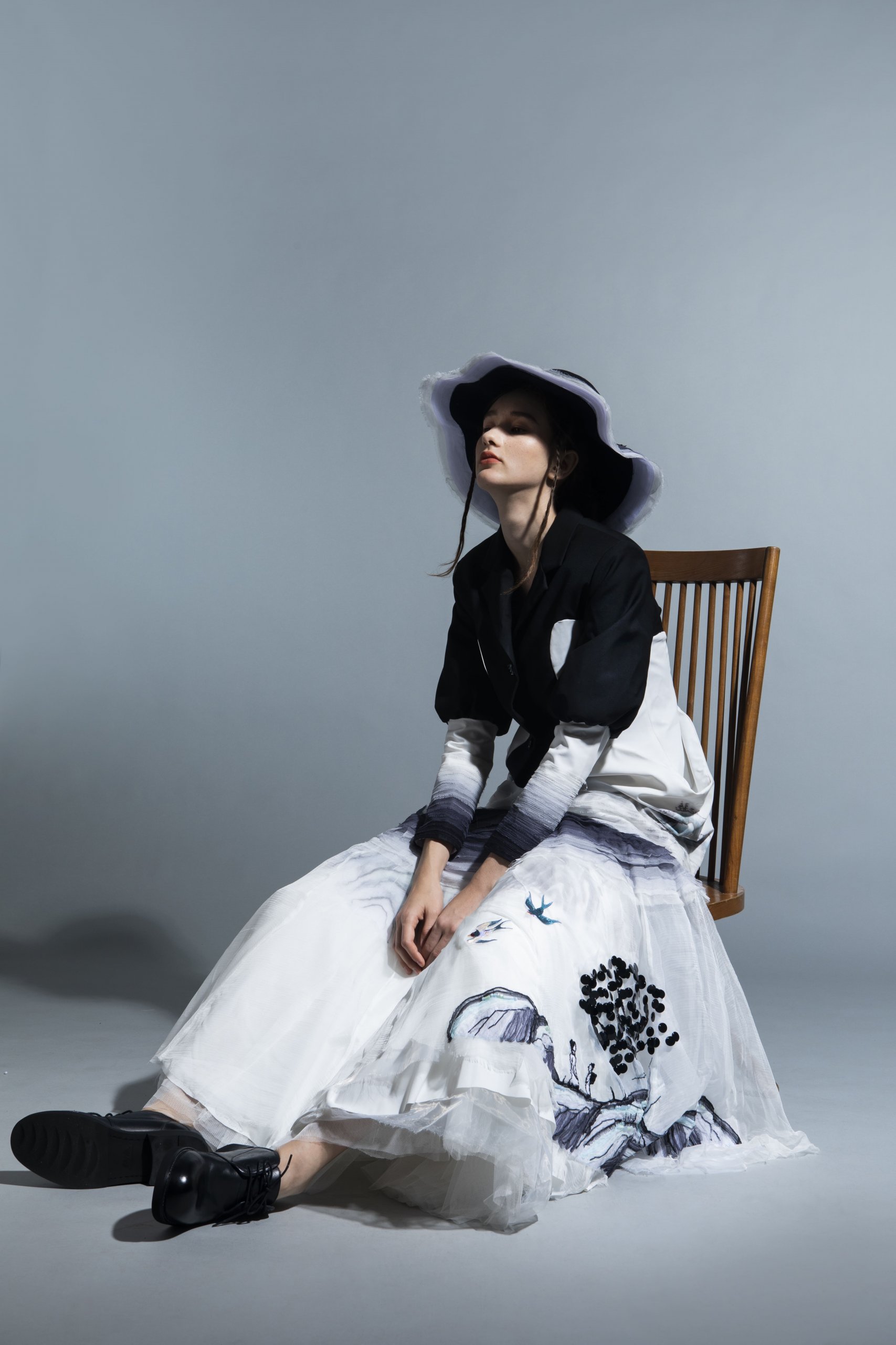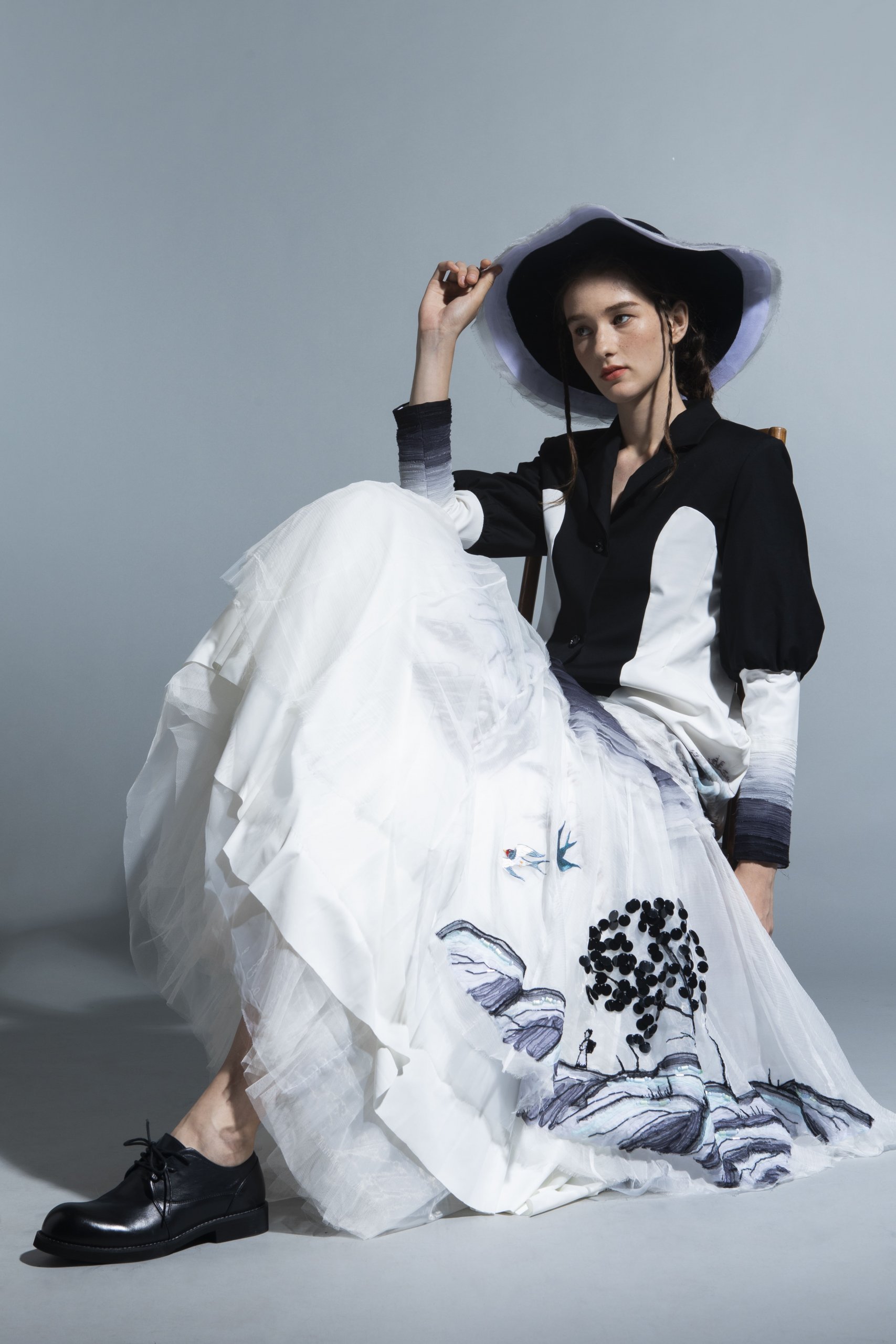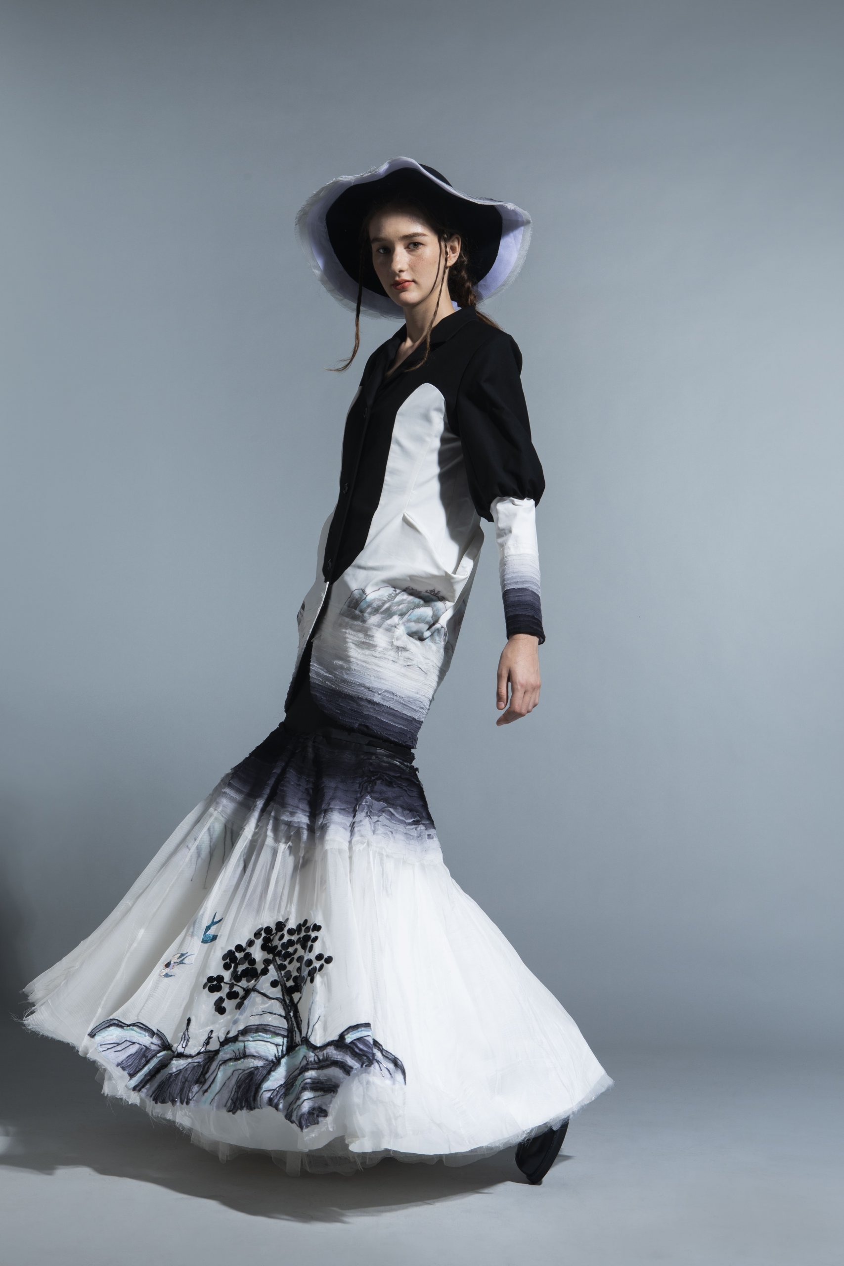 Chinese culture is lenient. As one of the medium used in traditional Chinese culture, water ink exactly encompasses these characteristics. My collection combines the silhouette and design details of both menswear and womenswear through using a variety of unique craftsmanship, such as embroidery and felting, that hopes to highlight the Chinese cultural concept of "Harmony in Diversity".