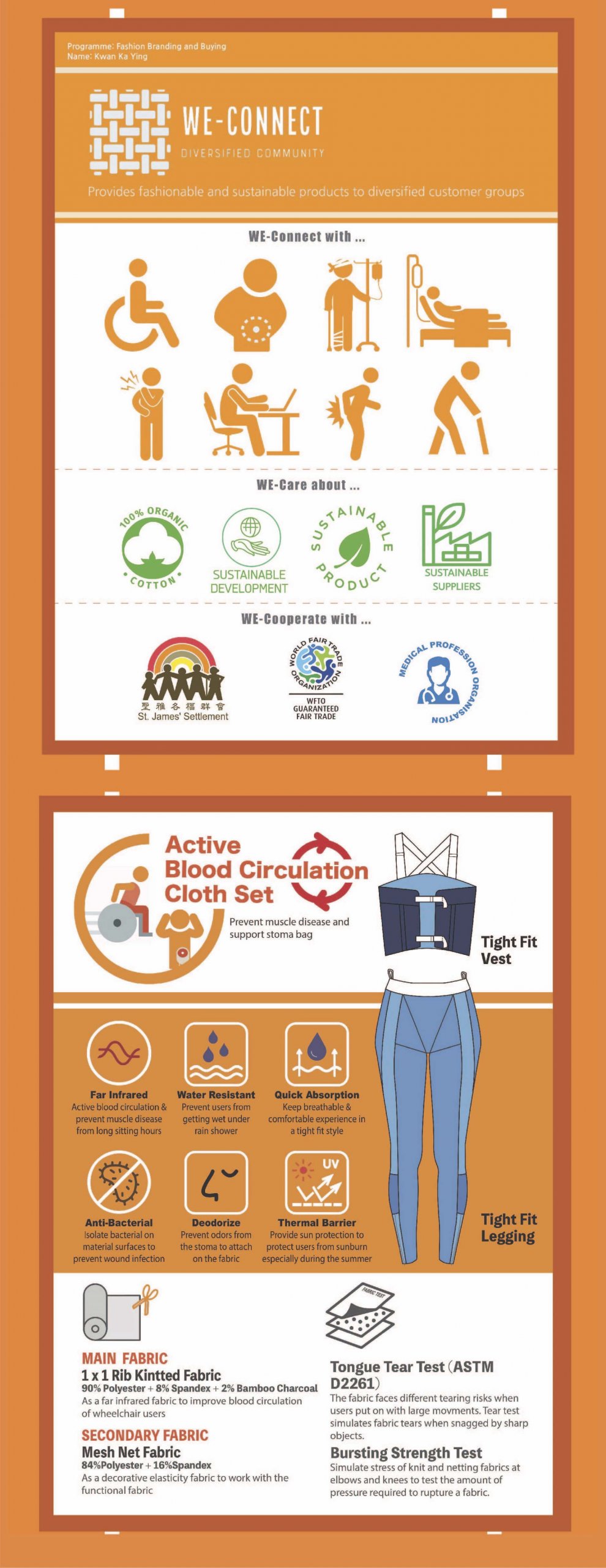 "We_Connect” is a social enterprise helping people with special needs. We collaborate with NGOs and professionals to provide quality projects under a fair trade environment. The major product of We_Connect is a series of specially designed garment for wheel chair users. With the use of special materials and silhouettes, we wish the users can achieve better wearing experience and improve their blood circulation.