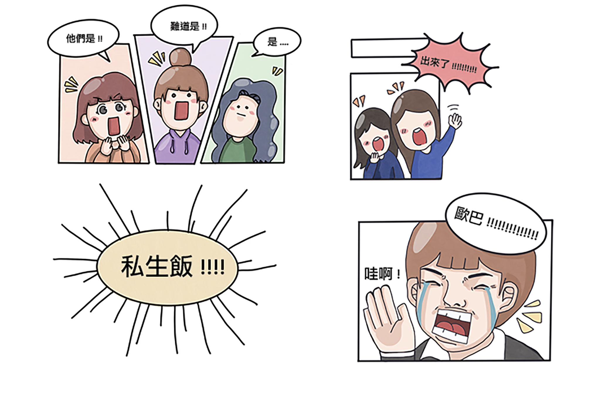 The design philosophy uses my own comics style to help teenagers have a taste on Sasaeng Fans. I hope the teenagers would have better understanding on Sasaeng Fans afterwards. I have also designed some products, such as postcards and stickers, so that my work can be spread over effectively and more people can learn about Sasaeng Fans.