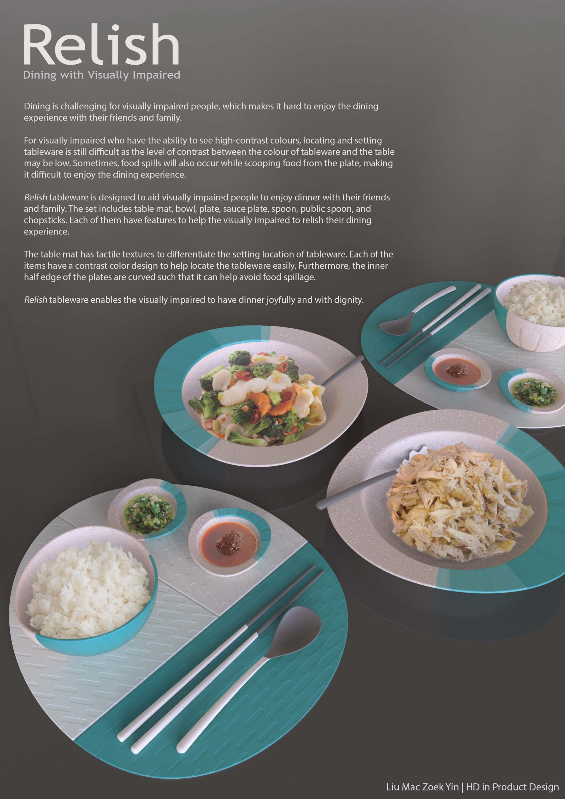 Dining is challenging for visually impaired people. For the visually impaired who only have the ability to see high-contrast colors, locating and setting tableware is still very difficult as there is often a low level of contrast between the colors of tableware and the table. Relish tableware is designed to aid visually impaired people to enjoy dinner with their friends and family. The set includes table mats, bowls, plates, sauce plates, spoons, public spoons, and chopsticks. Each of them has features to help the visually impaired to relish their dining experience.