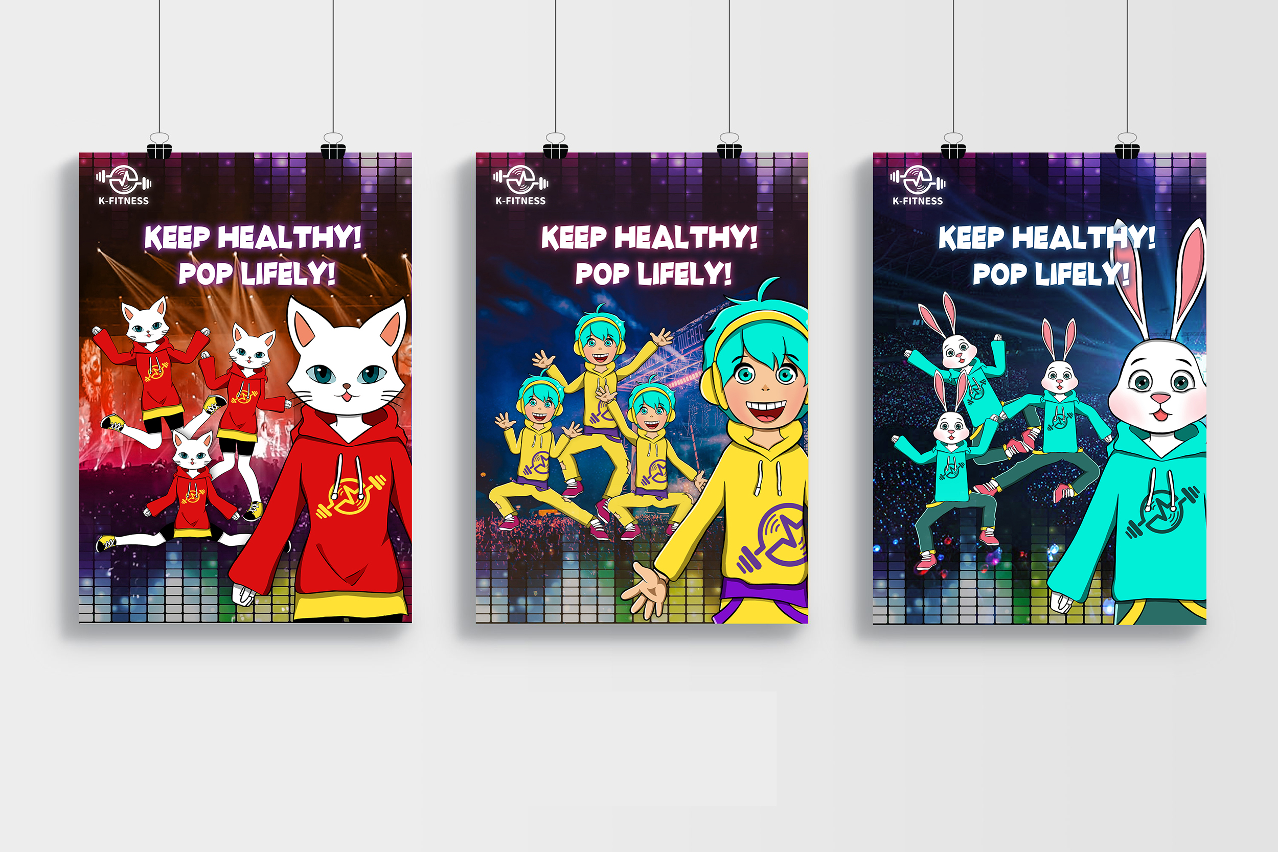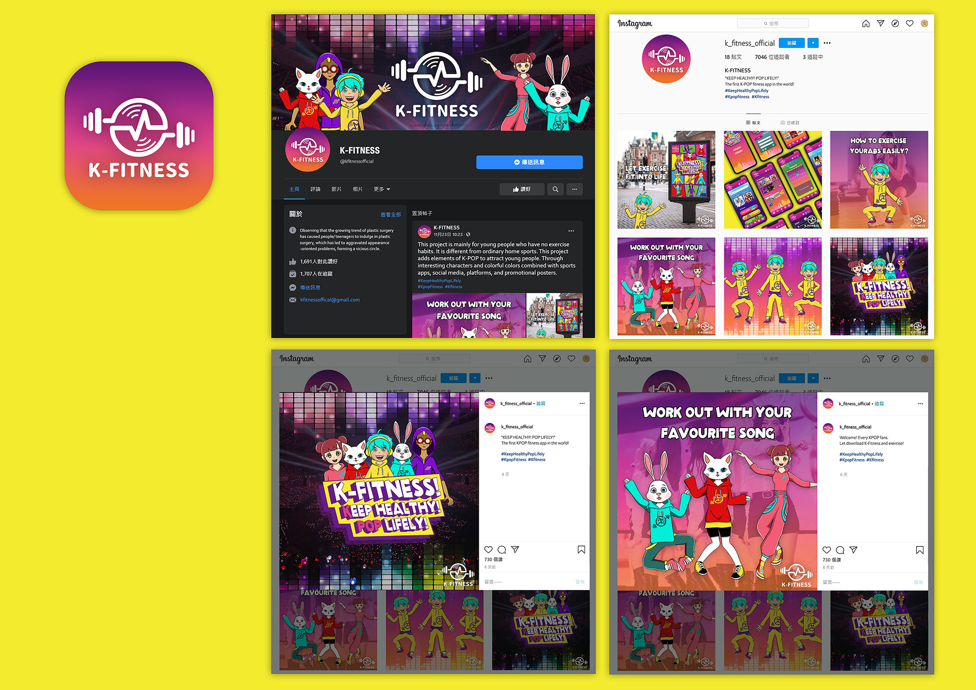 As outdoor sports are restricted due to the epidemic, many people’s mental and physical health has been affected. Nowadays, exercising at home is becoming more popular worldwide. However, some people are not interested in exercising at home due to lack of knowledge and monotonous movement. This project is mainly for young people who have no habit of doing exercises. Unlike ordinary home sports, this project has added elements of K-pop to attract young people. Through interesting characters and colorful sports apps, social media, platforms, and promotional posters, we hope to attract a group of young people who like K-pop but have no exercise habits to try sports with the innovative ‘Korean Wave’ theme. This project aims to help improve the physical and mental health of the public.