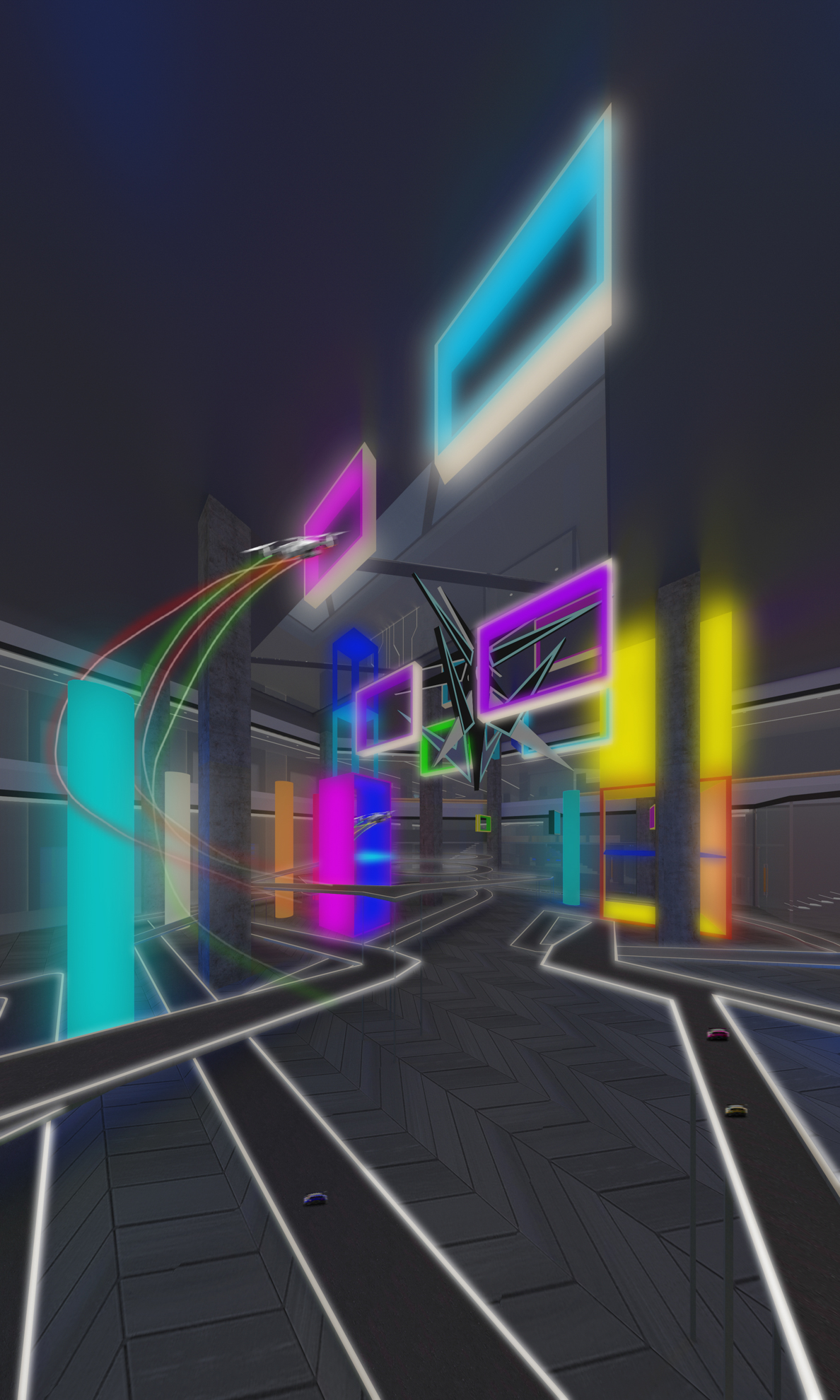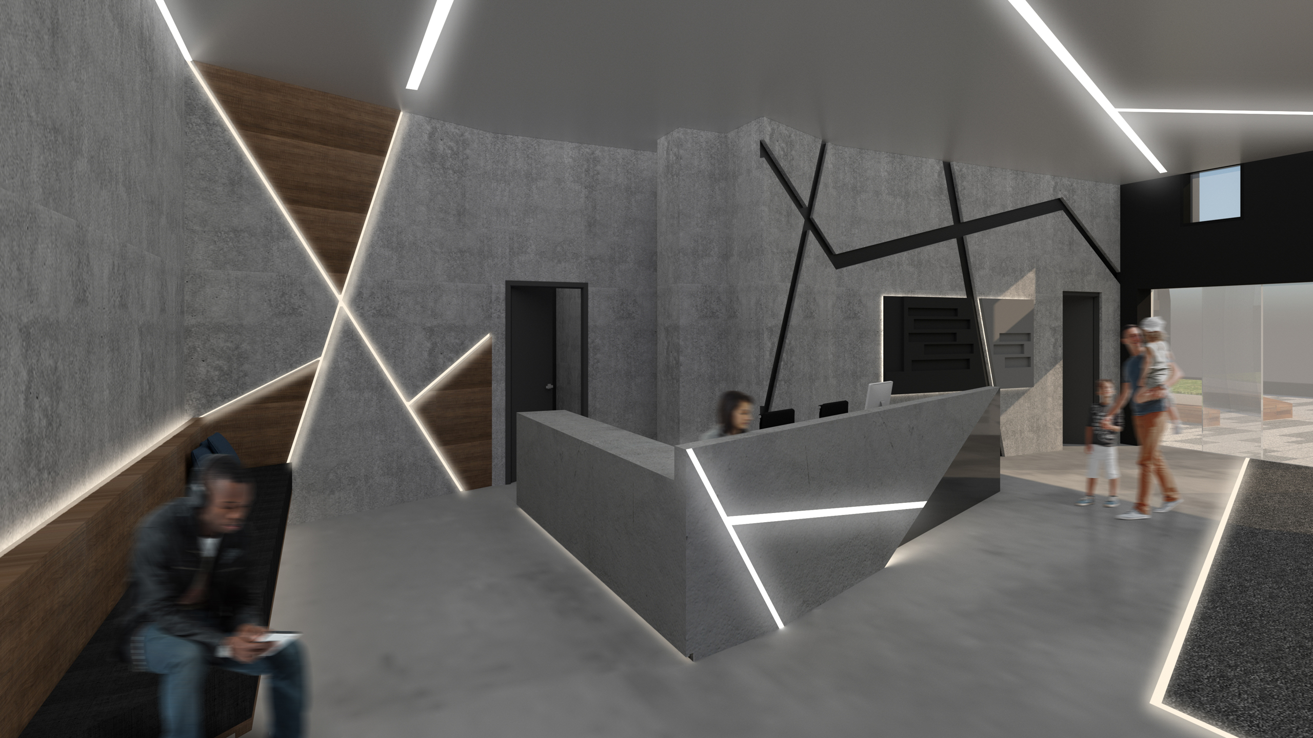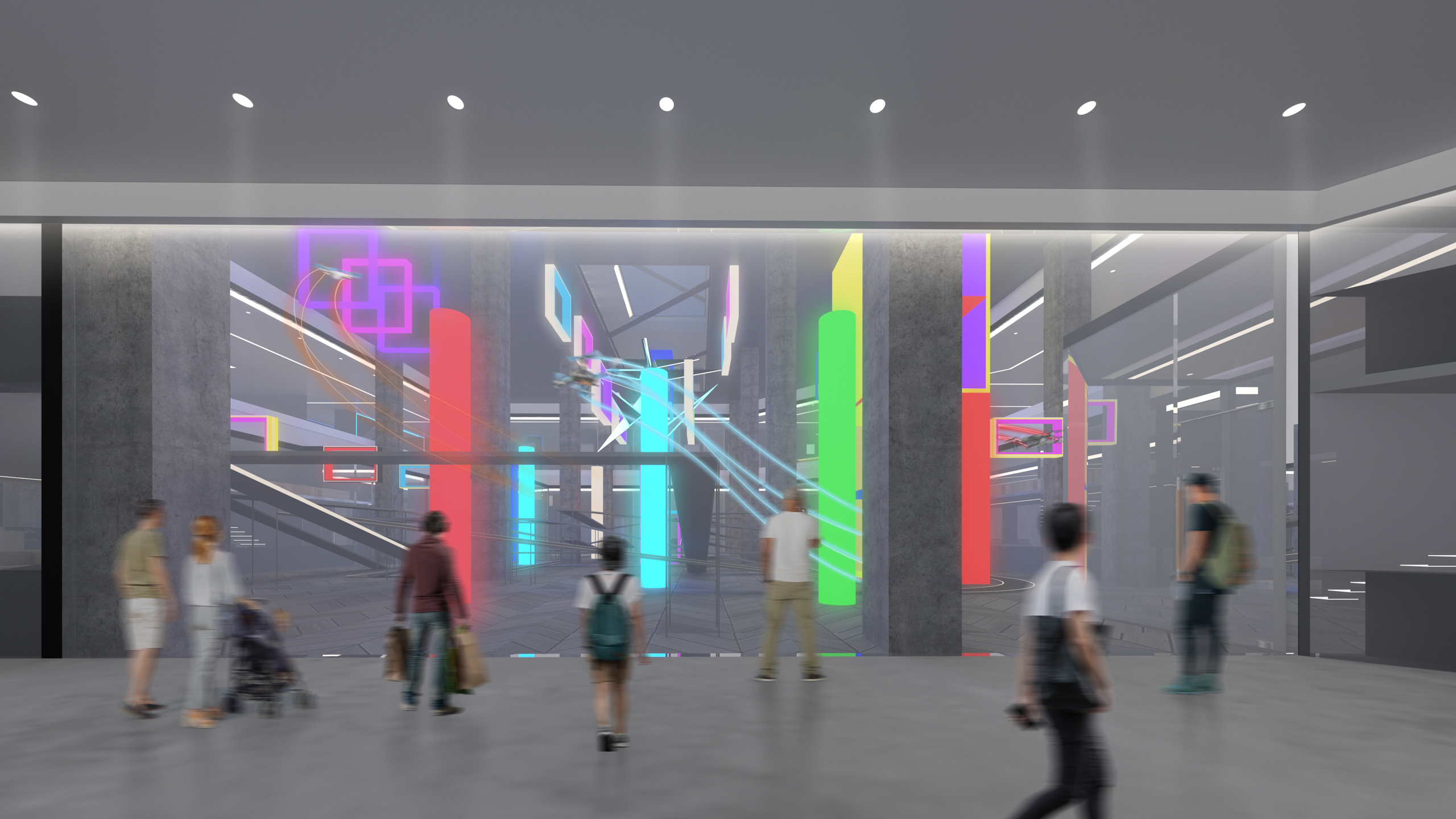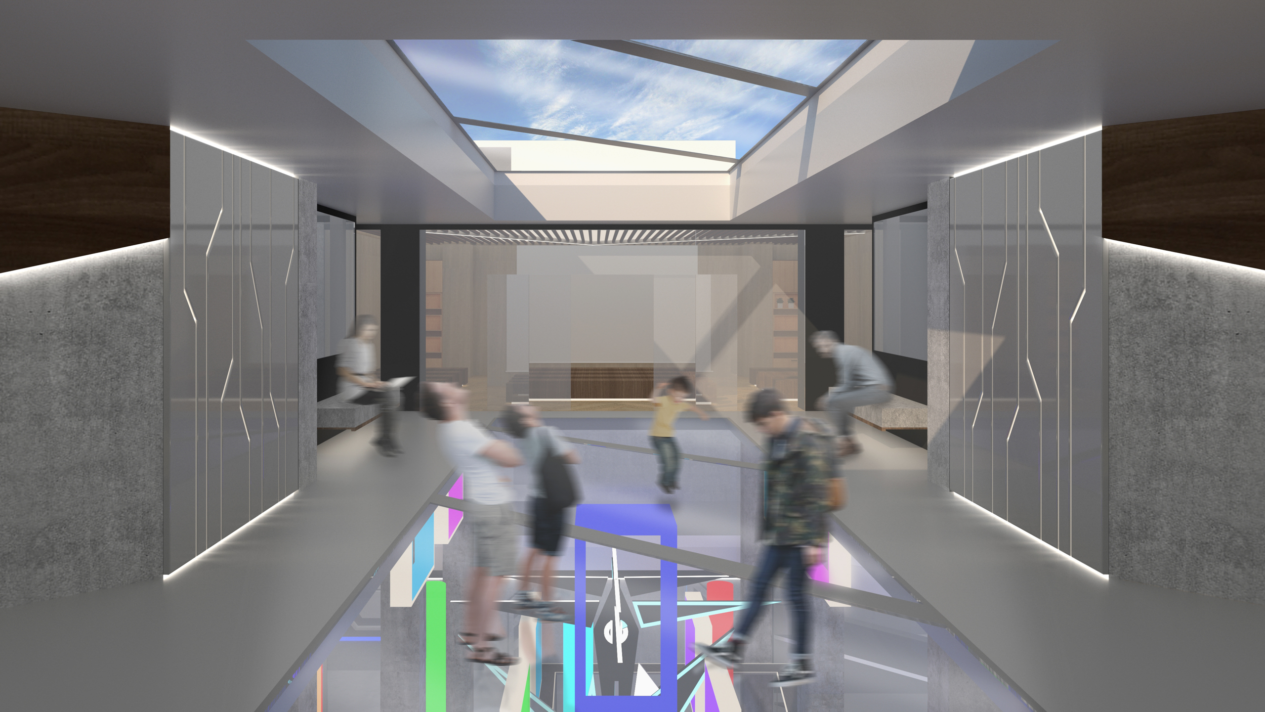 The design combines technology and entertainment to produce a five-dimensional conscious space. The public can learn from entertainment (STEAM) while experiencing the connection between virtual and reality. The space is dominated by oblique elements in its decoration.