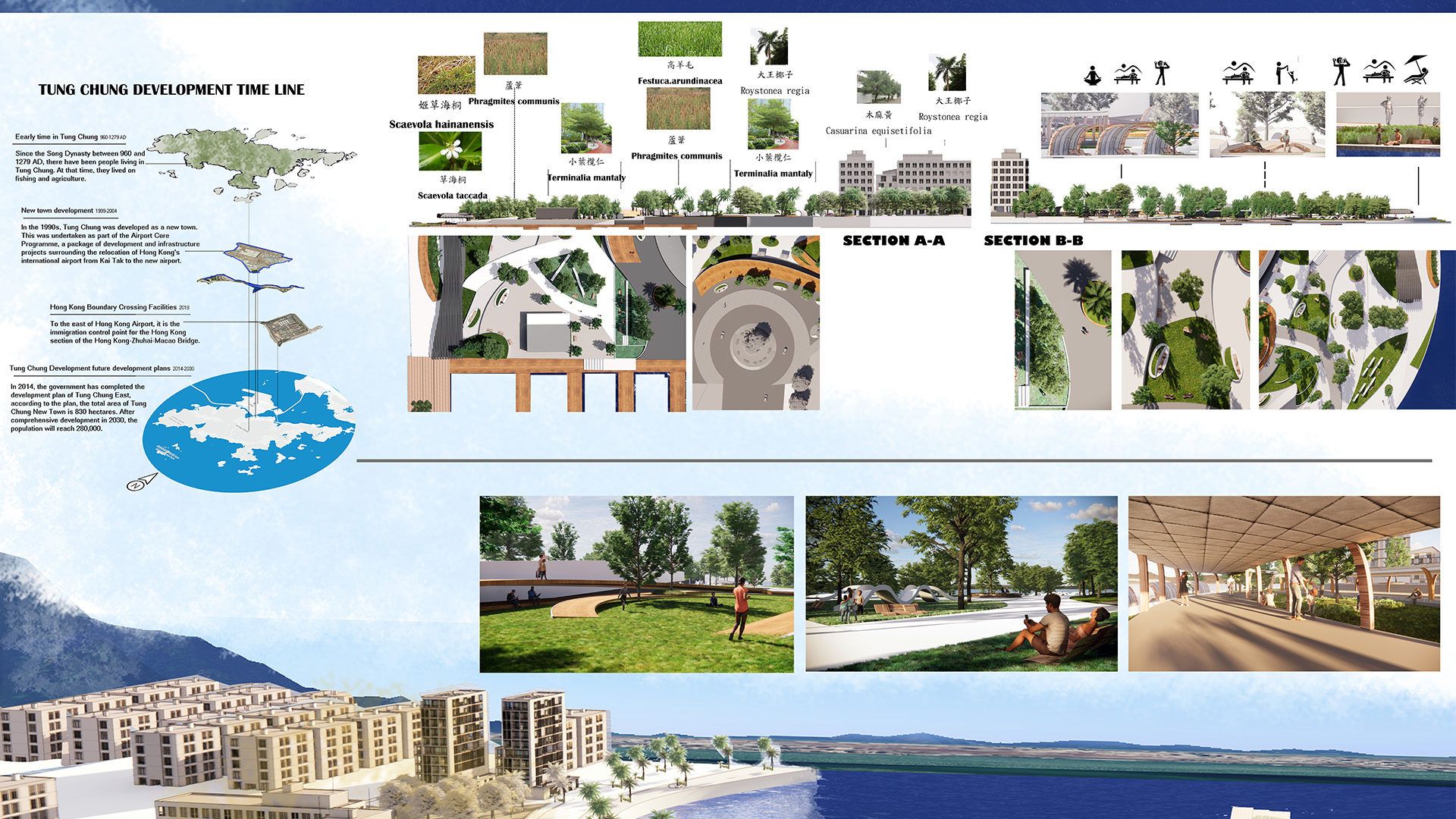 Named as the Wave Pier, my design locates in the waterfront part of the Tung Chung East Extension Area. The design concept is based on water and sea waves. I used the level to divide different areas of the park so that people at various levels can have a different view of the ocean. I want the shape of the waves to help people remember that the land was once a part of the ocean.