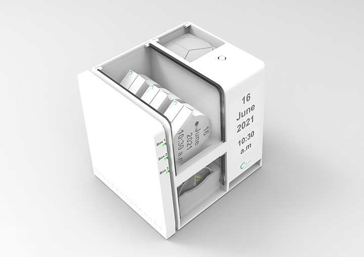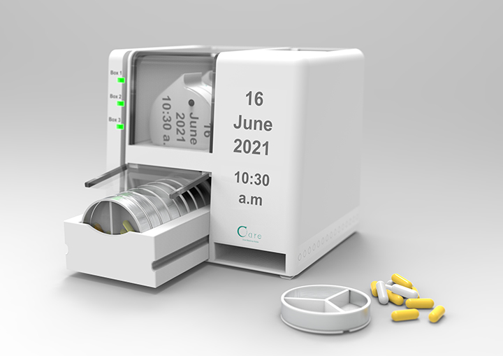 Care is focused on dementia and their caregiver, it is a home medicine device with a portable box and an App to remind dementia to take their medication on time.