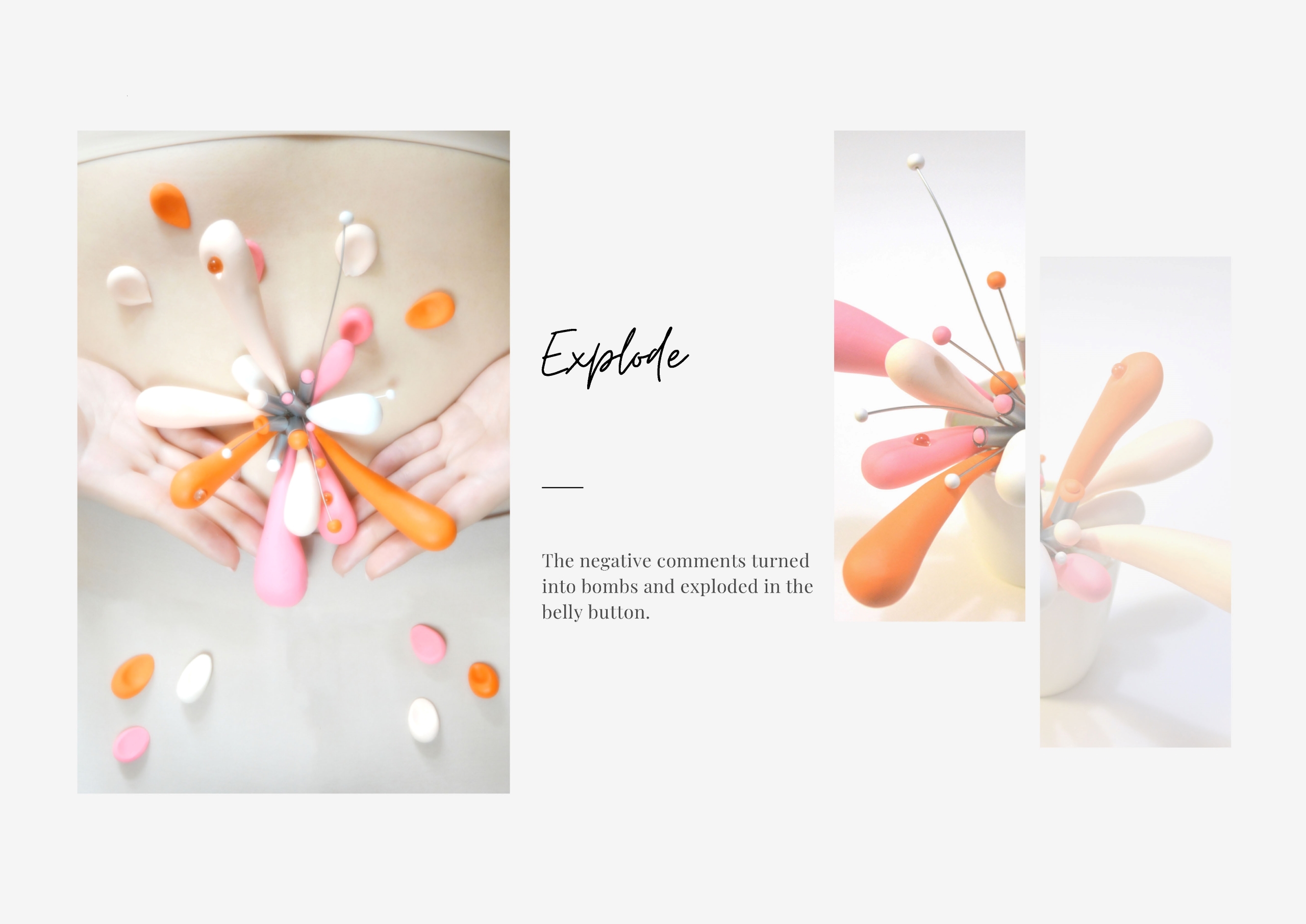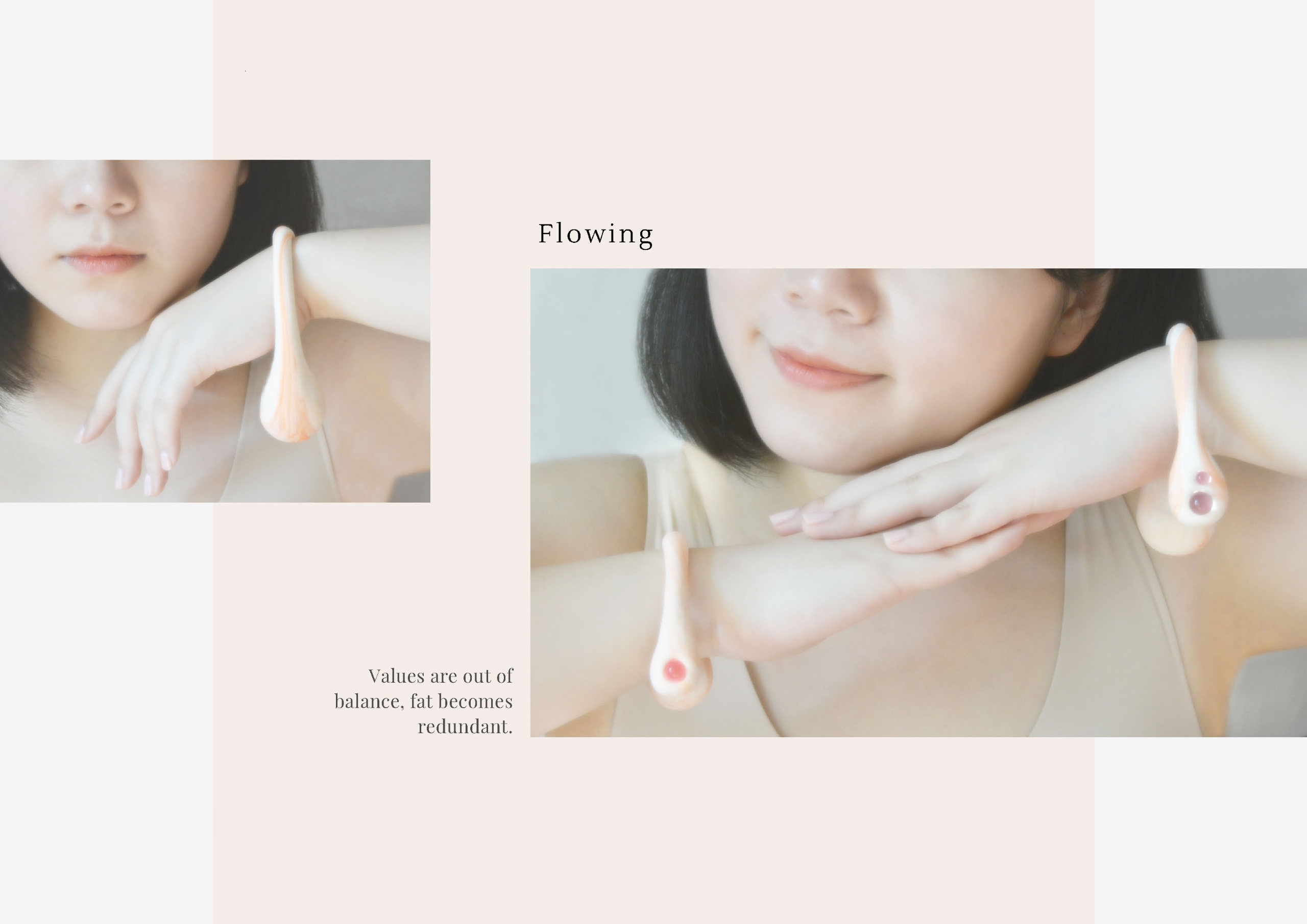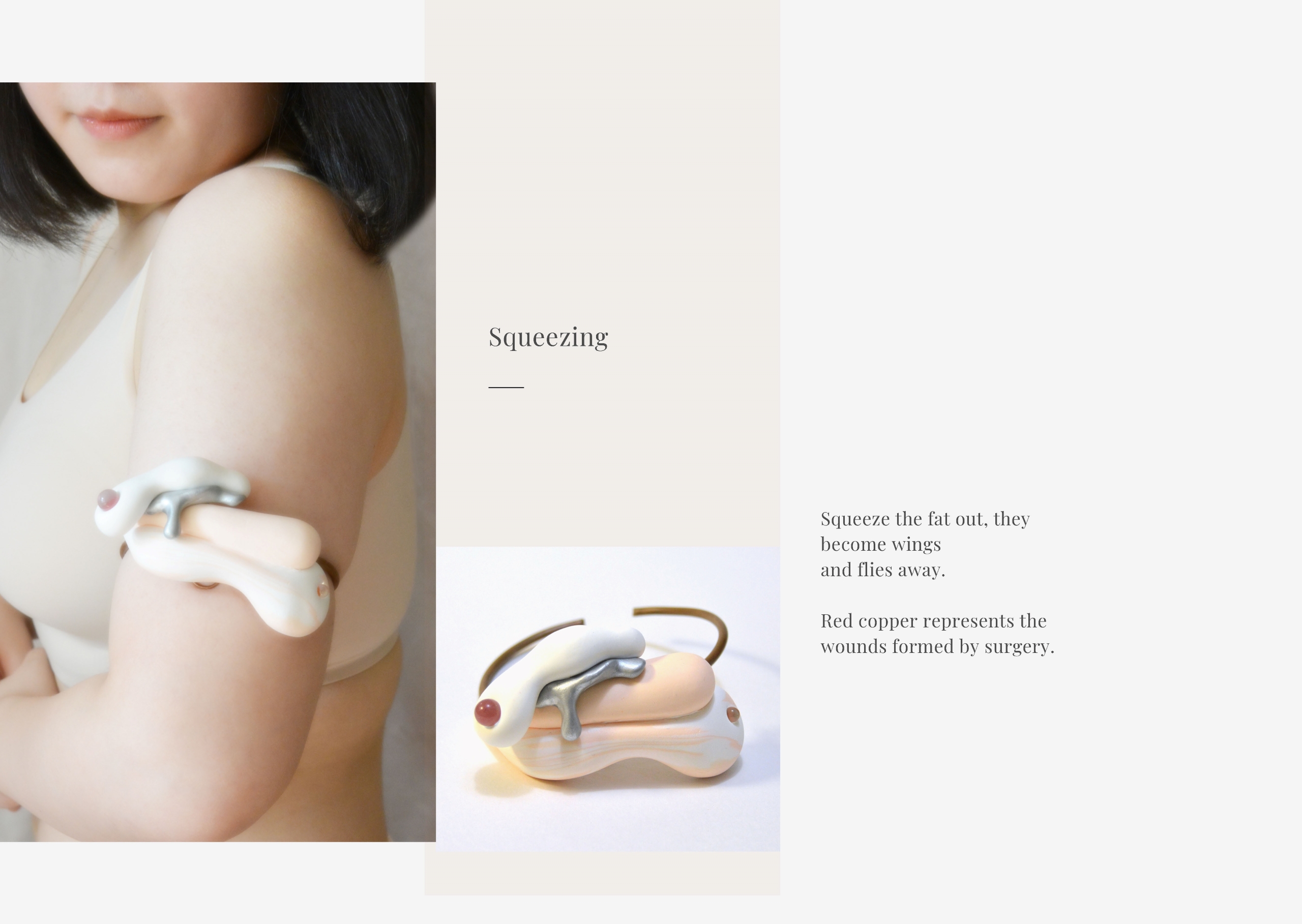 My work is an attempt in giving form to a “force”. To this, I am referring to a force that is pulling and squeezing to express the need to get rid of excess fat in our bodies as a response to the general perception of beauty. The expressive form involves warm colors and a palette close to our skin tone. The collection can be touched in order to connect people to the concept behind the art piece.