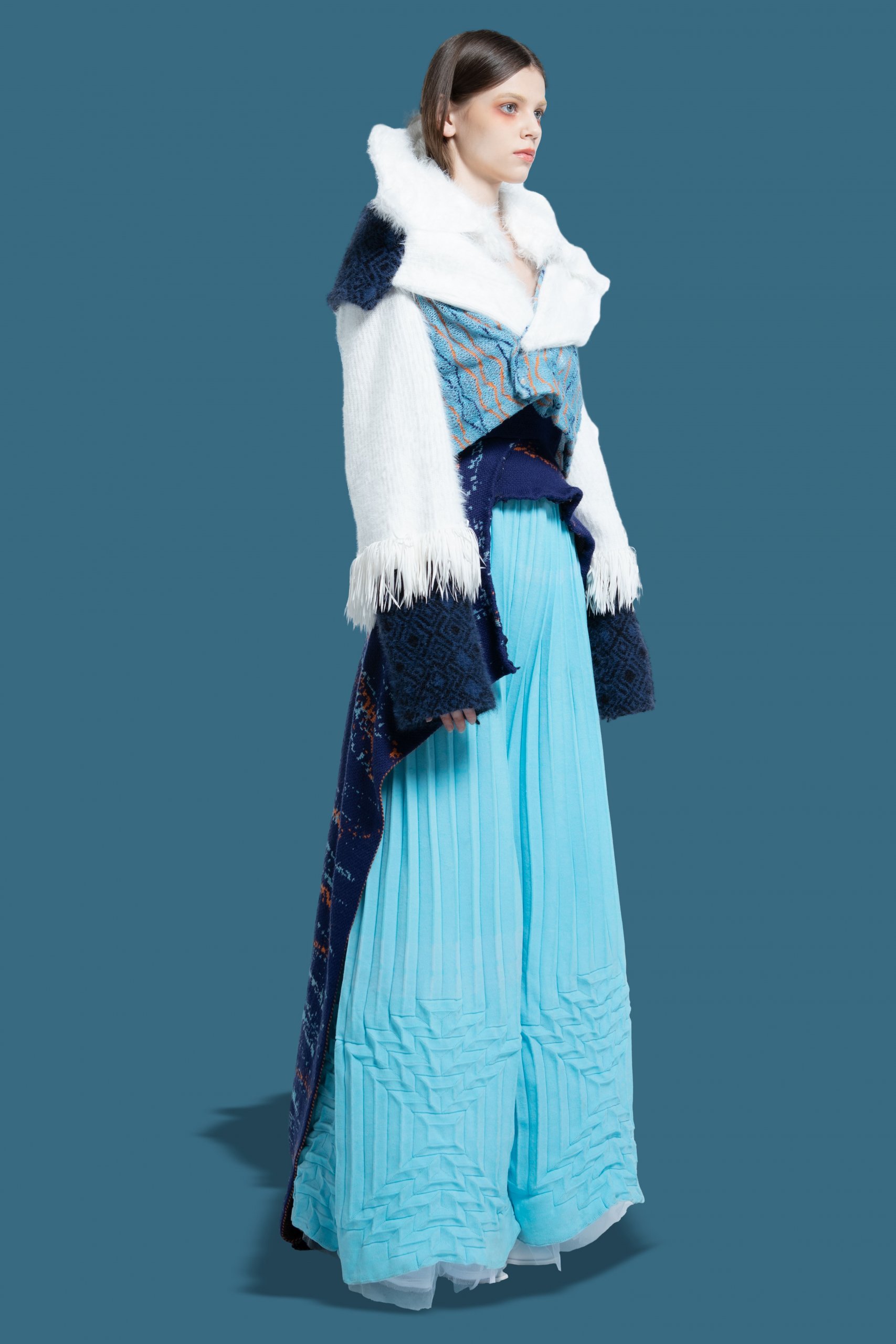 The term 'blue blood’ was once used to describe rich and powerful families. Nowadays, this term is used to describe people with superior status. To me, there should not be hierarchy, sexism, and racial discrimination. Everyone has ‘blue blood’, as every human life is a priceless work of art. The collection is designed for those who are intelligent and self-assured. The fabric and silhouette designs reflected the message I want to express. For example, the pleats represent gender symbols while the waves represent DNA patterns. The big collar and exaggerated silhouette bring out an image of being elegant and confident. You may not recognize it from first sight, as the idea has been merged into the design rather than being emphasized as a standalone item.