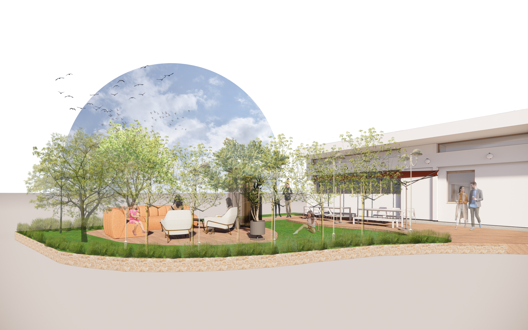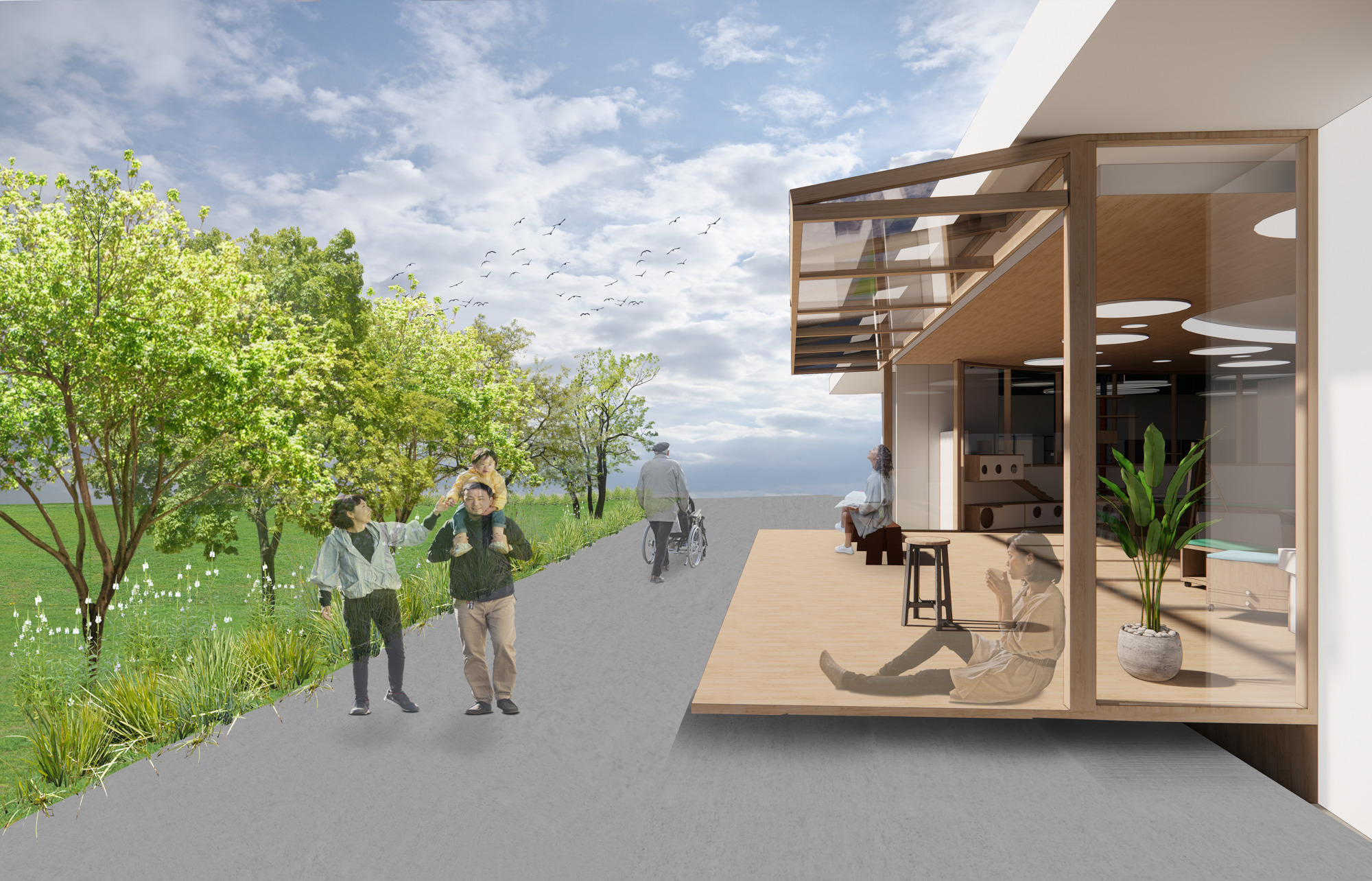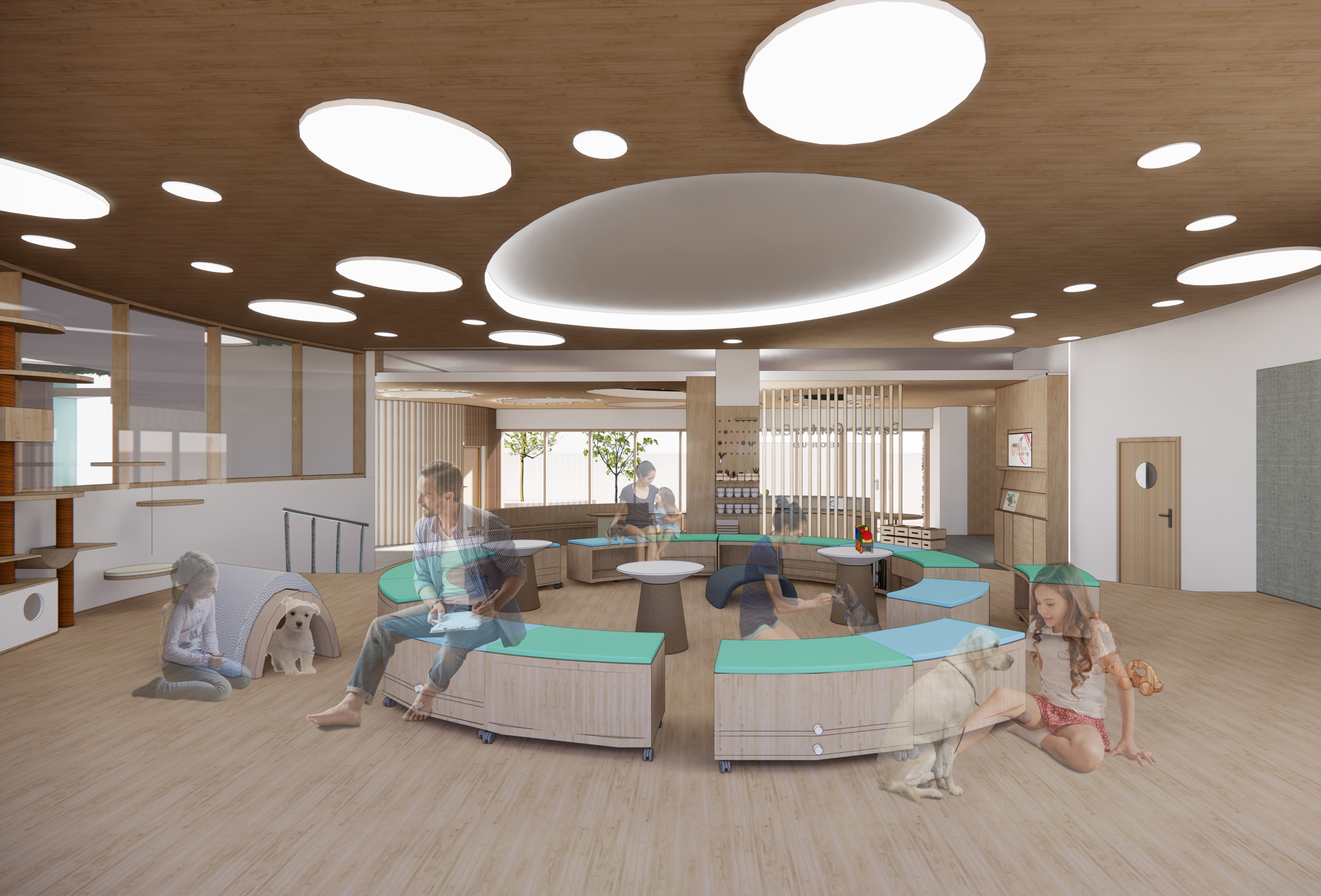 To redesign a cancer caring center for the patients and their families with a multi-function area for a pleasant afternoon stay while the patients are attending art therapy, pet therapy, cooking experience, etc. Exterior walls are opened up while the semi-open interior space can broaden the view and allow natural light to shine through. Decorated with natural wood, greenery, and sky blue materials, the center is created as a pleasant and spatial venue for different users.