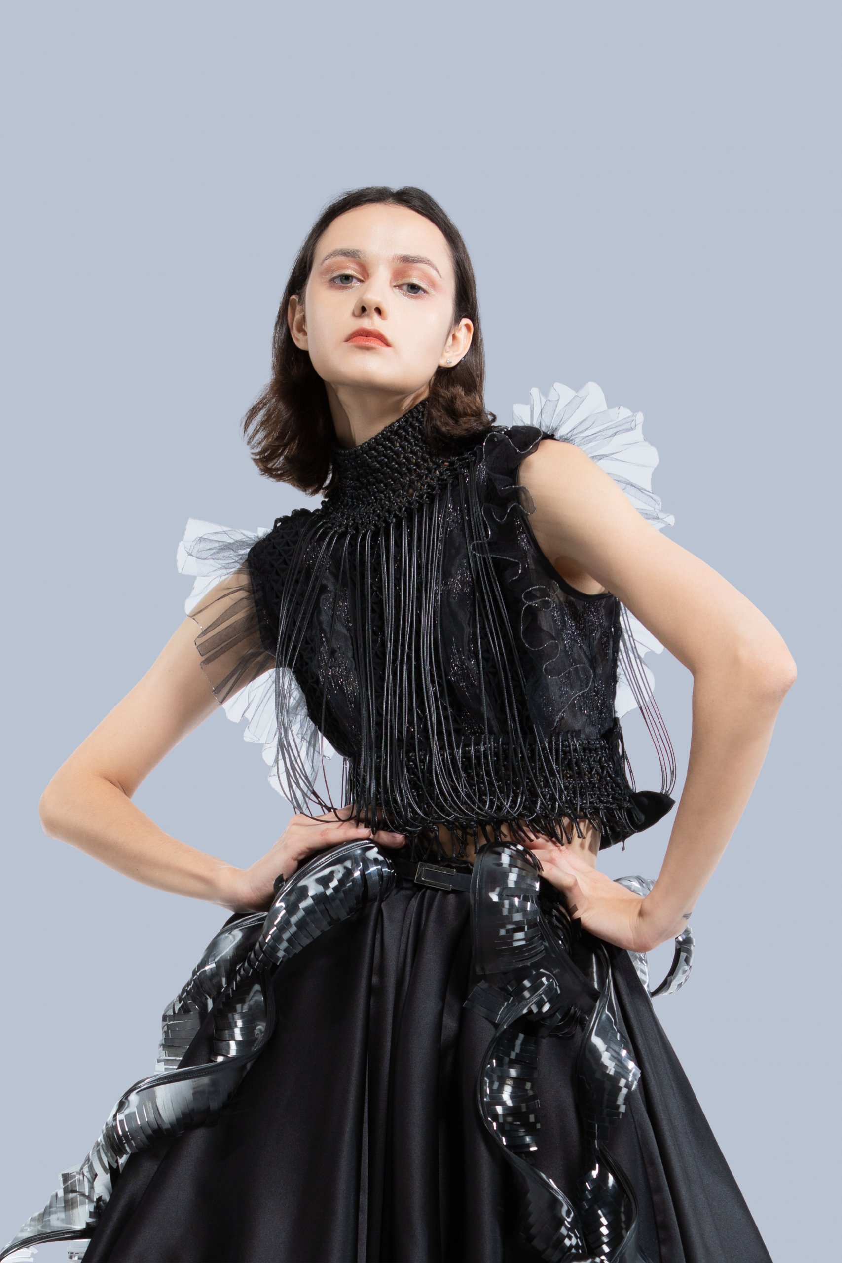 My design was inspired by the patterns of modern architecture. I extracted the geometric patterns from architecture and put them into my design through smocking and macrame knotting techniques. “Points” and “lines” are used to shape the multi-dimensional form of the garment.