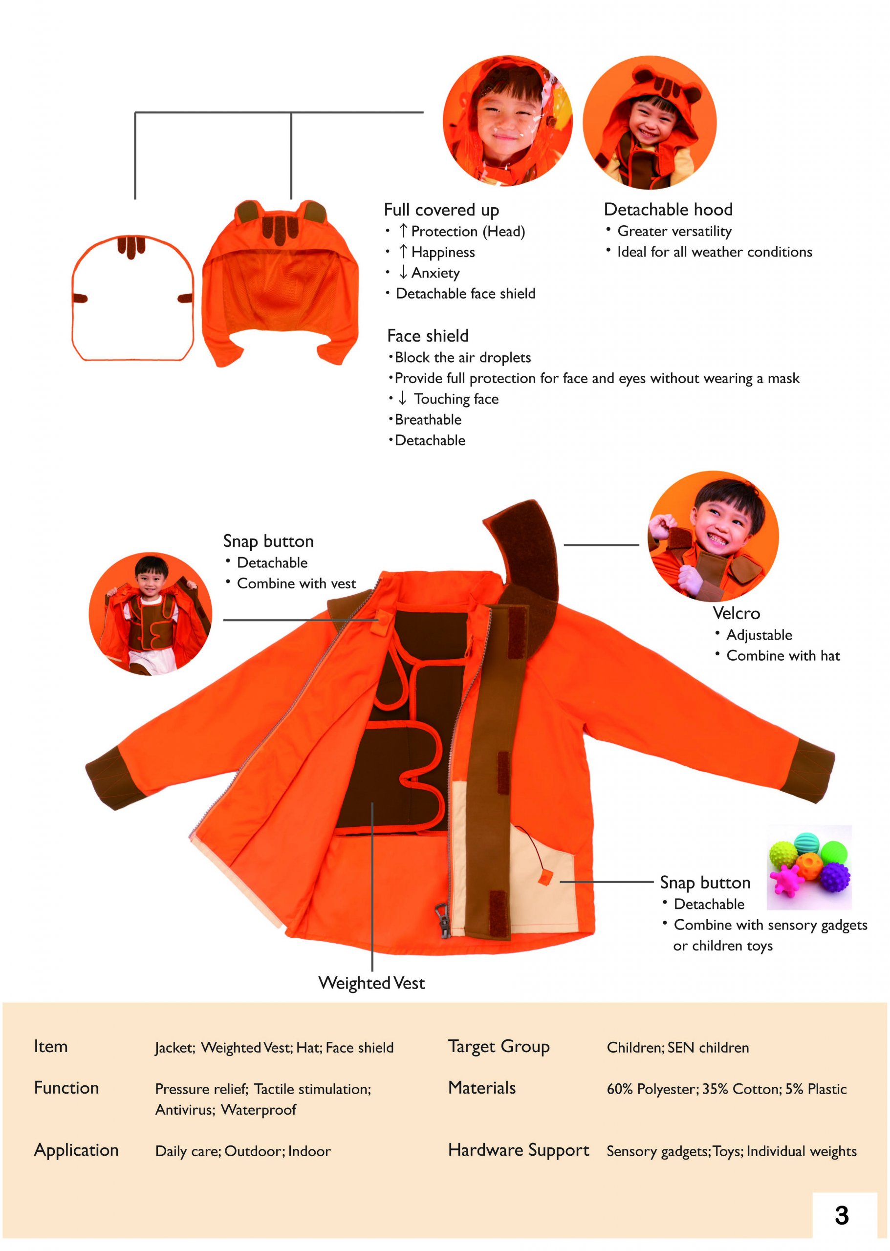 To protect children from virus infection and cater to their emotional needs, a series of protective wearable items with four different features, including anti-virus, stress relief, tactile stimulation and adjustable adaptability, have been developed. Infused with the deep stress therapy concept, materials with different textures and colorful cartoon patterns have been applied on the protective wearable items.