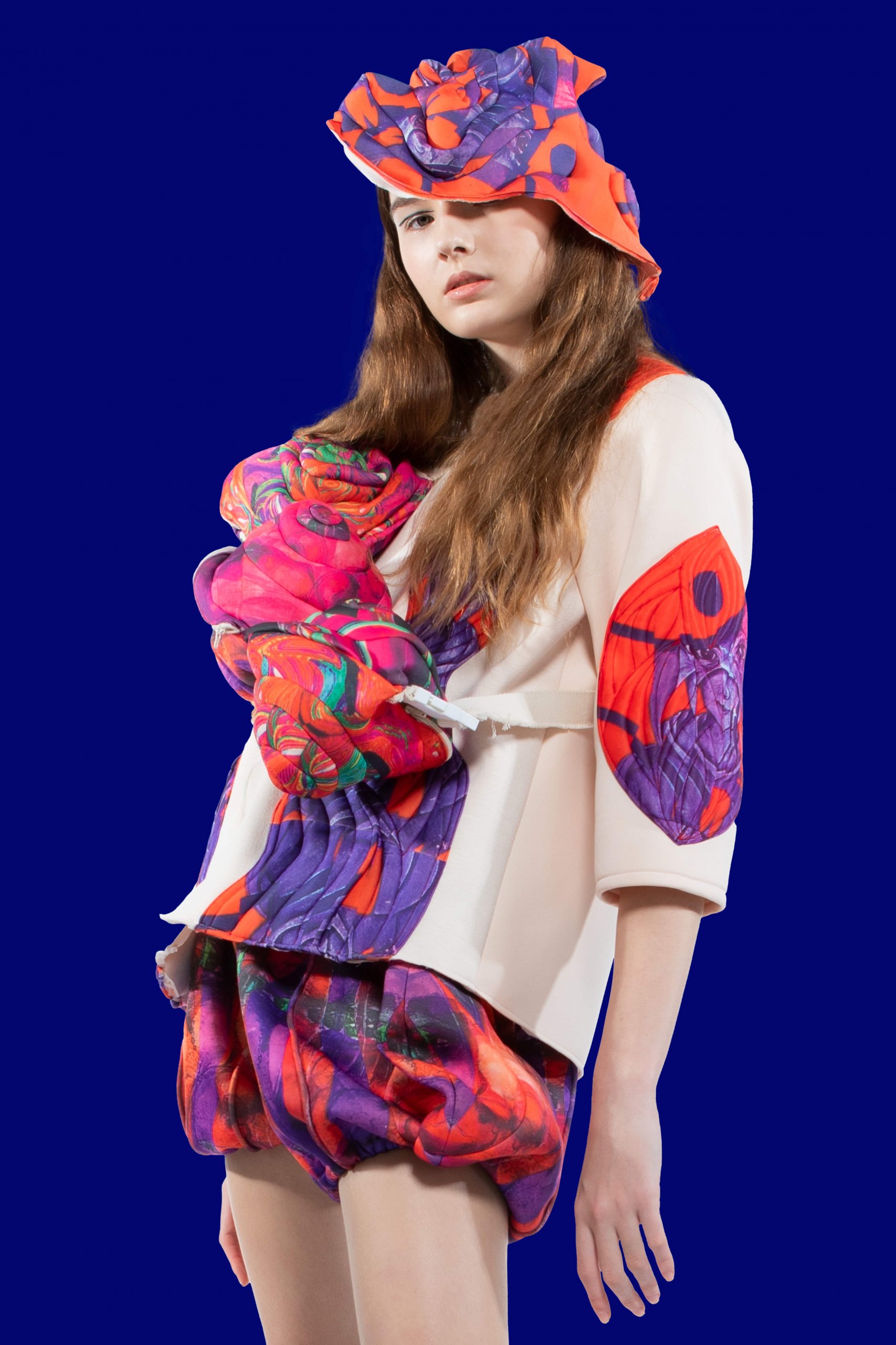 This graduation collection breaks away from the tradition and embraces the avant-garde. Although the design adopts bright, fascinating colors and elements, it is nonetheless eerie, leading the audience into my whimsical world full of weird aesthetics. This collection aims to raise people’s awareness of patients who are suffering from mental illnesses and emotional distress. Patients with schizophrenia and PTSD will often have hallucinations and nightmares. I have used red, blue, and purple to represent the pain and stress from being on the verge of emotional collapse.