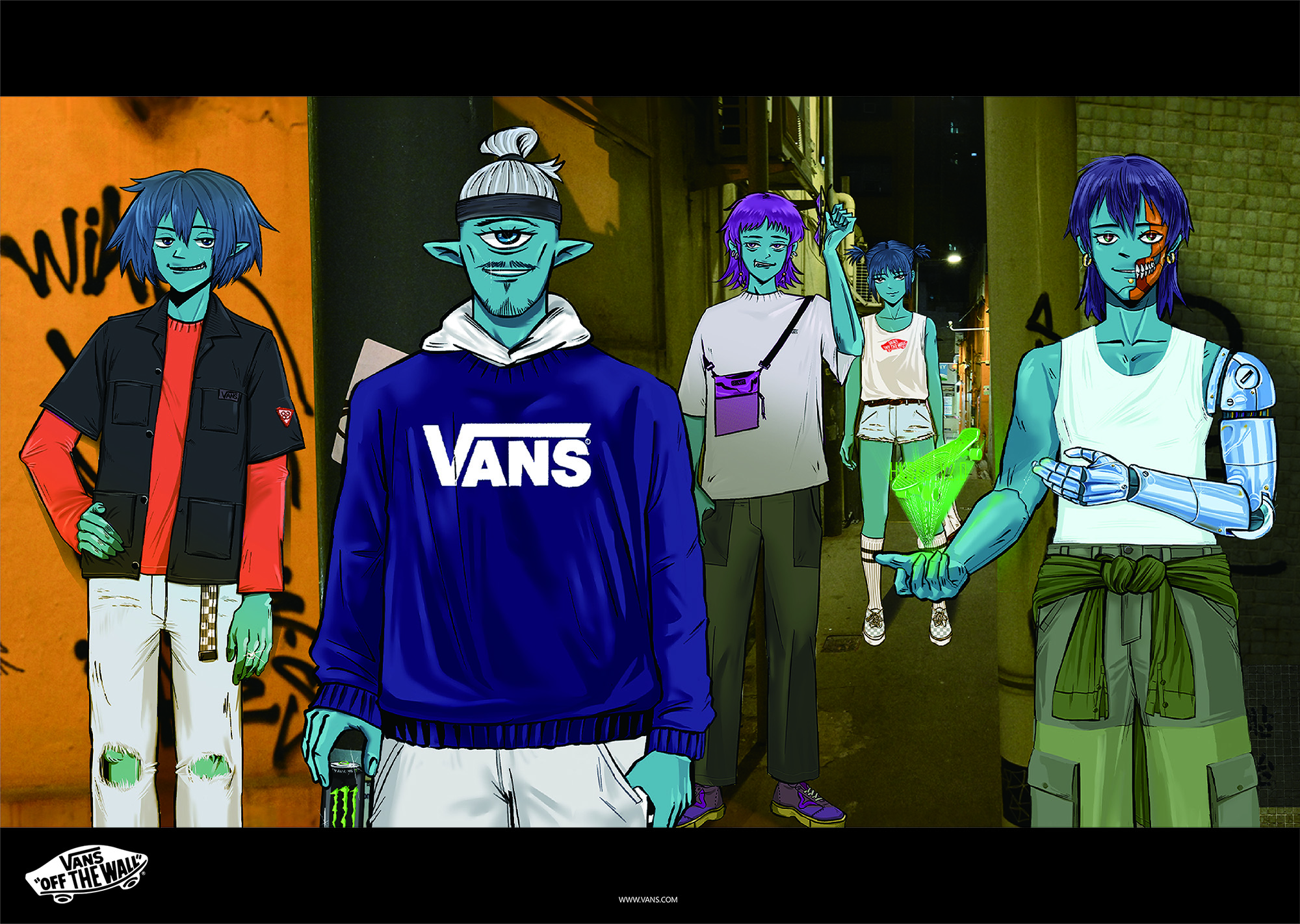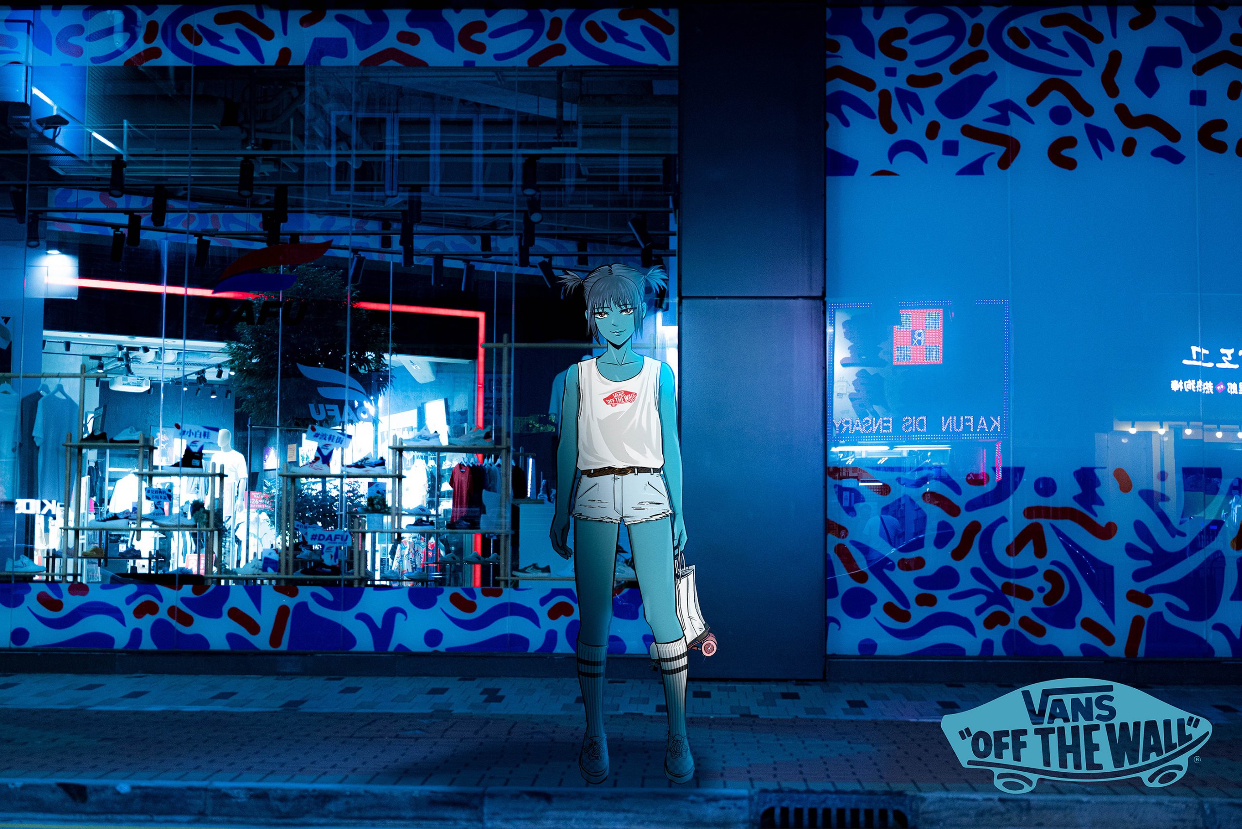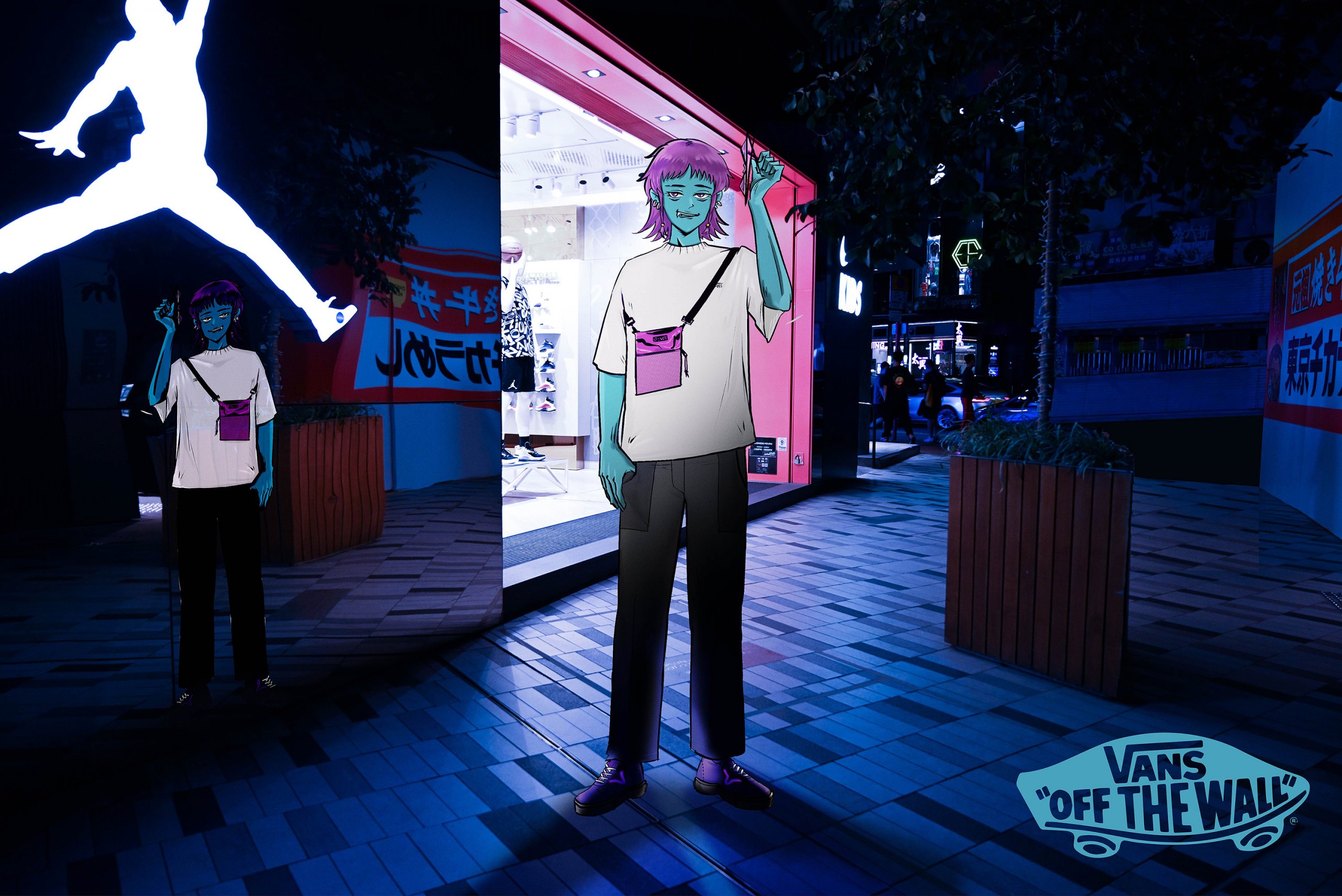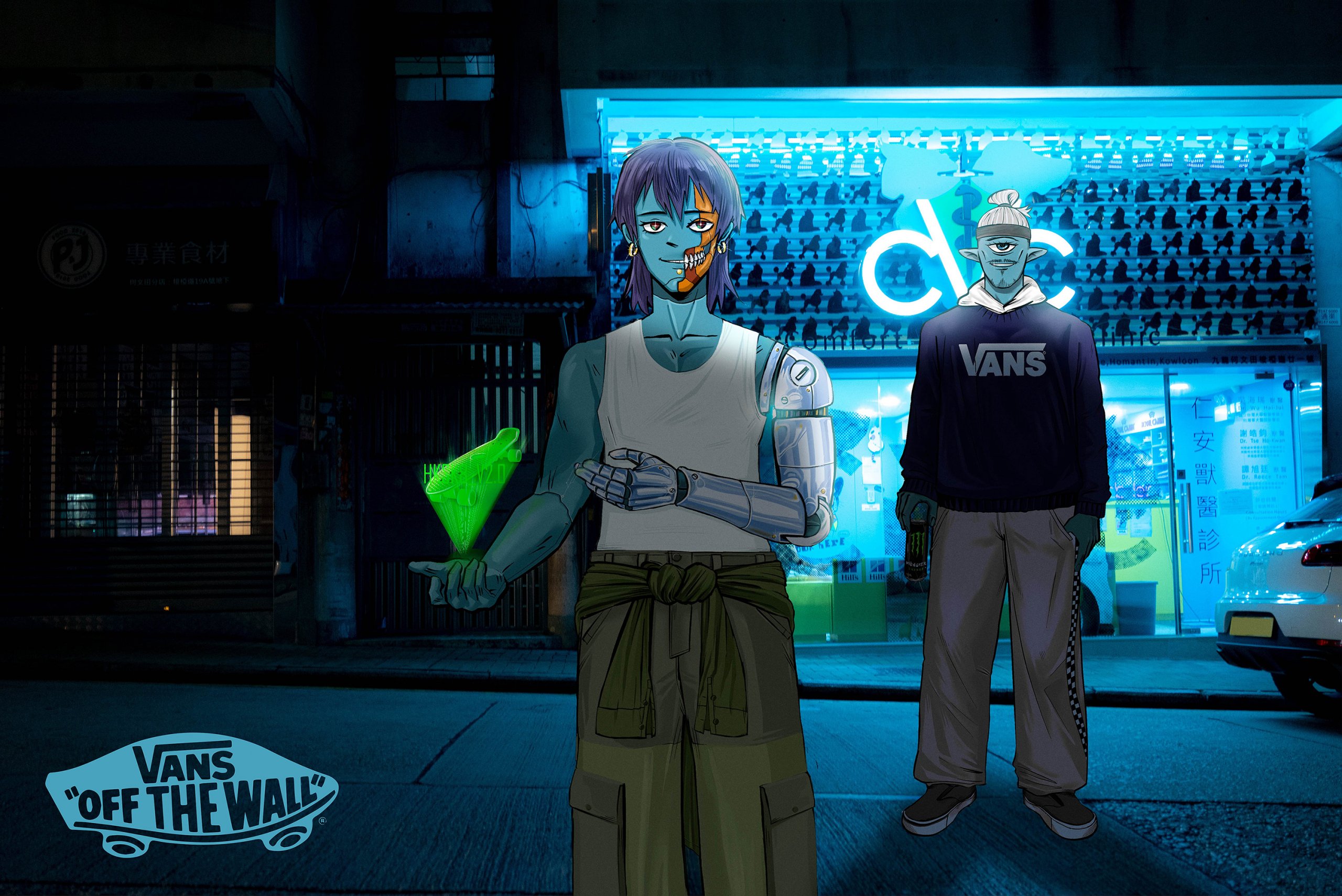 Inspired by the mood of skateboarding with friends and family, the creation originated from the joy of sharing ideas on illustrations during the course, in which Gorillaz inspired me to create a worldview for the characters. An original character is a person who is active at night. While the blue skin expresses the habits of nightlife, the background uses the neon lights of Mong Kok to shape the character's mood.