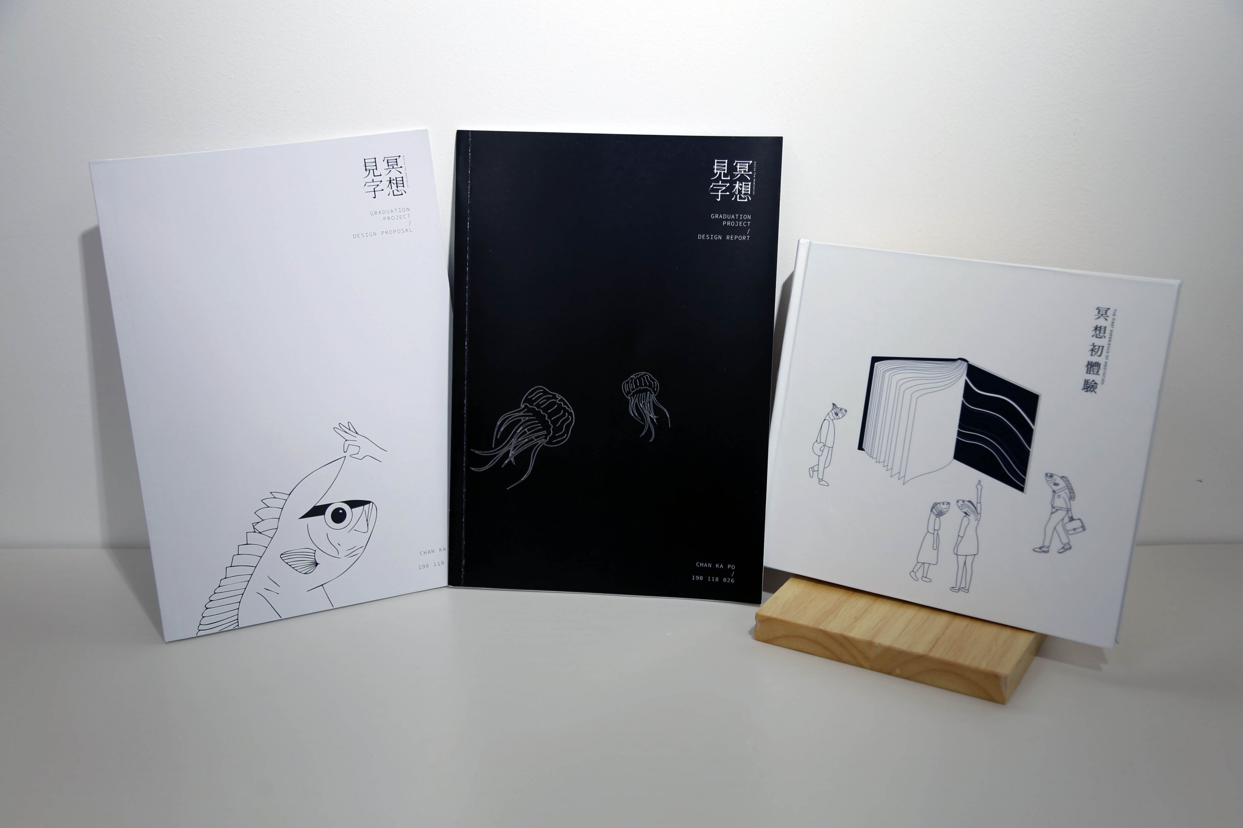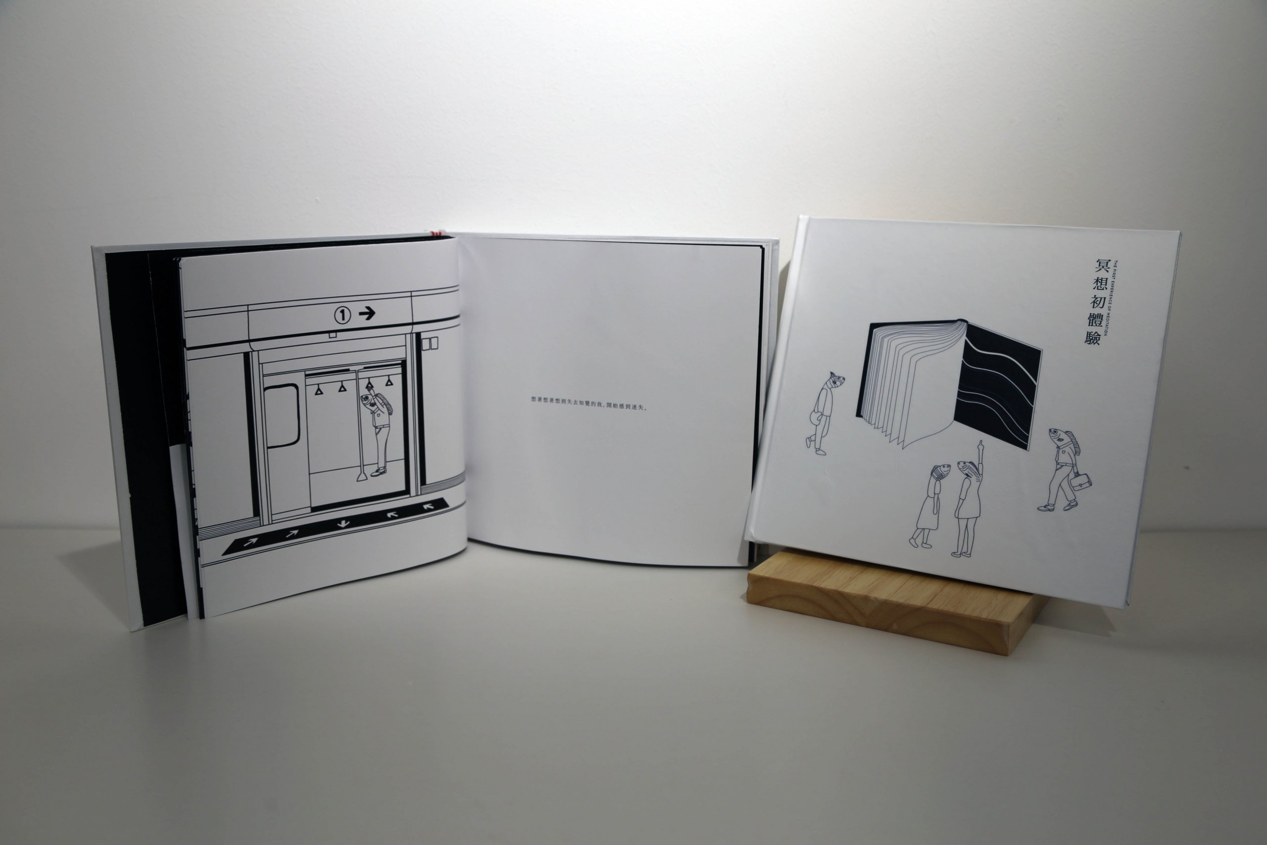 One could barely gasp for breathing in this packed and noisy city. Still, I invite you to imagine yourself as a fish and jump into an ocean of peace. The project uses a fish-man as the character, hoping to echo the theme of this project in a dynamic way. Black and white are used in the guidebook to enable readers to read and understand the contents directly. The guidebook tells the story about the fish-man. A man who loses himself as he is overwhelmed by everyday problems such as career, health issues, love affairs, financial situation as well as social life. As he jumps into the deep ocean and reaches the world of meditation, he can finally rest and be freed from troubles in the reality.