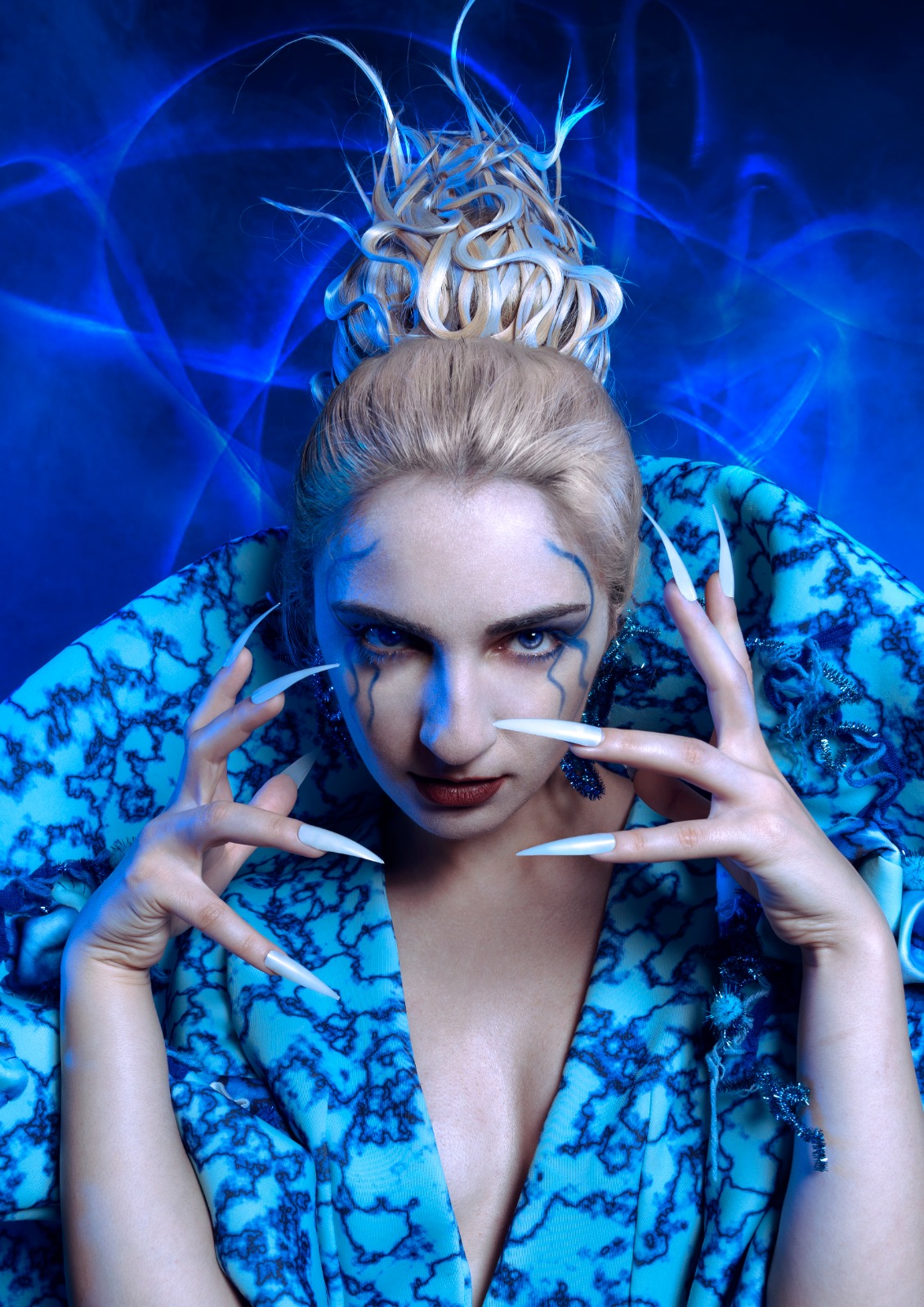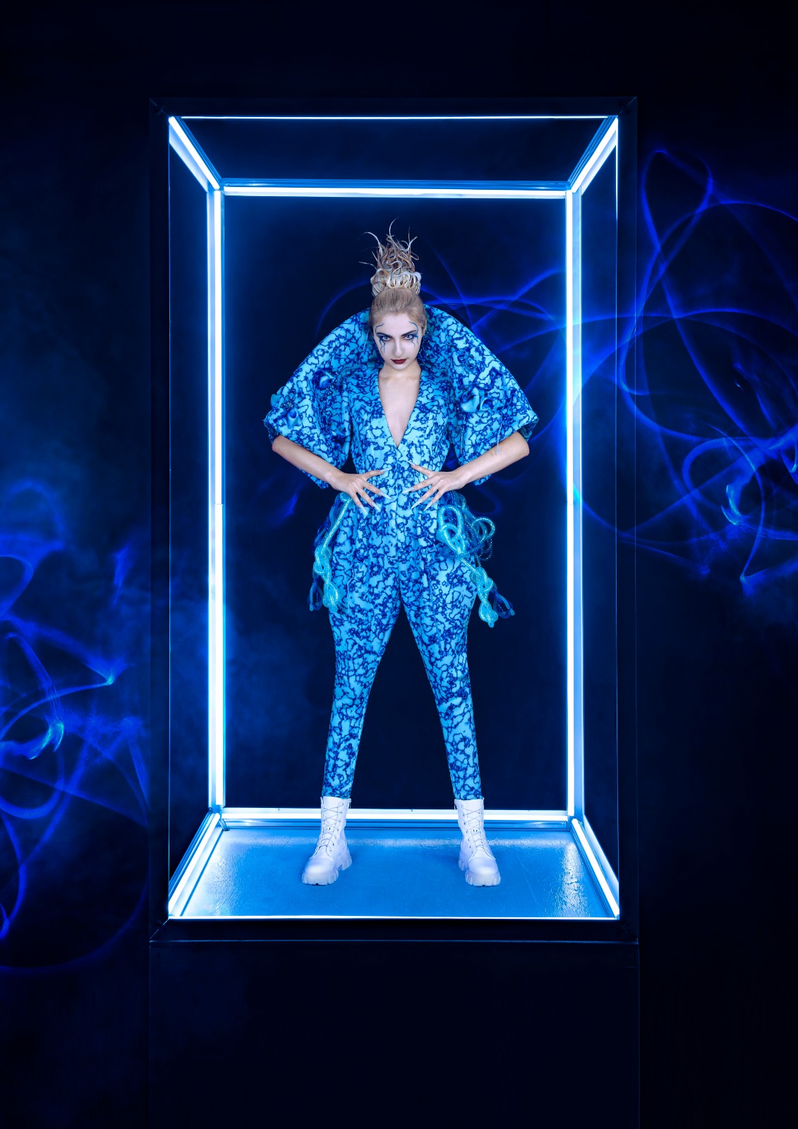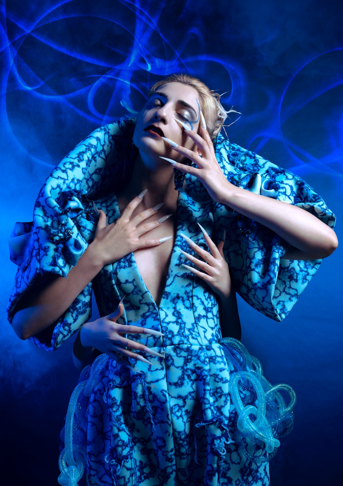 I designed protective clothing for people who want to go to the clubs during the pandemic. Inspired by the image of the virus under the microscope, I created a similar pattern that exaggerated the silhouette of the virus. The design is also an outfit that can be used to wrap the upper body. It reminds people to keep social distance from others.