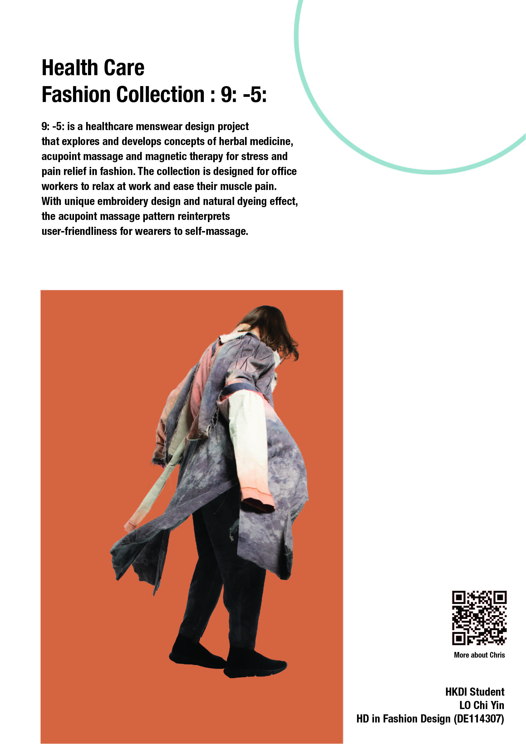 To explore how Chinese Medicine can work with fashion, i.e. healthcare fashion, two outfits and one accessory are designed in this project. Infused with the smart casual aesthetics towards Chinese medicine clothing pursuit, this design conveys a message of relieving muscle pain with the application of massage and acupoint in natural herbal color.