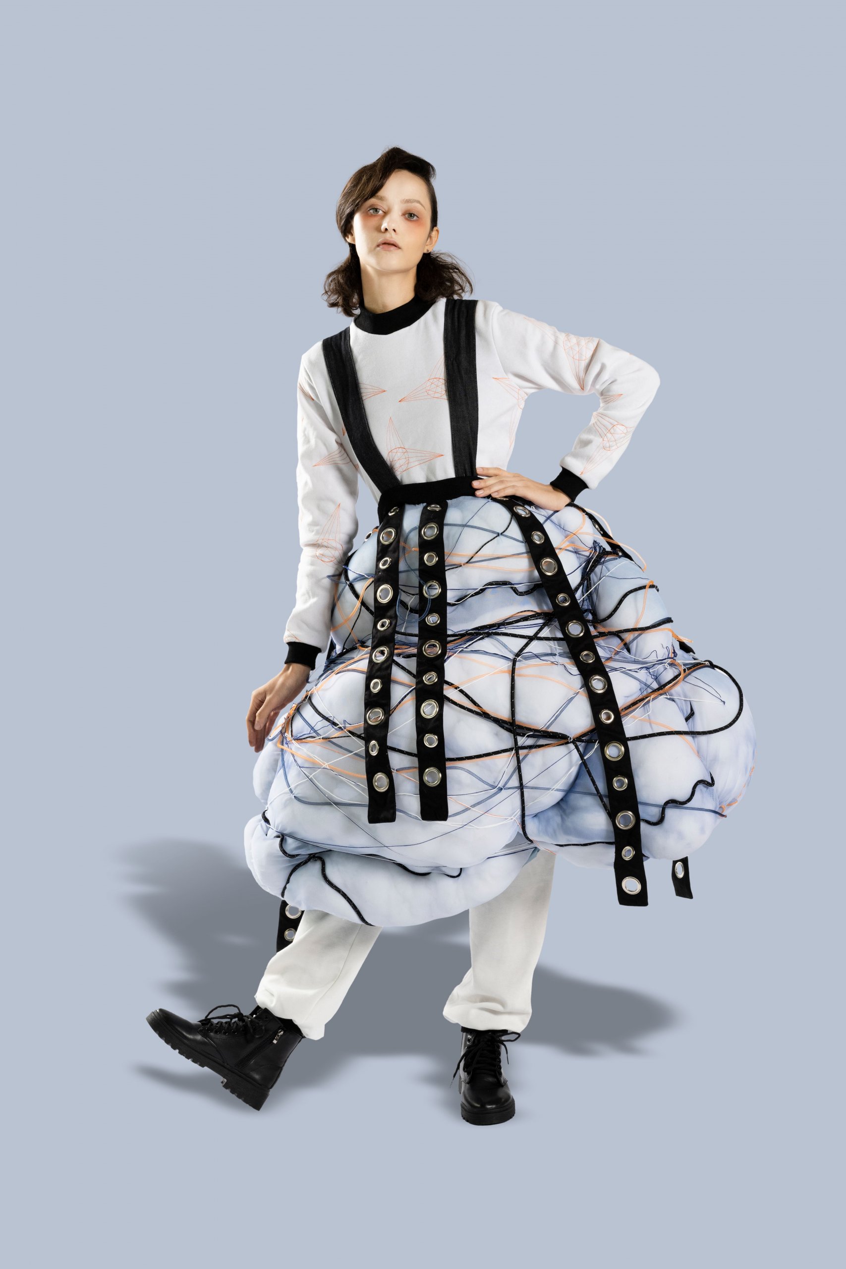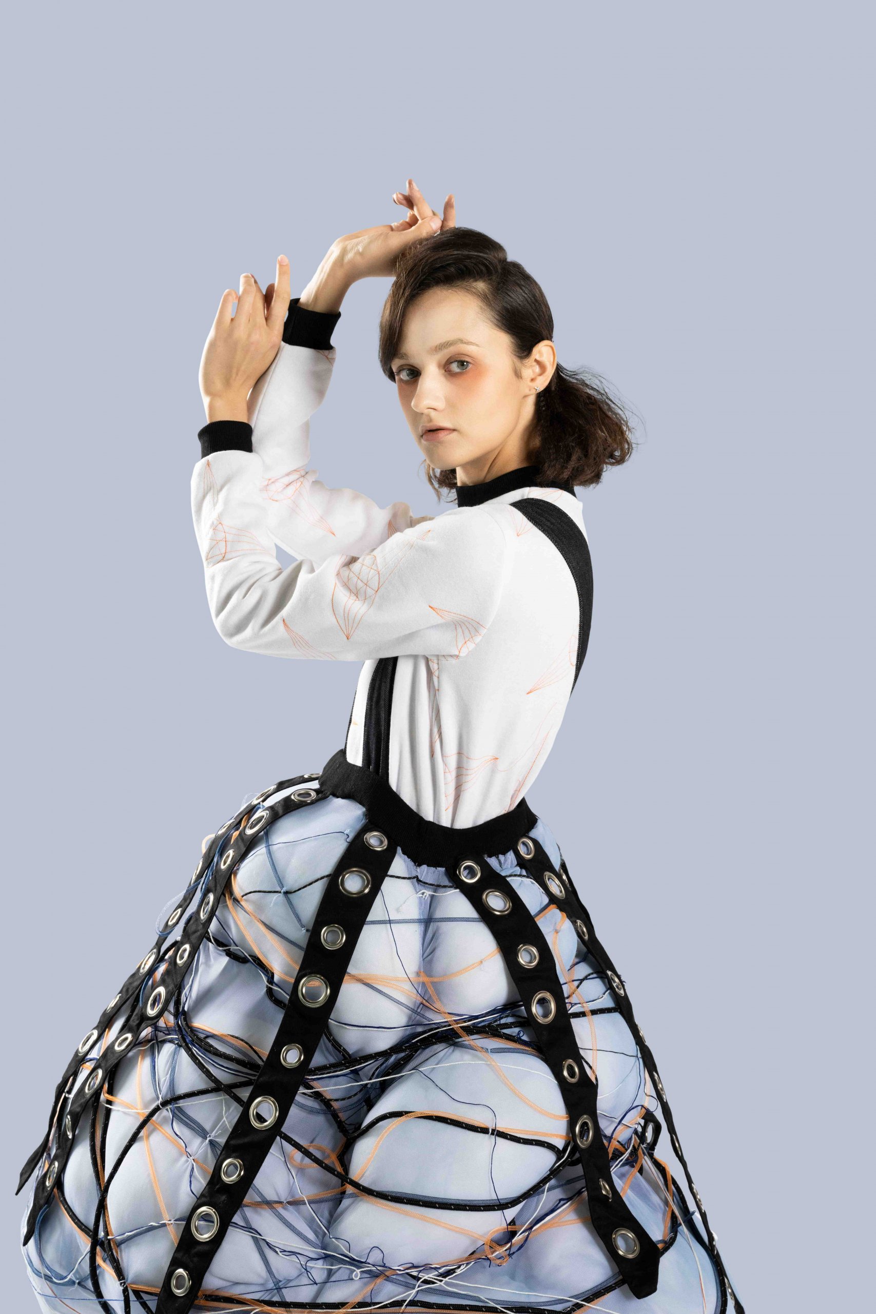 After being inspired by the unspoken rules in our daily lives to create the theme of Restriction, I then did some research and discovered a lot of art pieces that related to this theme. Finally, I took reference from tying objects and tension to design my collection. My theme is Restriction, and my concept is to advocate fighting against the unreasonable rules in our lives. I want the audience to feel the pressure given by these unspoken rules every day. Therefore, tying and crowded embroidery are used to emphasize this feeling. Through the design, I hope the audience can sense the oppression from these unreasonable rules.