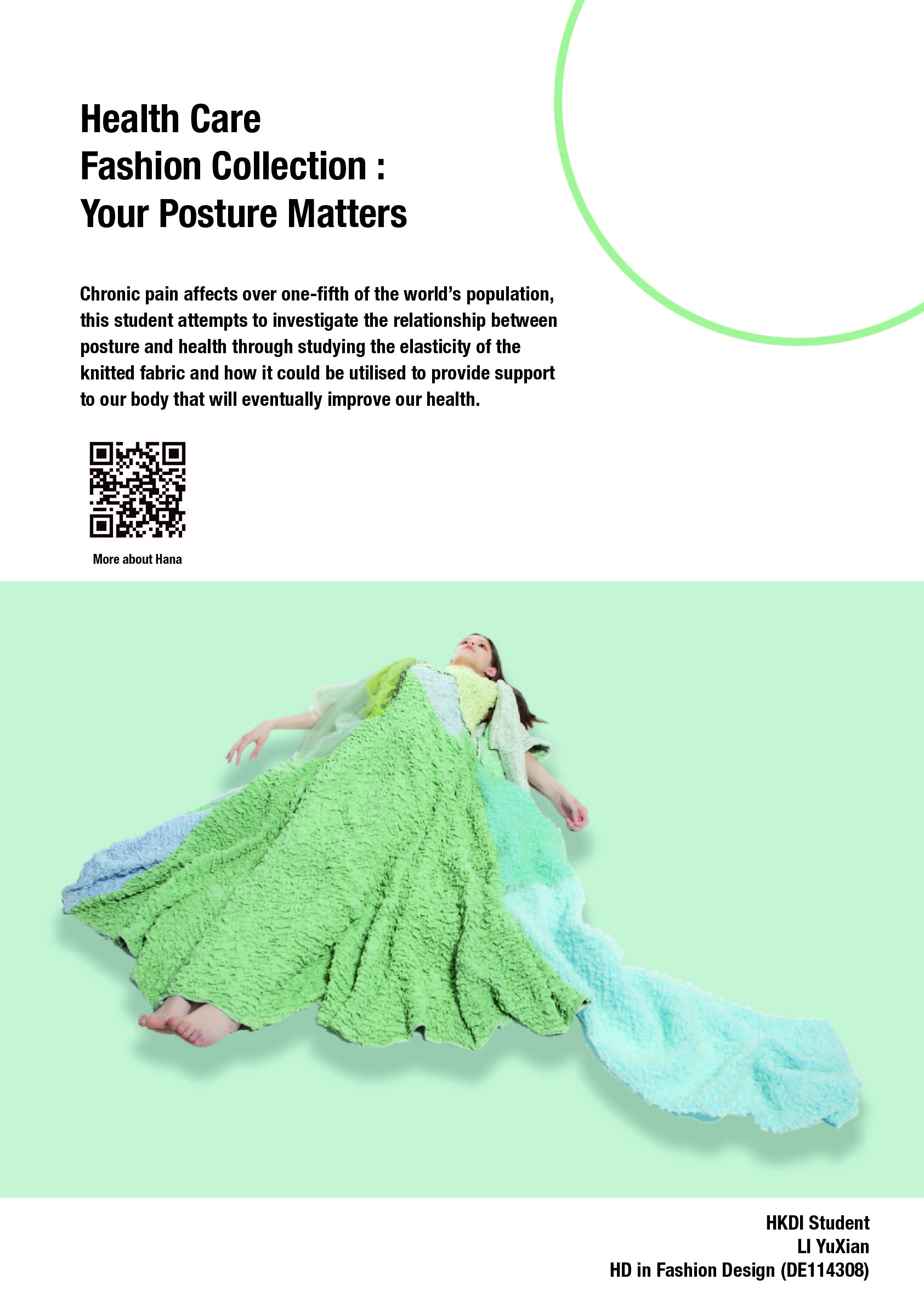 The techniques and knowledge that I have acquired as a knitwear design student at HKDI have raised my interest in studying the stretchability of the knitted fabrics and how this kind of materials can be used to provide support for the body and eventually improve our overall health.