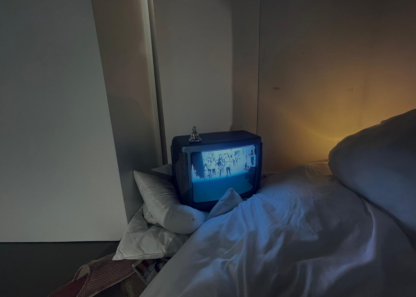 2021 Installation Art Video Installation Film, Fishing wire, Crayon, Buddha statue, Cotton, Drawing paper Video 1 duration: 15 min 12s (TV playback) H 230cm x W 230cm x D 200cm
