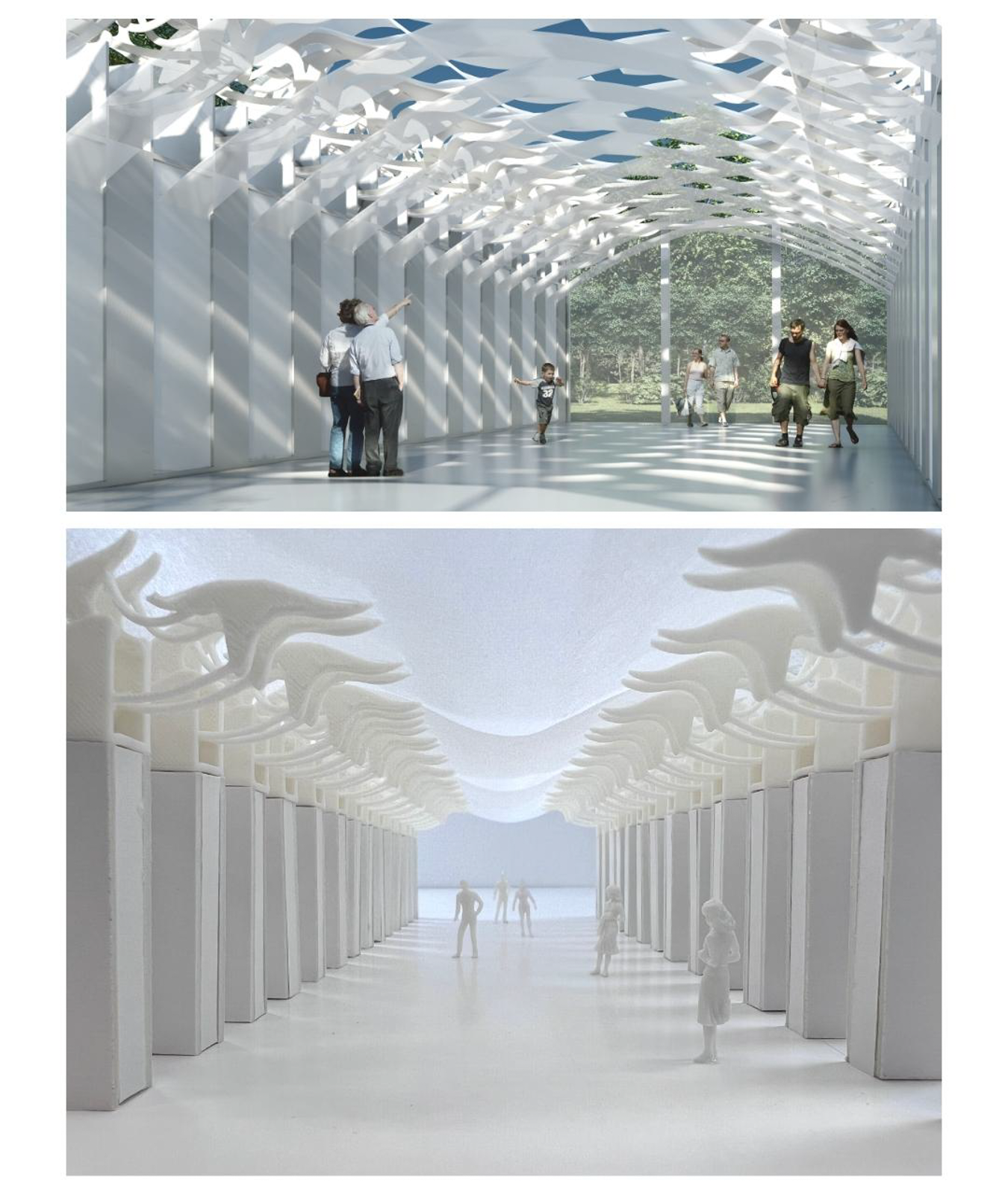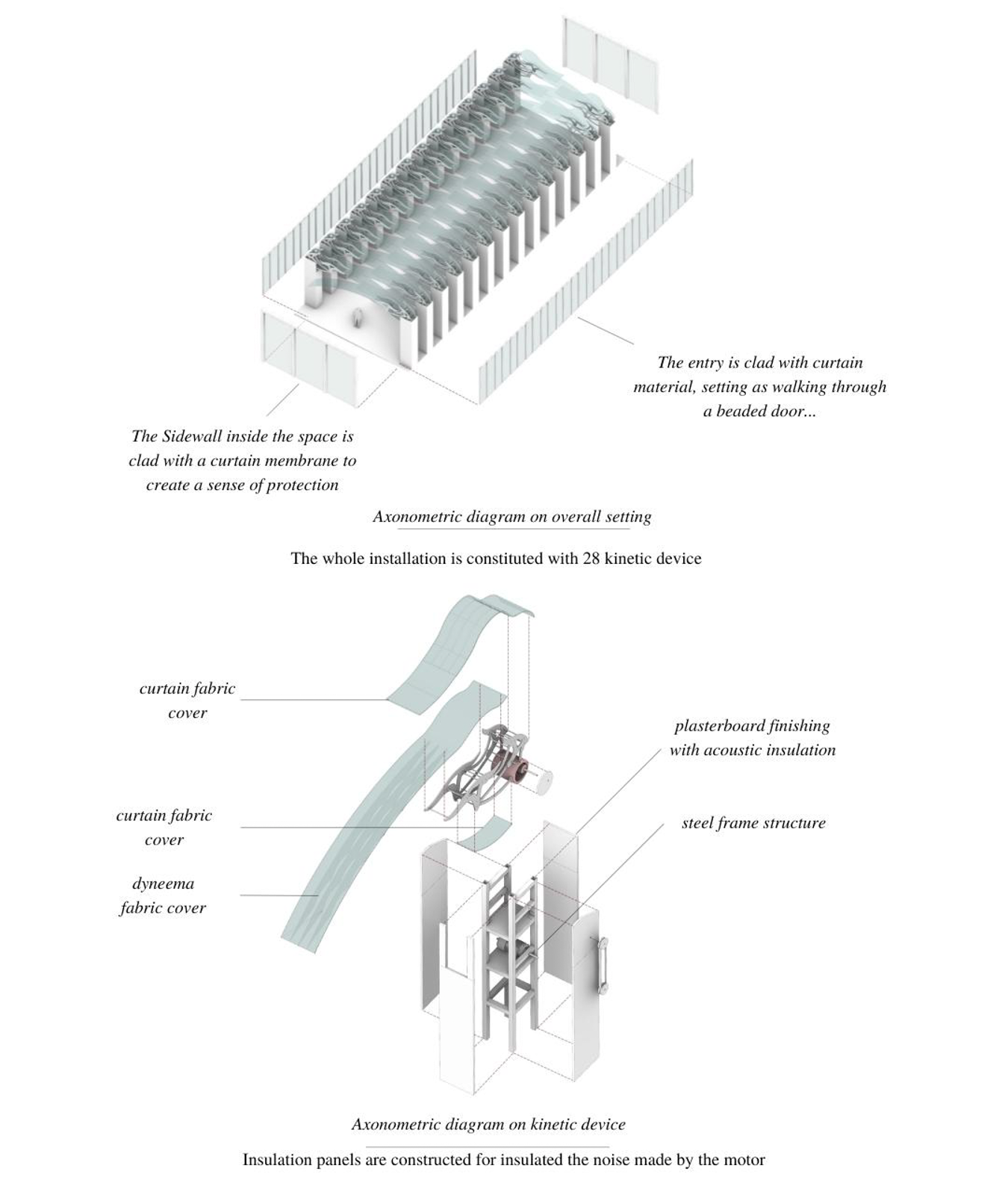 The concept of “Hugging” was inspired by a dream. It is a movable gate covered with a layer of transparent fabric. The mechanical device will swing up once the sensors have detect some motions. People walking underneath will feel a sense of protection as the ambient noise and distraction will be isolated. Your mind starts to stand out, creating a moment that is out of touch with reality. It can heal, empower, and soothe your mind from the inside.