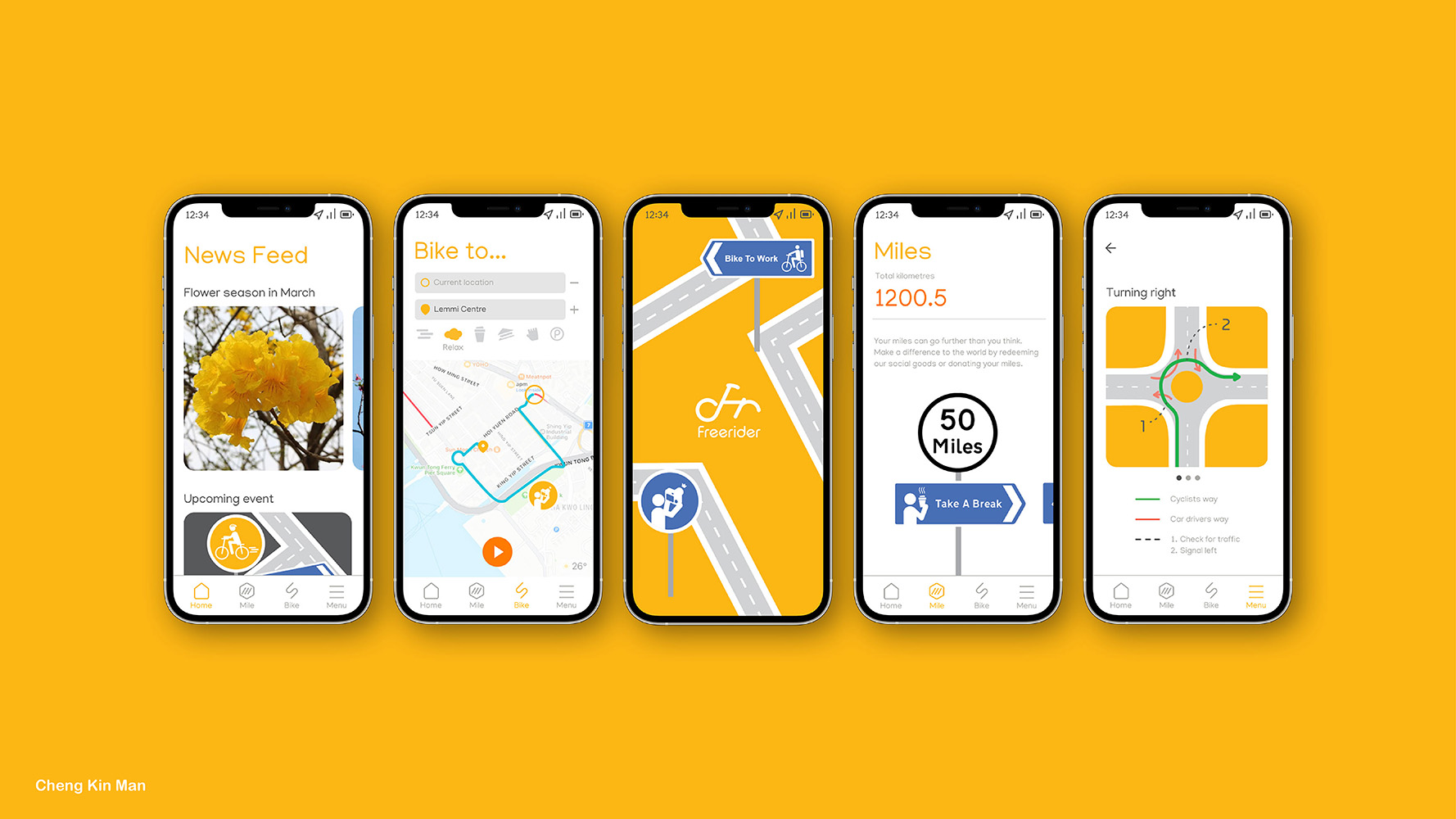 The Freerider app aims to encourage users to bike to work safely. There are flexible routes to help them find nearby locations and additional options. Additionally, riding miles can be redeemed for coupons or donations.