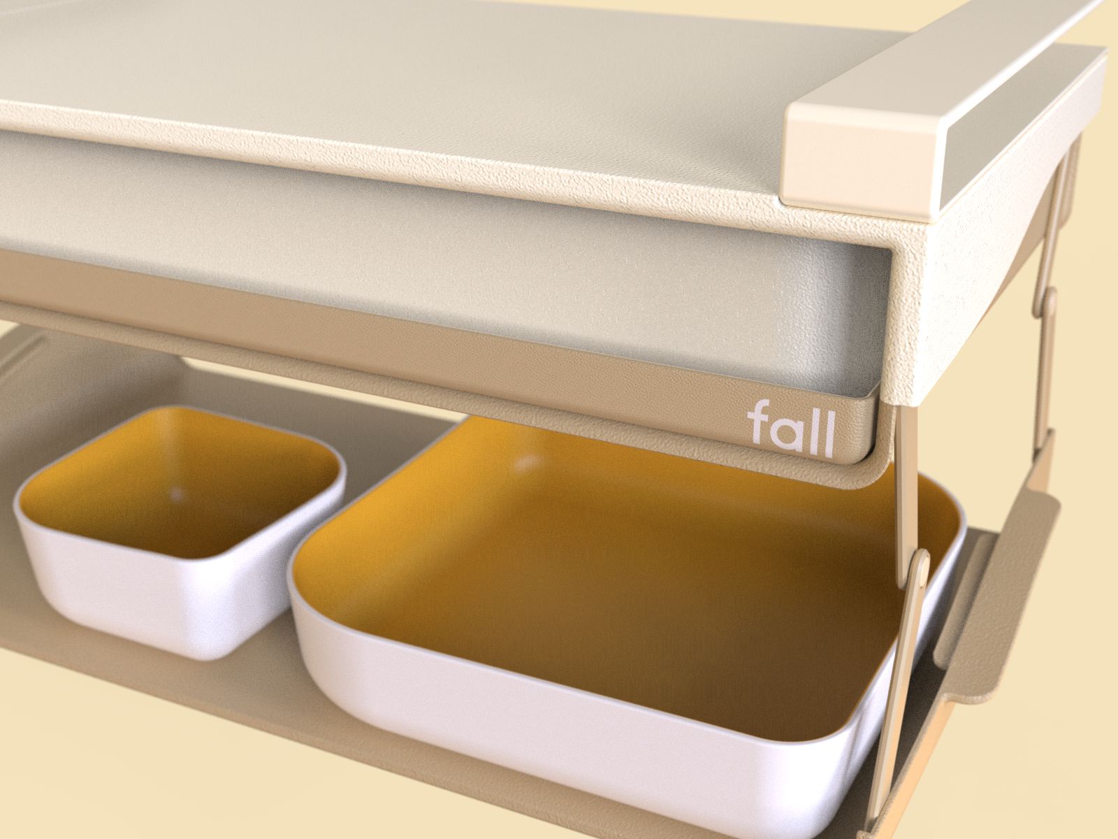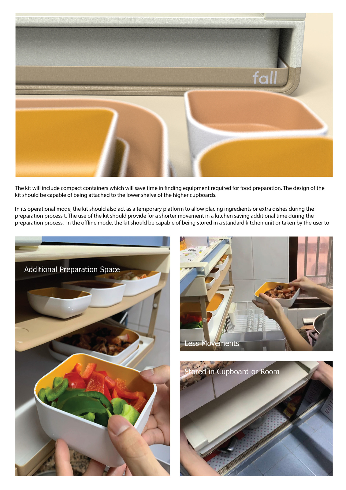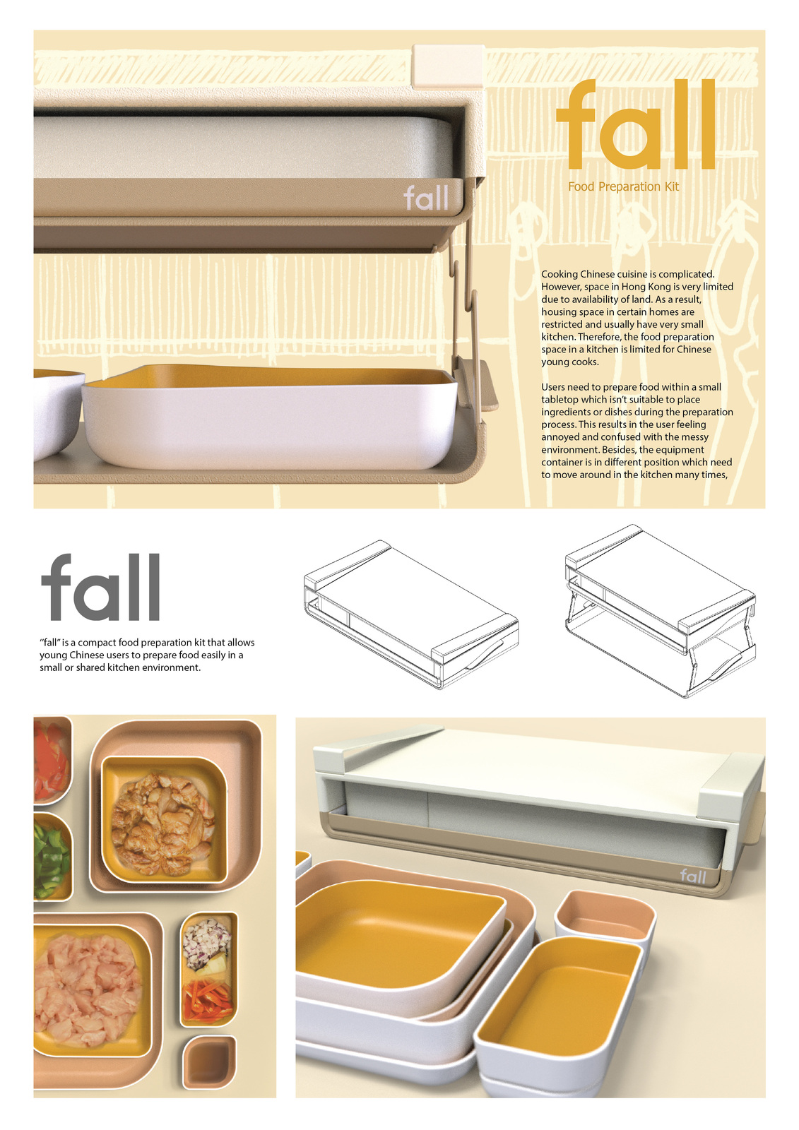 ‘’fall’’ is a compact food preparation kit that allows novice Chinese cooks to prepare food easily in a small or shared kitchen environment. The kit includes compact containers that save time for the users to find the equipment. It can be placed on the counter of the kitchen or attached to the lower shelve of the higher cupboards. During use, the kit also serves as a temporary platform for placing ingredients or dishes, thereby creating more space for food preparation while providing more convenience. In the offline mode, the kit can be stored in a standard kitchen or anywhere you want