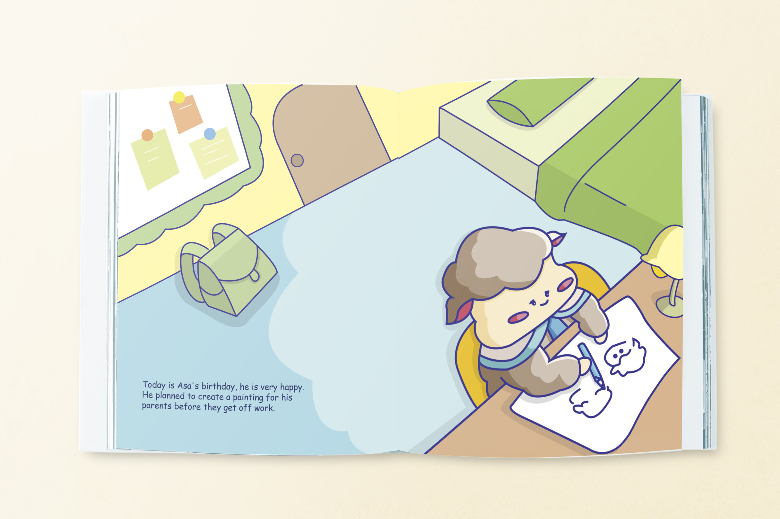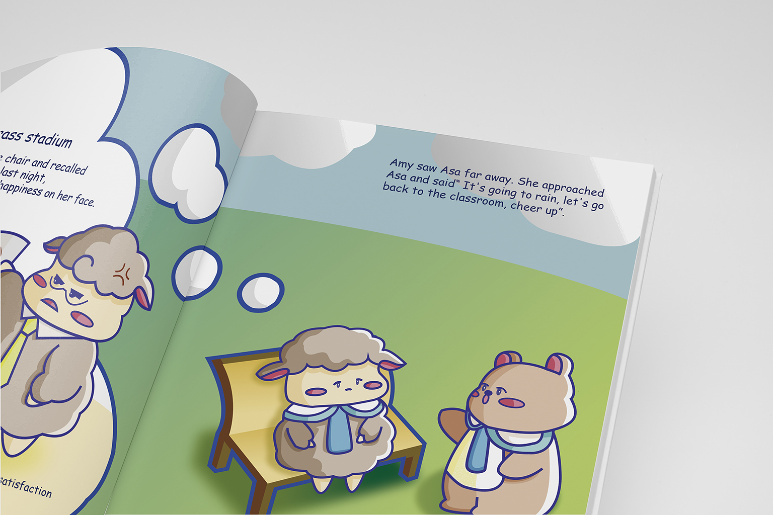 The story is about Asa's poor performance in school and her anxiety due to improper parenting and parental negligence. Sheep is chosen as the character of Asa because of its timid image. Simple line drawing in bright colours is used to make the picture book more reader-friendly for children.