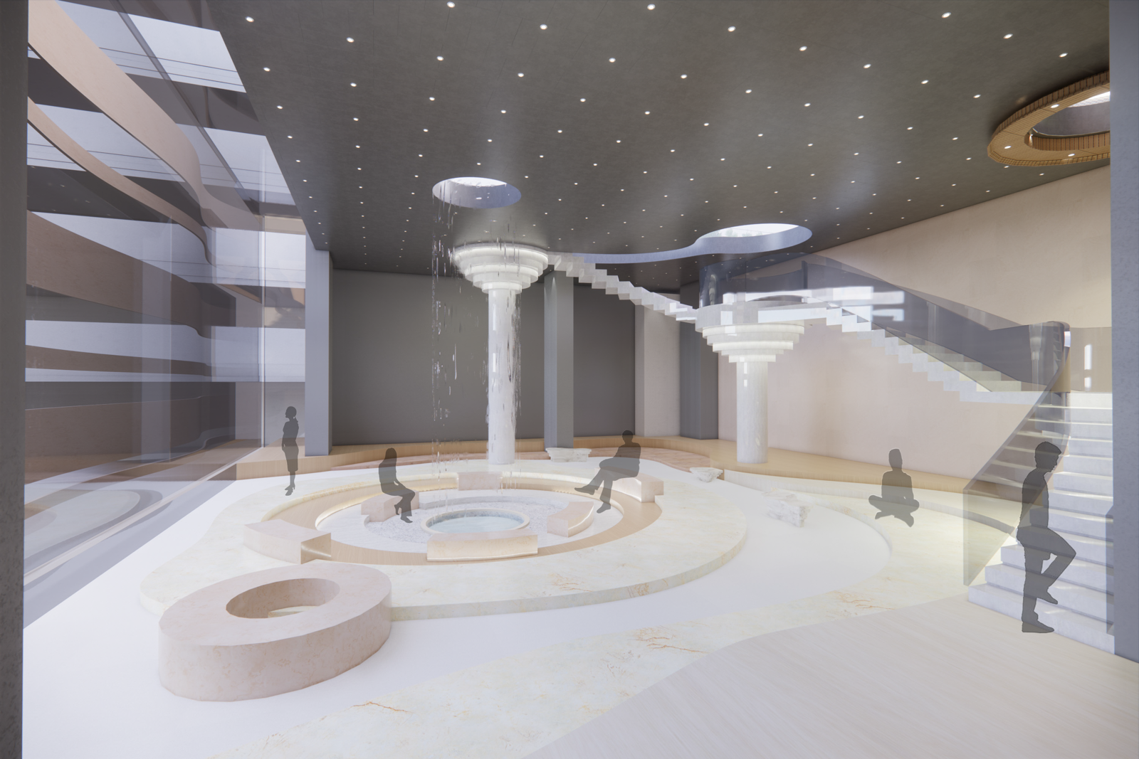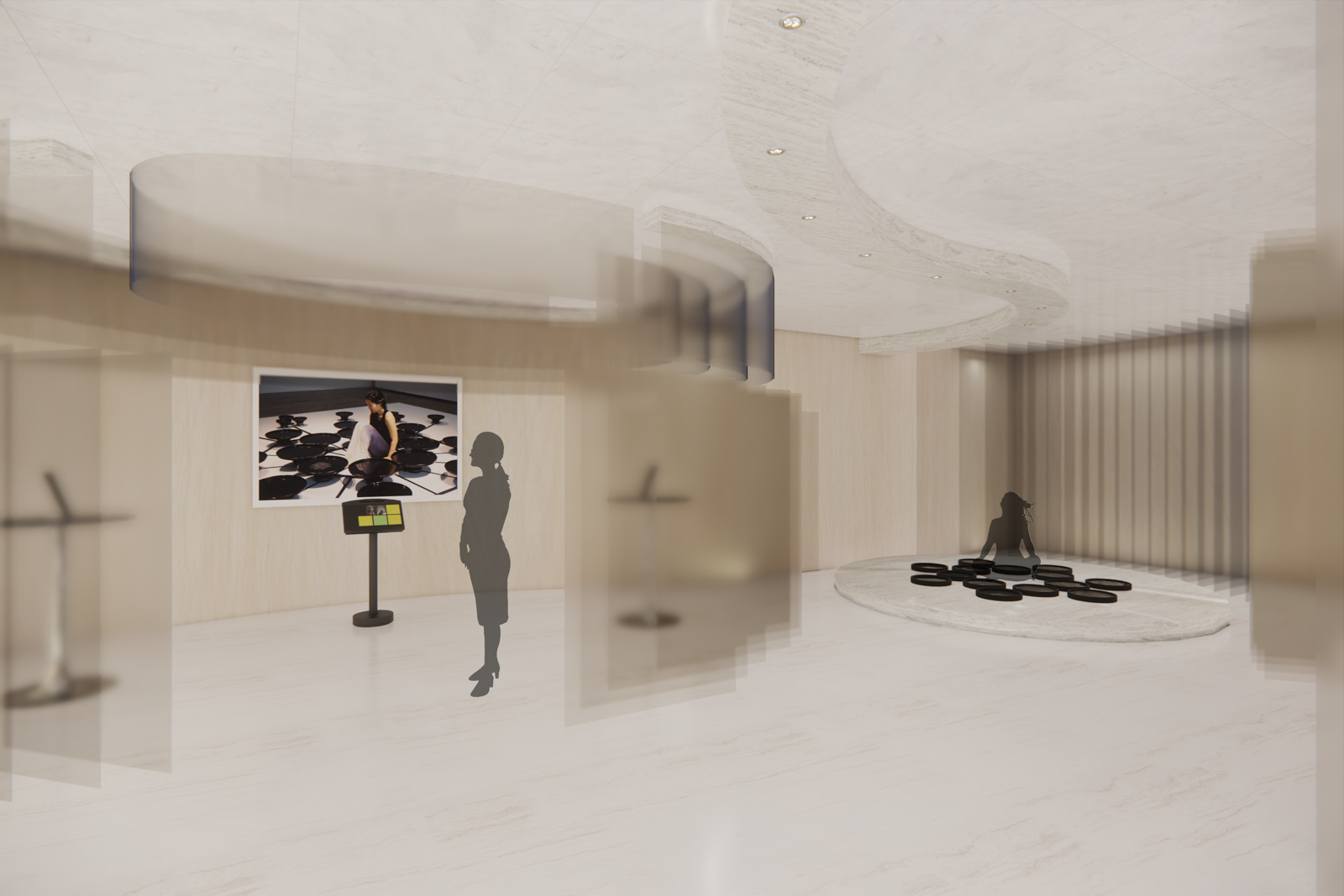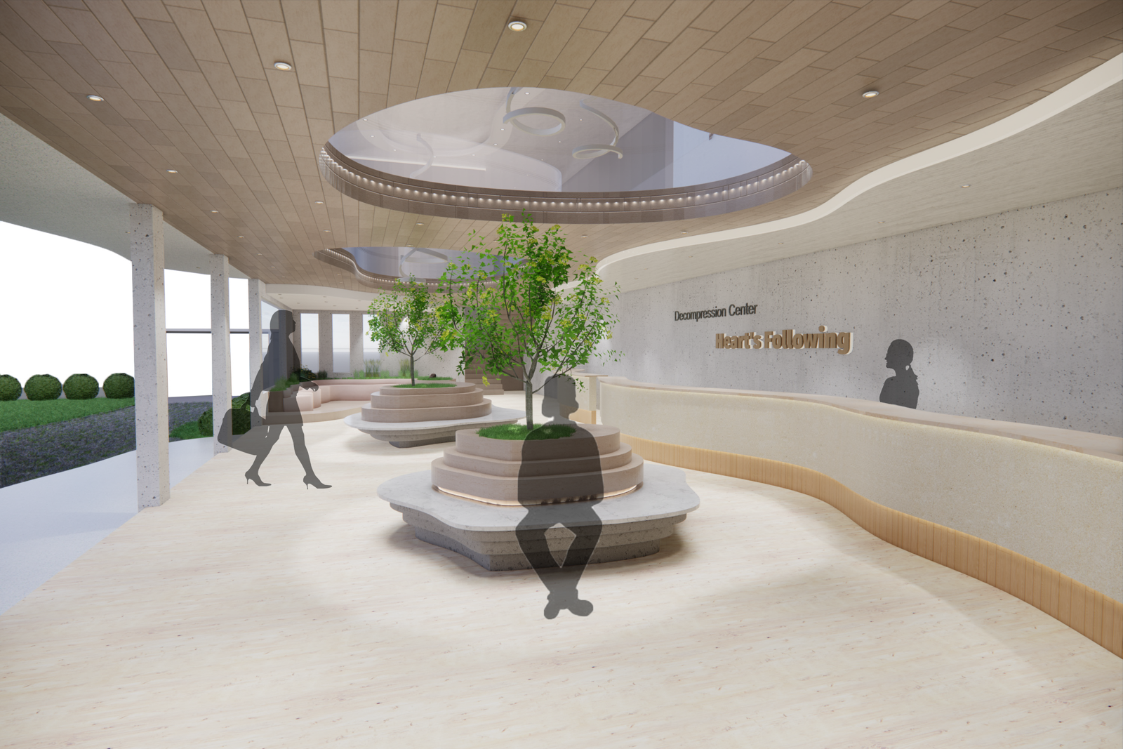An indoor space is created for relaxation and alleviating pressure, where people can relax, retreat from the hustle and bustle, and relieve their pressure. Meanwhile, the people's perception of their senses can be strengthened as they put aside other distracting thoughts and calm their mind down.