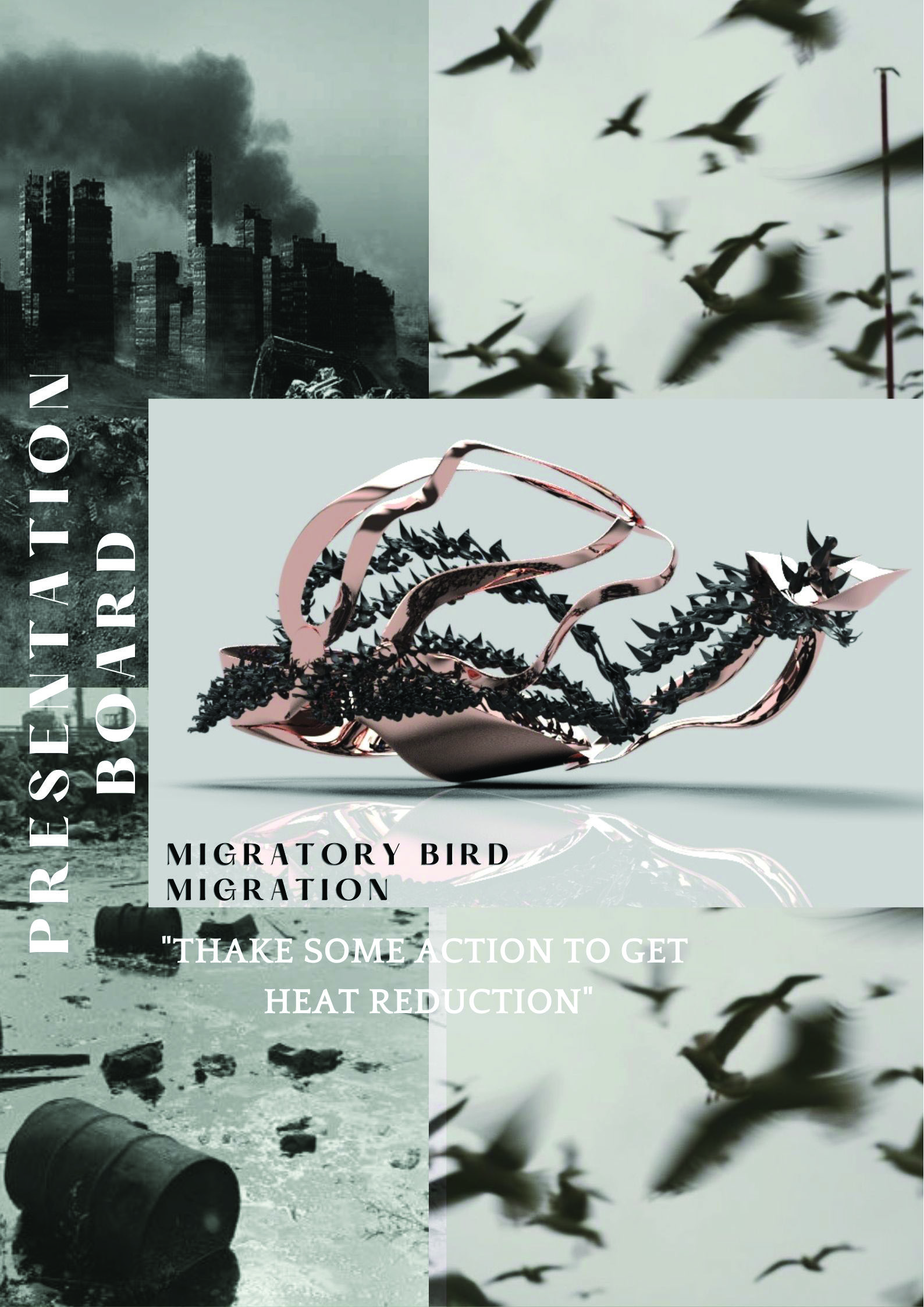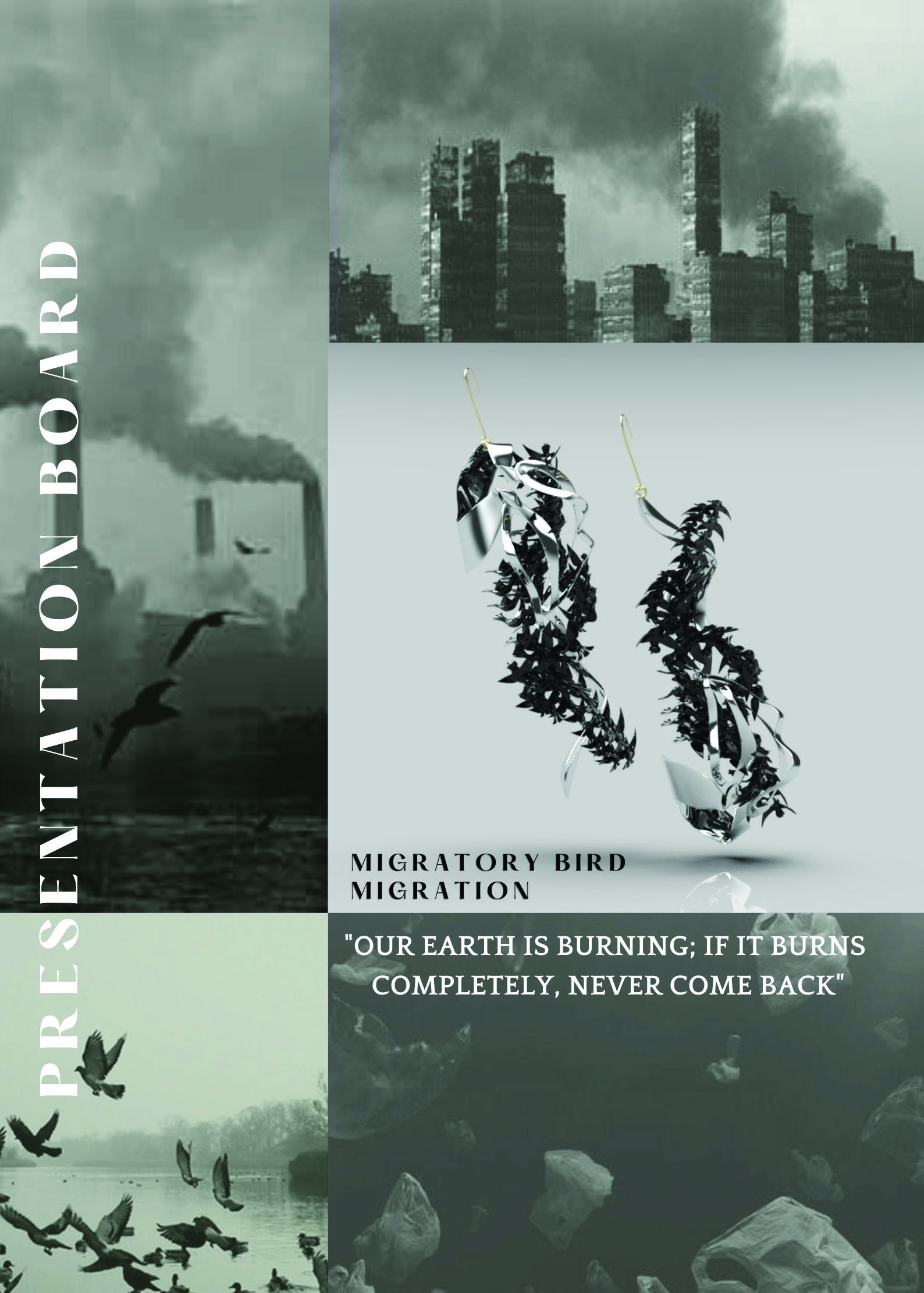 I used “Migratory Bird“ and “Migratory Bird Route Map“ as the theme. The combination of Migratory Bird and Migratory Bird route map brings out the problems of global warming. In addition, “Migratory Bird stained with carbon dioxide“ uses the colour from black to white express the pollution and how it has affected the migratory birds. Through the metalwork process, I will express the severity of environmental pollution and reflect the idea through jewellery items that I designed.