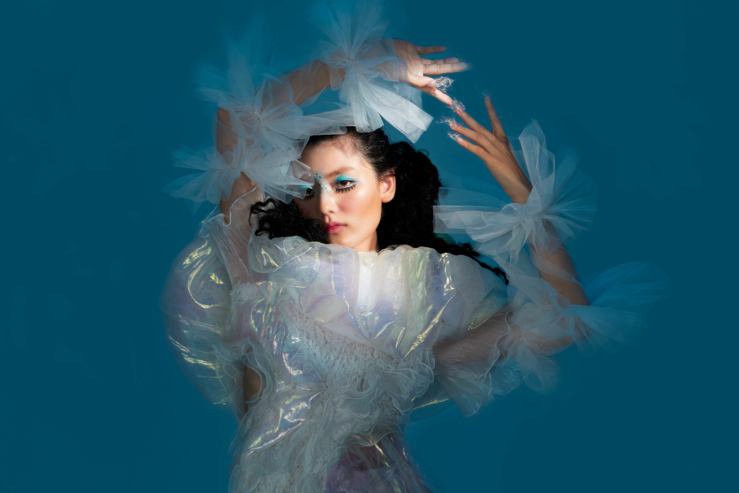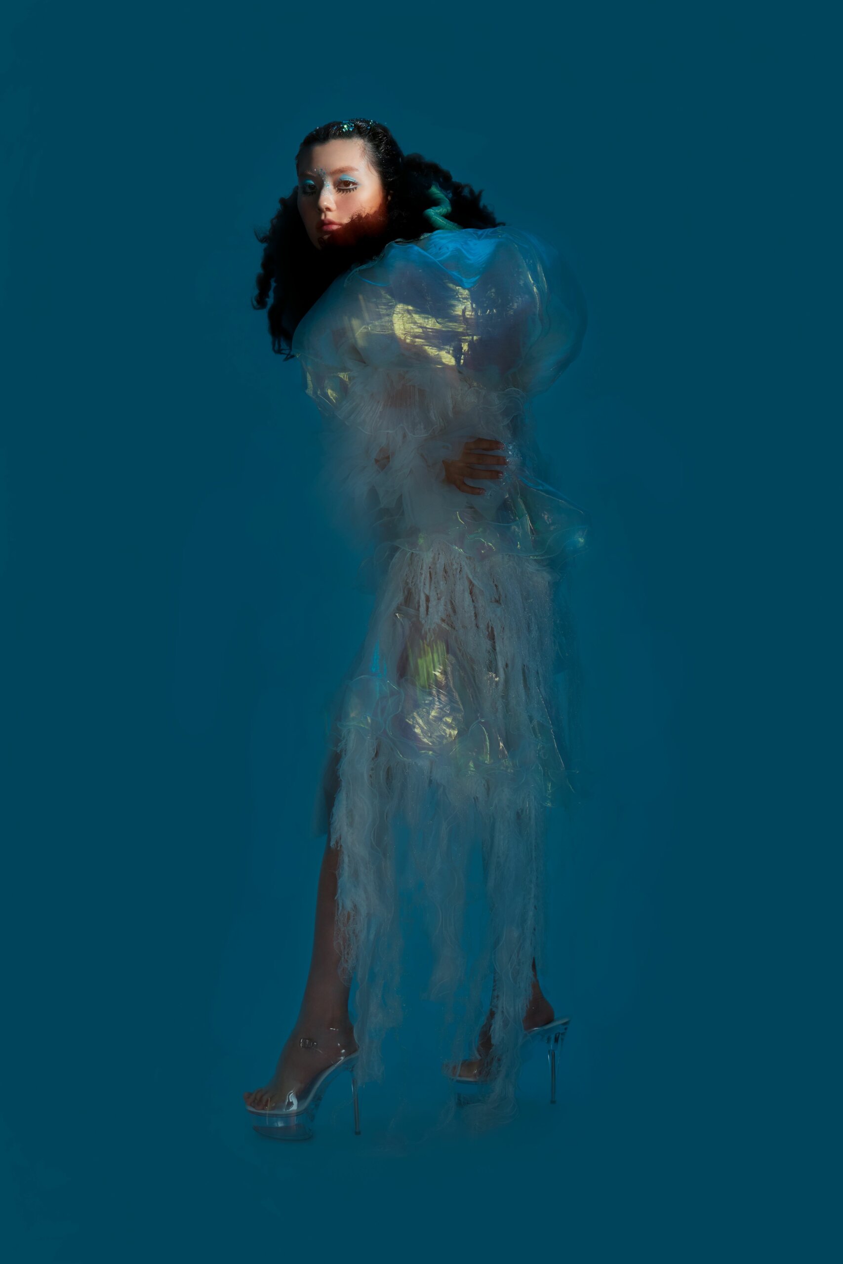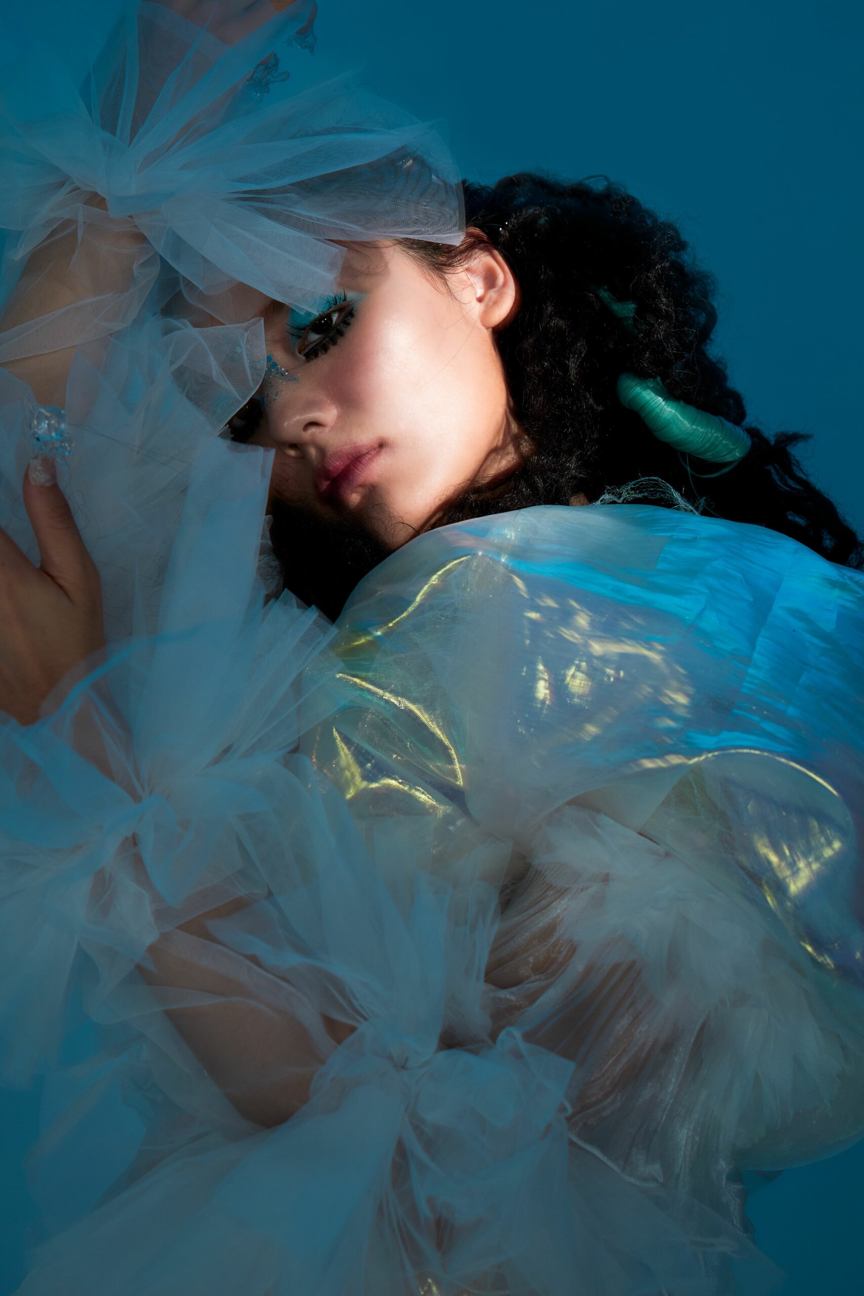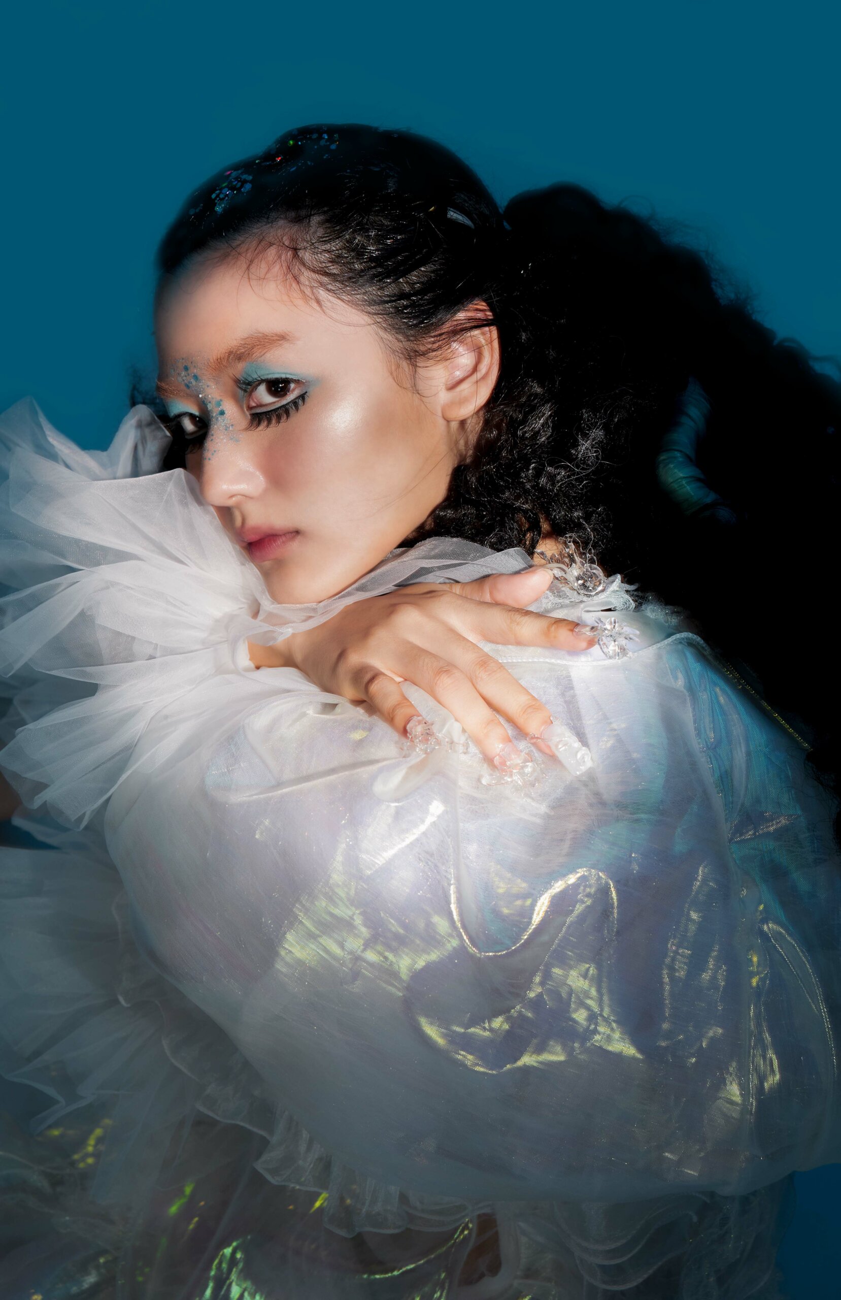 The jellyfish when swimming in the sea, it takes on the colours around it. Hence, I’m going to put the changing colours of jellyfish into my work. The main colour used is achromatic colour such as lucent, which symbolizes emptiness and nature. This expresses the immortality of jellyfish and integrates it into a seemingly infinite cycle of immortality. We wanted to express the feeling of mystery, we chose to use blue as an important colour for the whole theme, for the mysterious colour of blue can make people feel depressed. For the makeup, I took some pictures of real mermaids and used some skeletal textures on their bodies and faces to complete the shape of my entire makeup. For the hairstyling, I used a more explosive feeling to create the feeling of seagrass drifting in the deep sea.