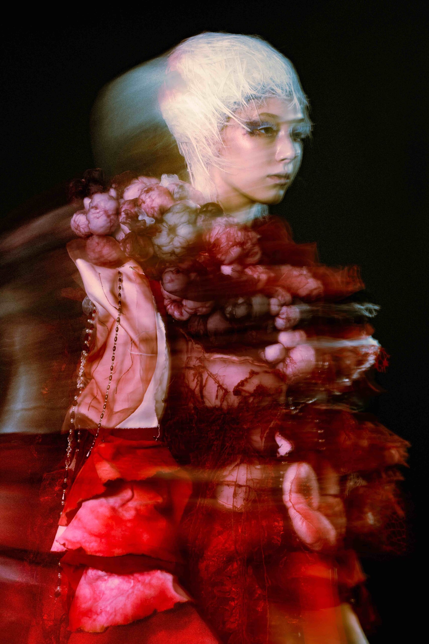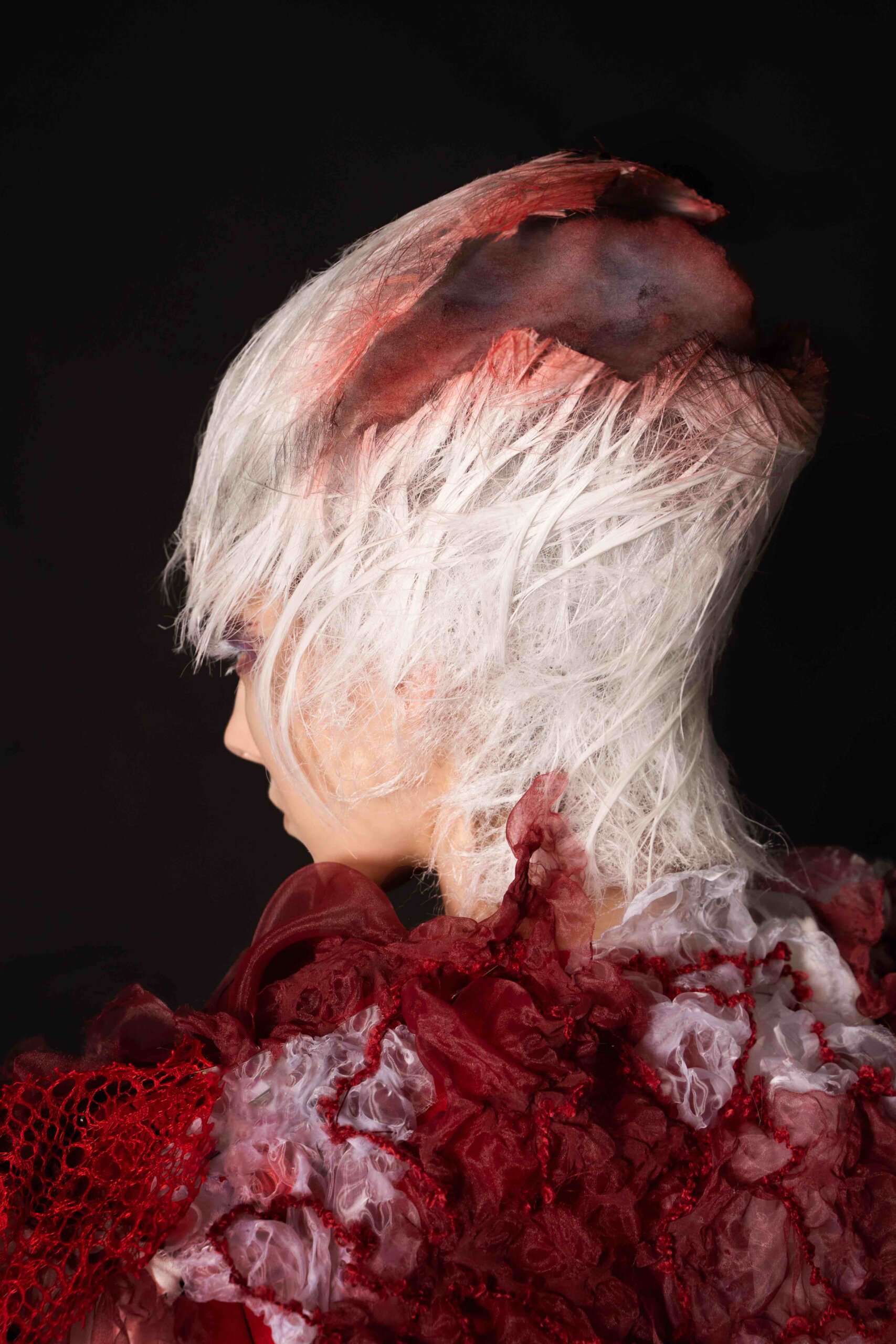 Abstract expressionism is always the best way to visualize an intangible feeling. Therefore, water colour is the main element of my makeup design. For the hairstyle, I will present the main idea through deconstructionism. Meanwhile, I chose blood and cells as my design concept, because nowadays many people pursue different worldly objects such as fame, wealth, and other unnecessary worldly materials and have totally forgotten about the most important things that maintain life. Therefore, I use blood and cell to present my design and remind people to reflect and think about what they really need.