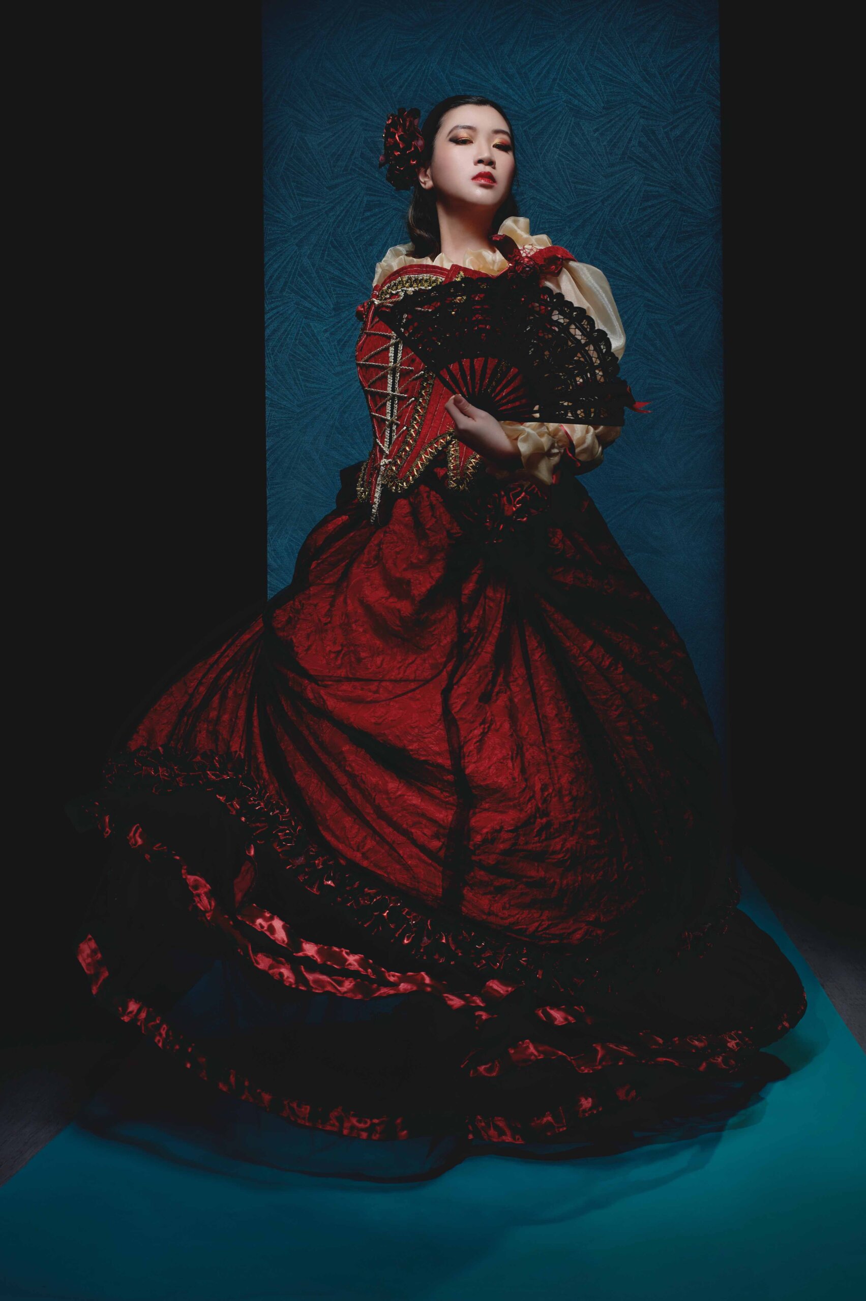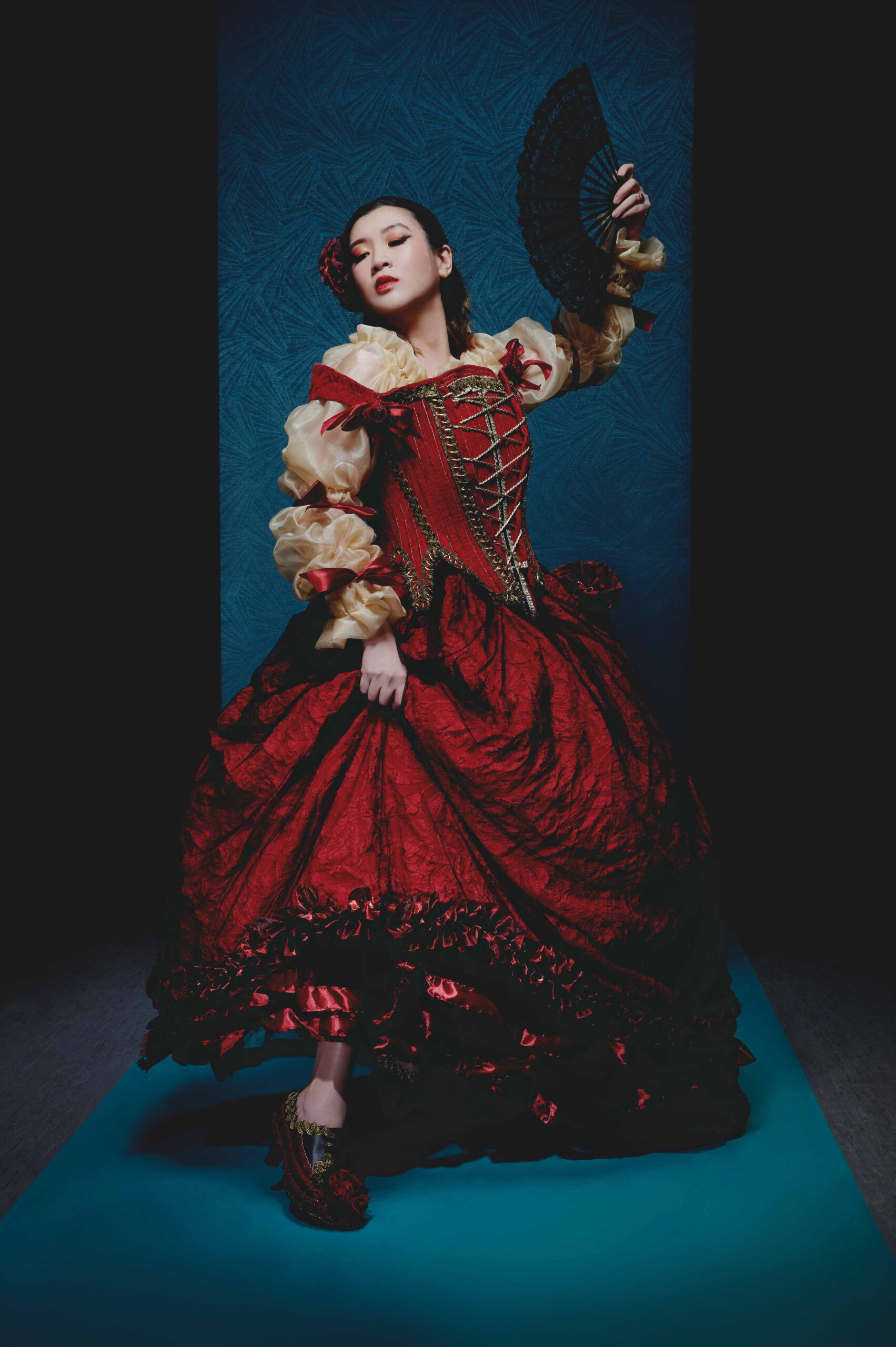 With red, gold, and black as the main colours, Carmen wears a 16-17th century corset. While the concept of roses is applied to her lower body, the skirt is decorated with layers of roses, representing the girl’s flamboyance wherever she goes. A layer of black lace is added on top to resemble the spreading smoke and dust in her work environment.